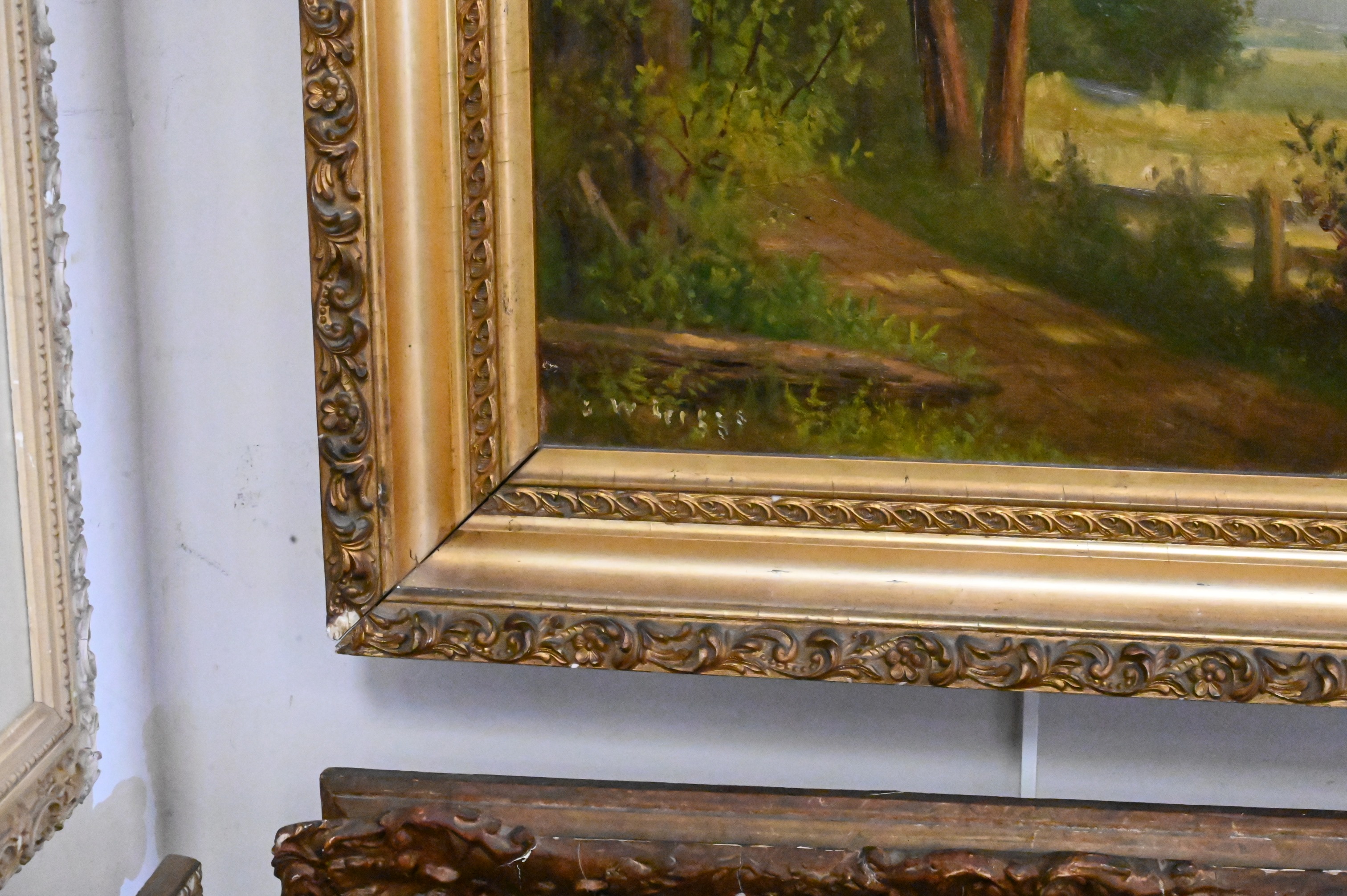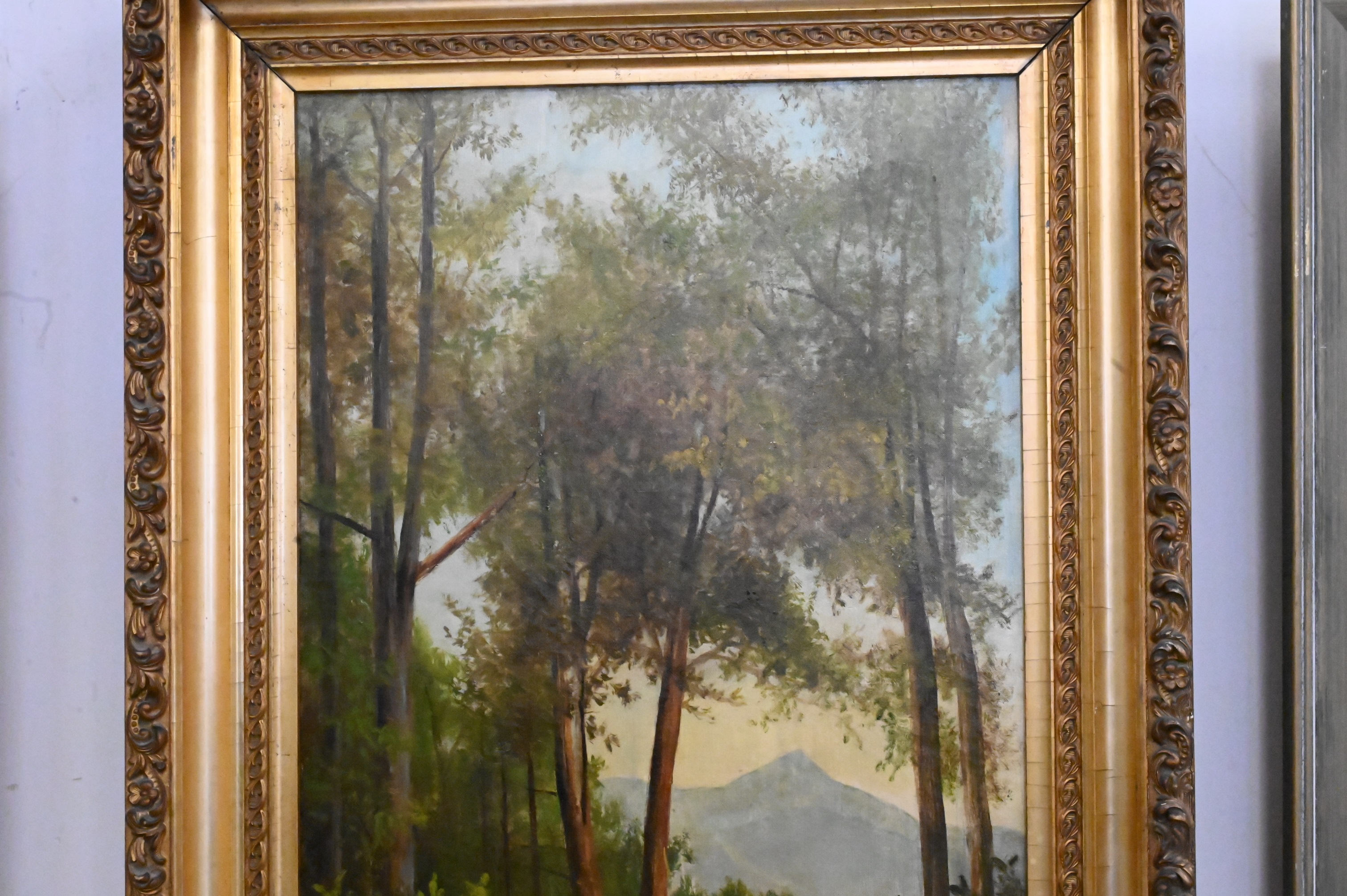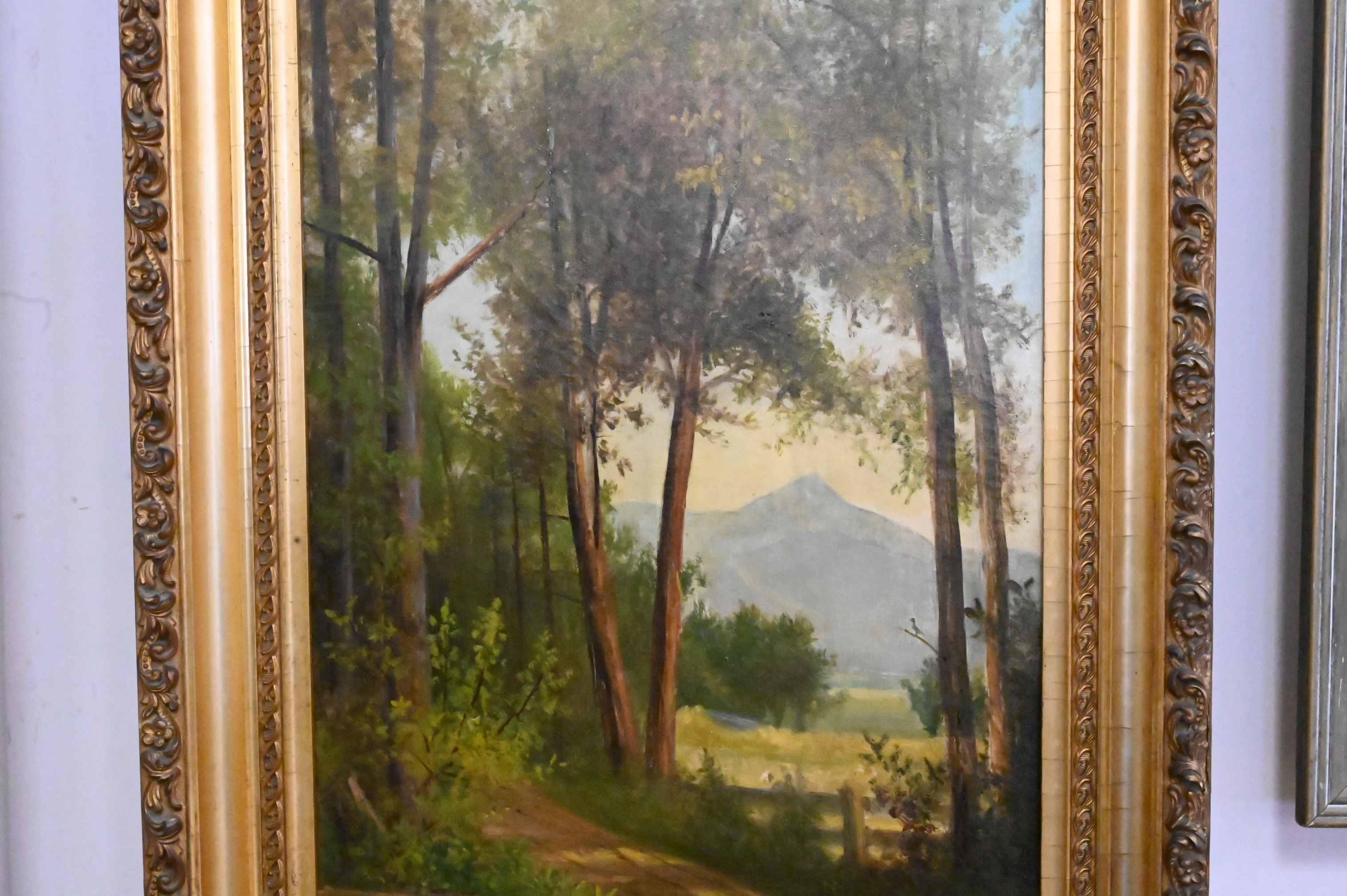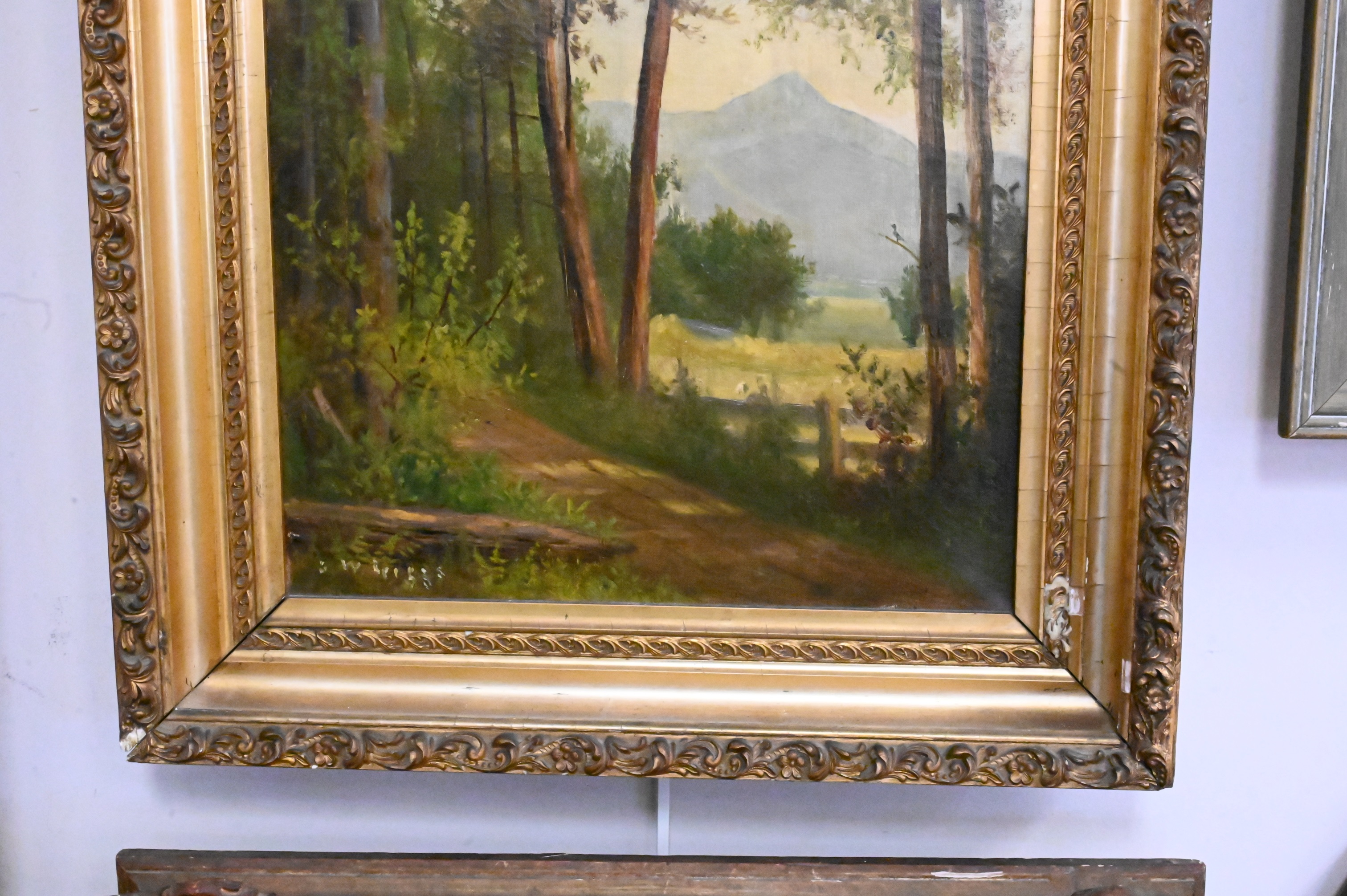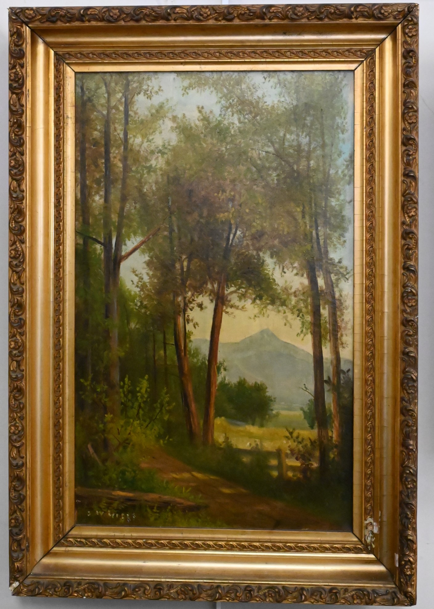 Samuel W. Griggs (American – Massachusetts,1827 – 1898), forest landscape with mountainous background, oil on canvas, signed lower left “S.W. Griggs”, 26″ x 16″, small patch/repair to center.