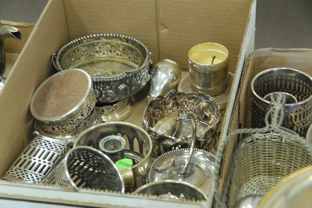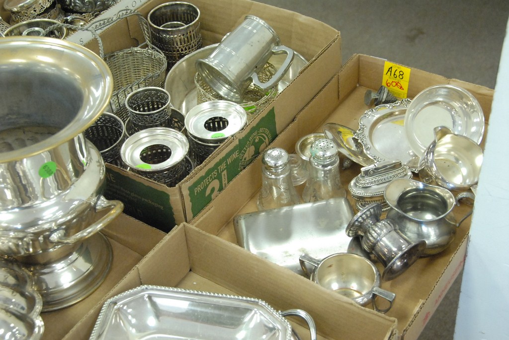 Lot 134: Six box lots of silver plate wine bucket, shell shaped dish, toothpick holders, creamers, sugars, candlesticks, cocktail shaker, an…