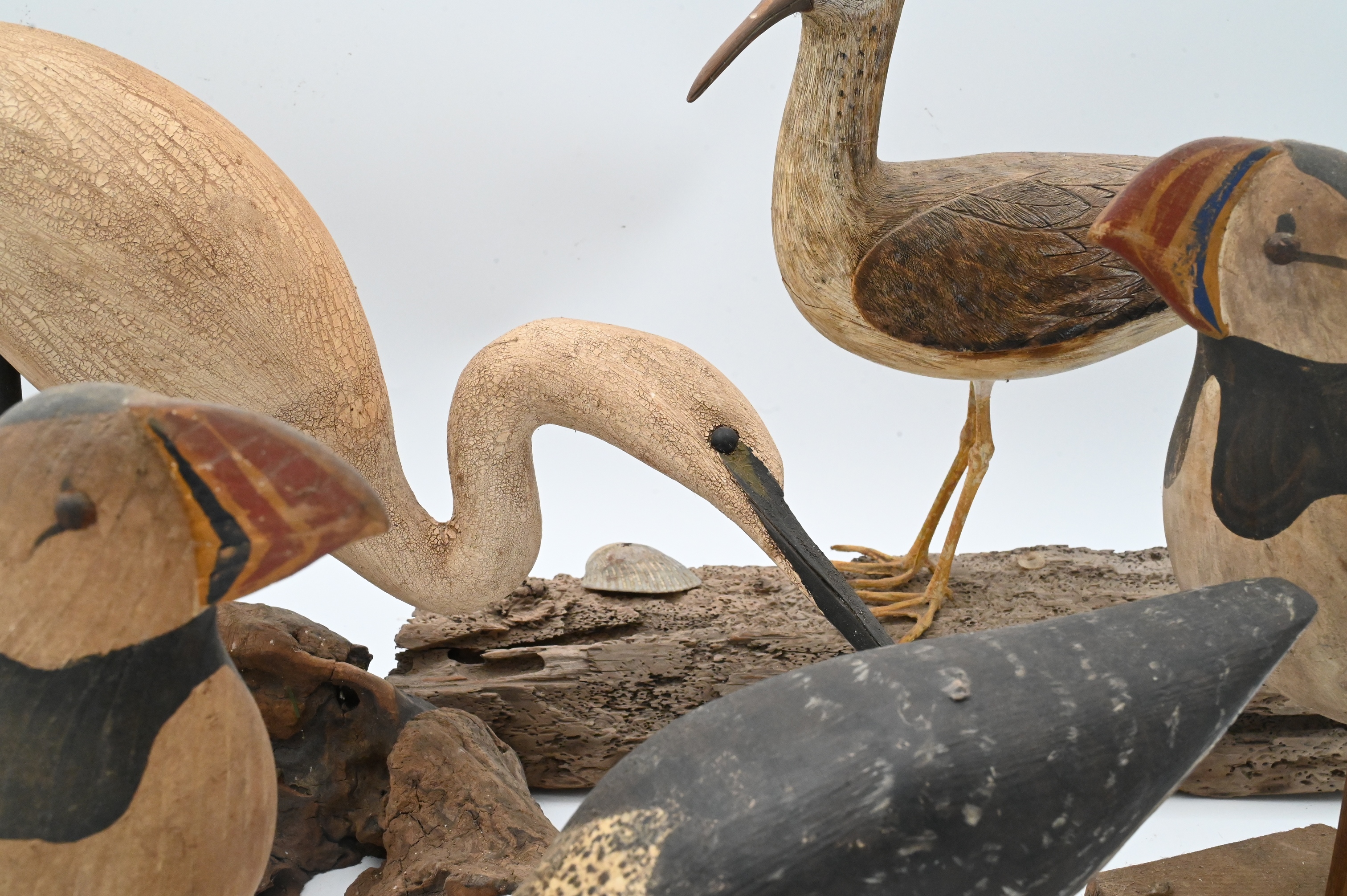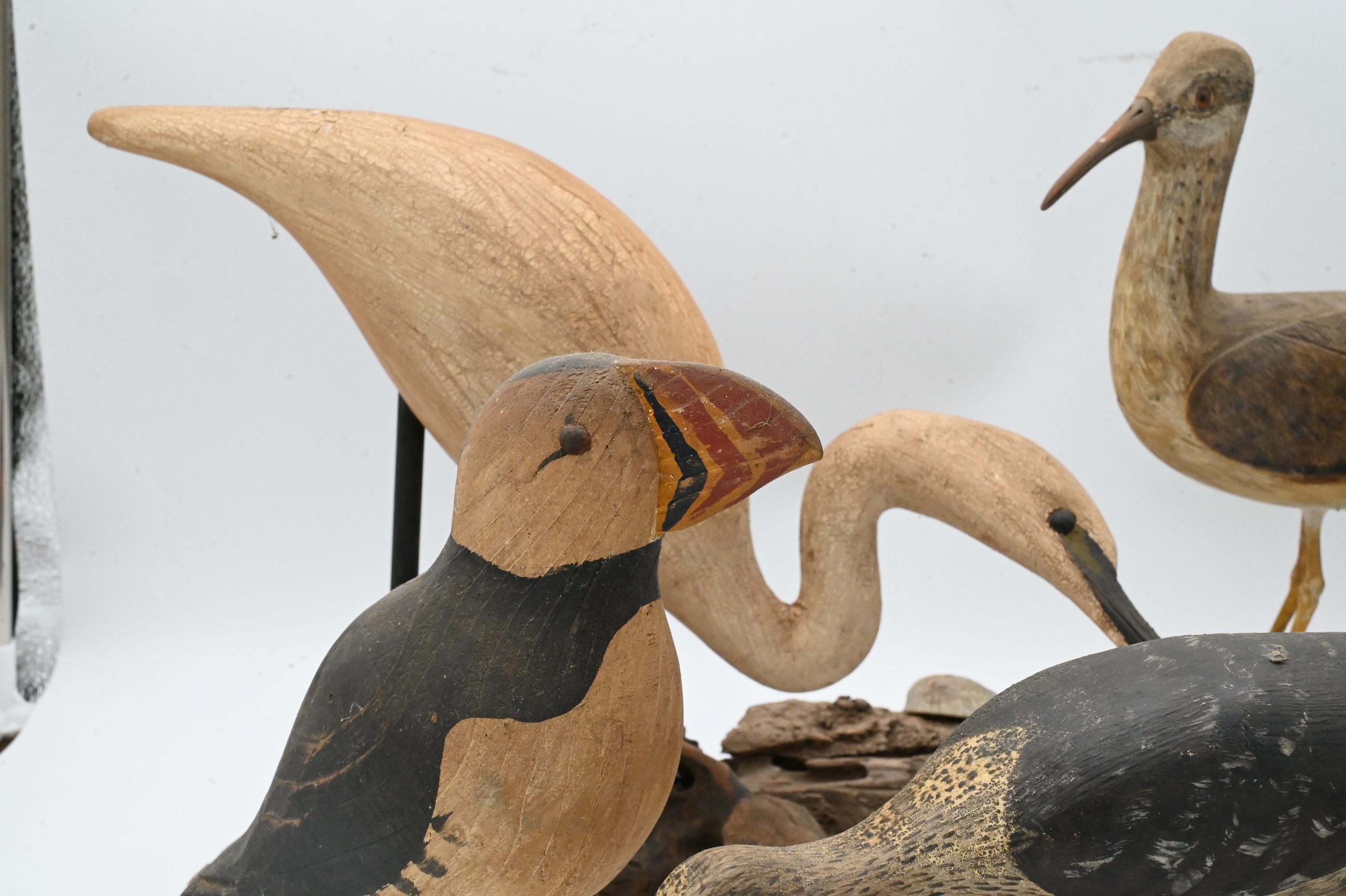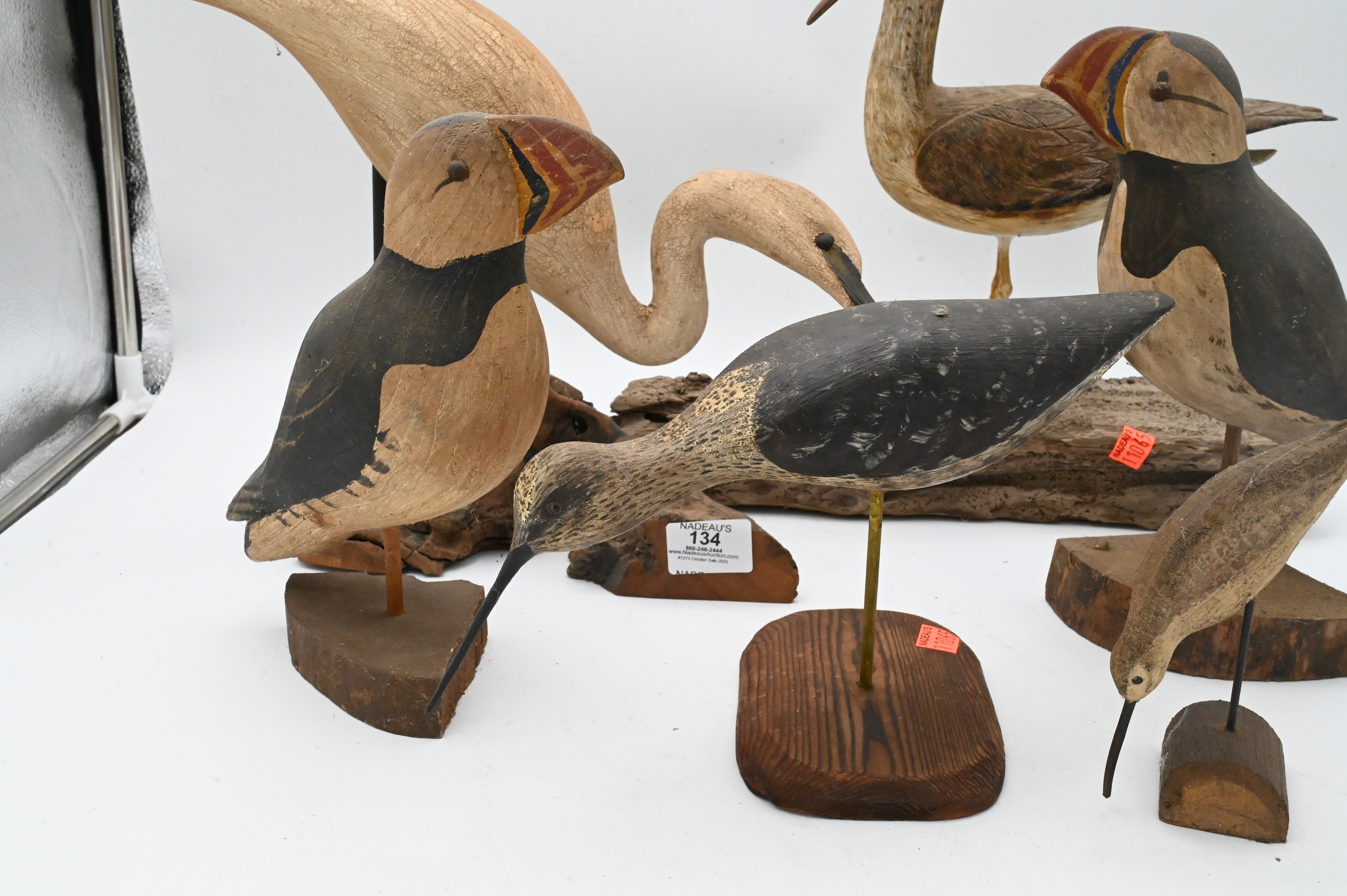 C.R. Dick Drescher egret on driftwood base, signed, two Will Kirkpatrick puffins, shore bird signed S.Dudley ’88, New Jersey yellowlegs signed illegibly, John Schmidt ’88