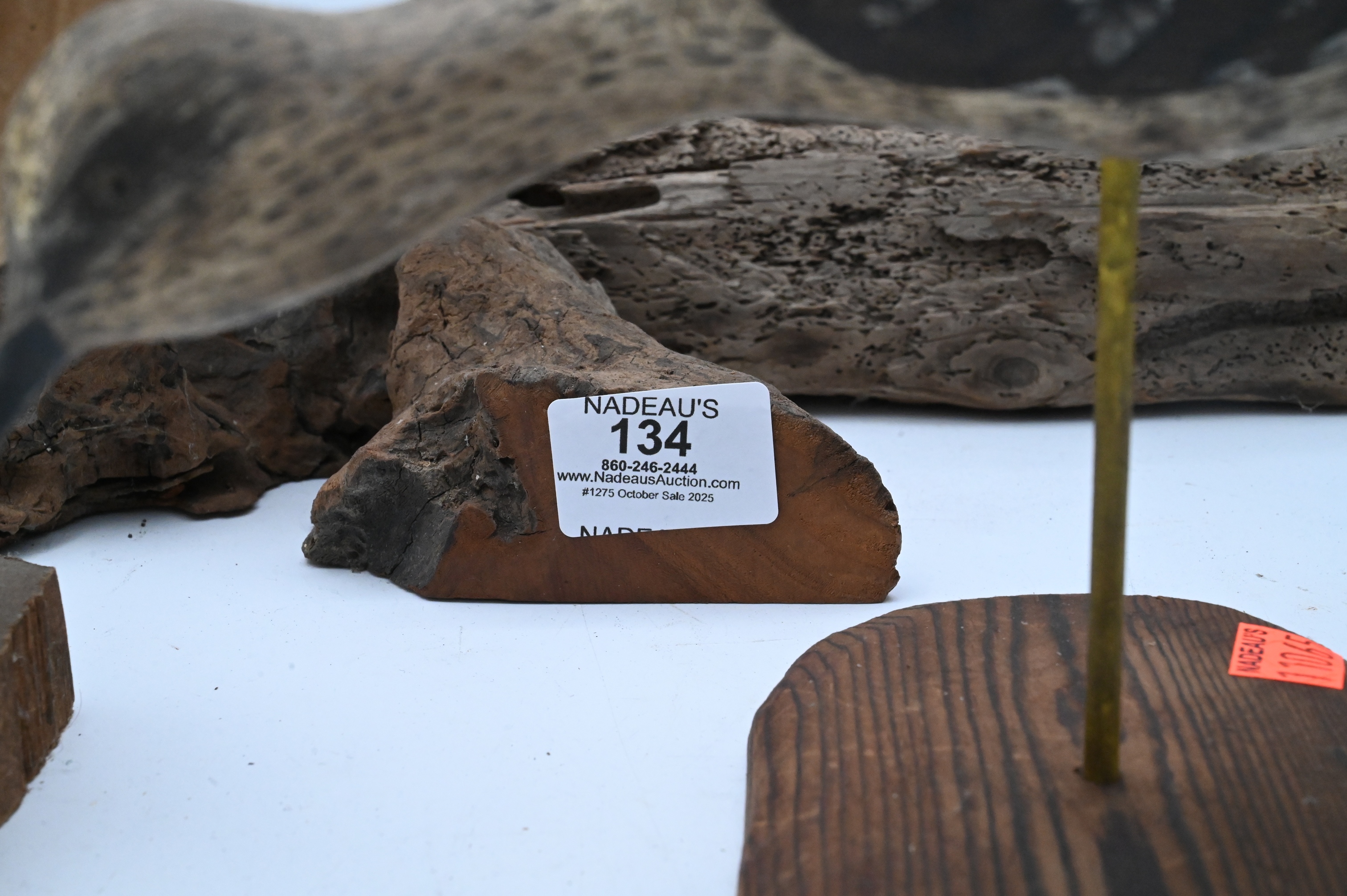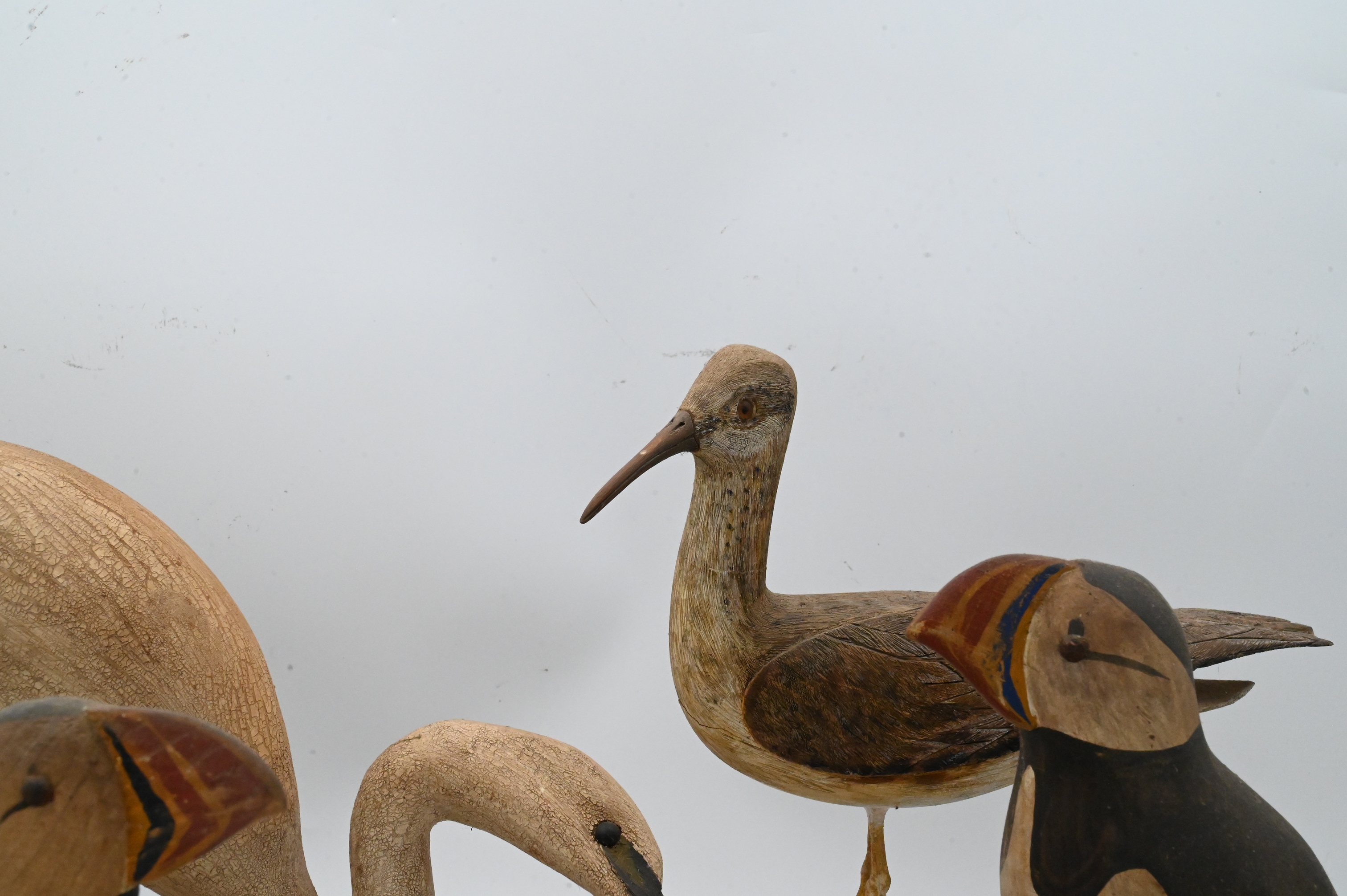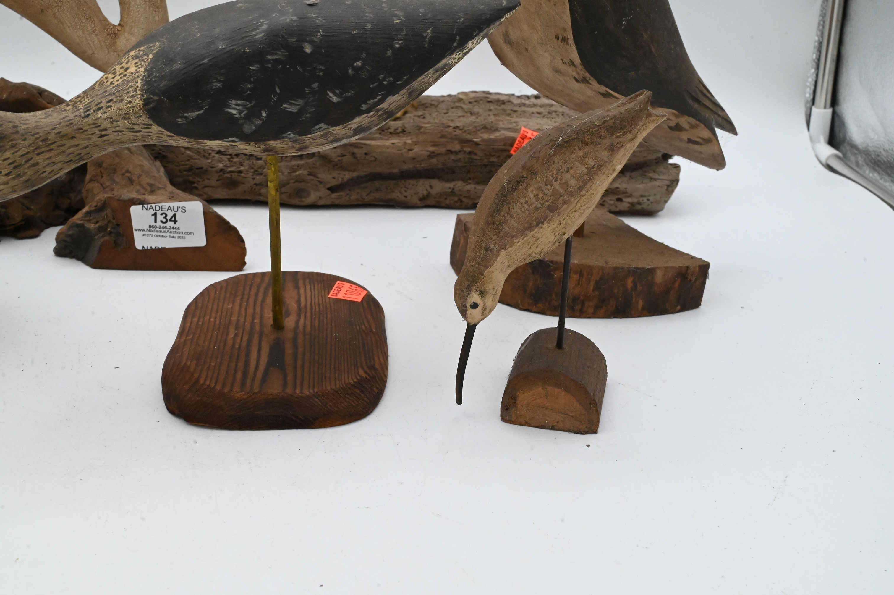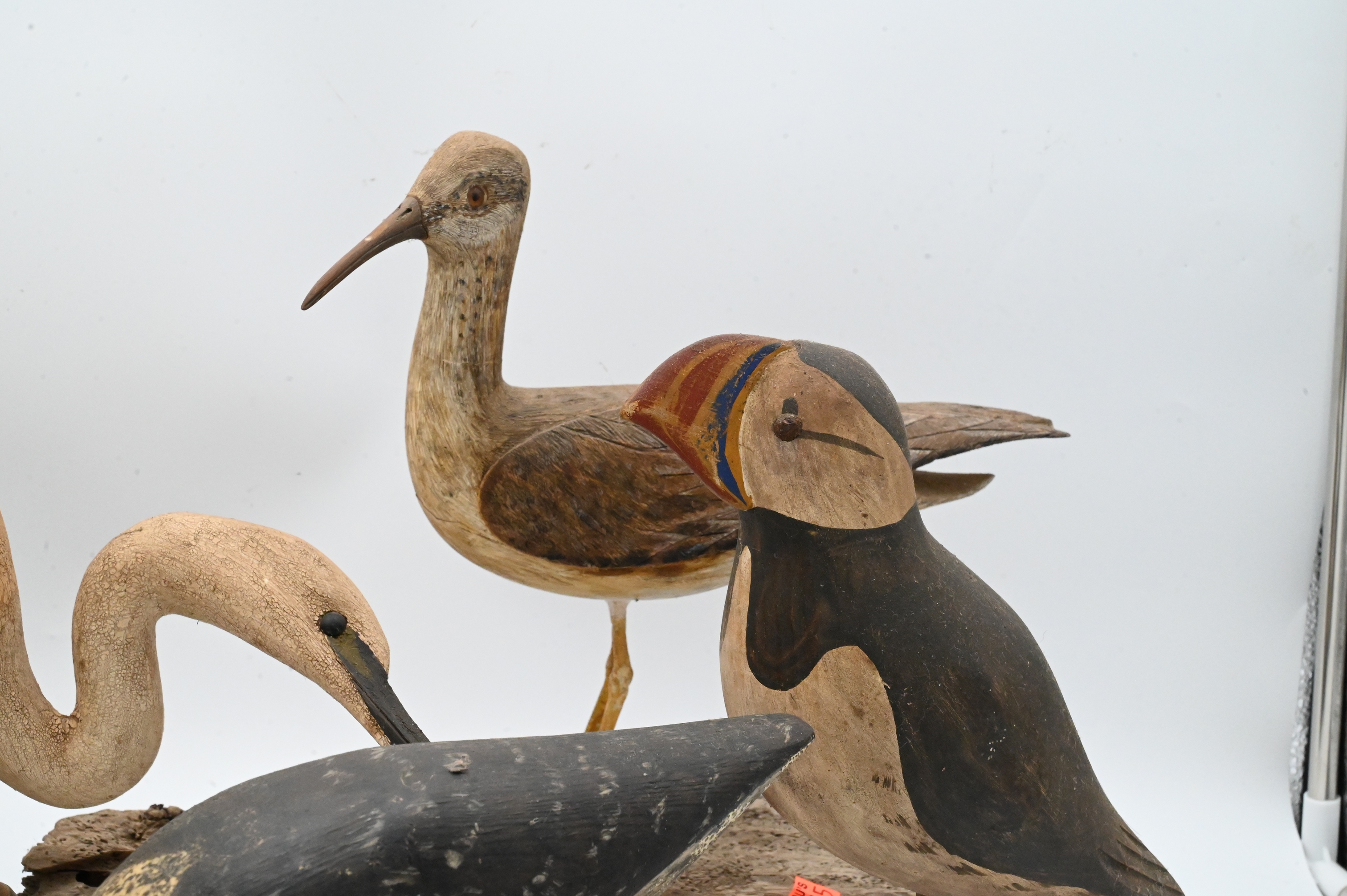 C.R. Dick Drescher egret on driftwood base, signed, two Will Kirkpatrick puffins, shore bird signed S.Dudley ’88, New Jersey yellowlegs signed illegibly, John Schmidt ’88
