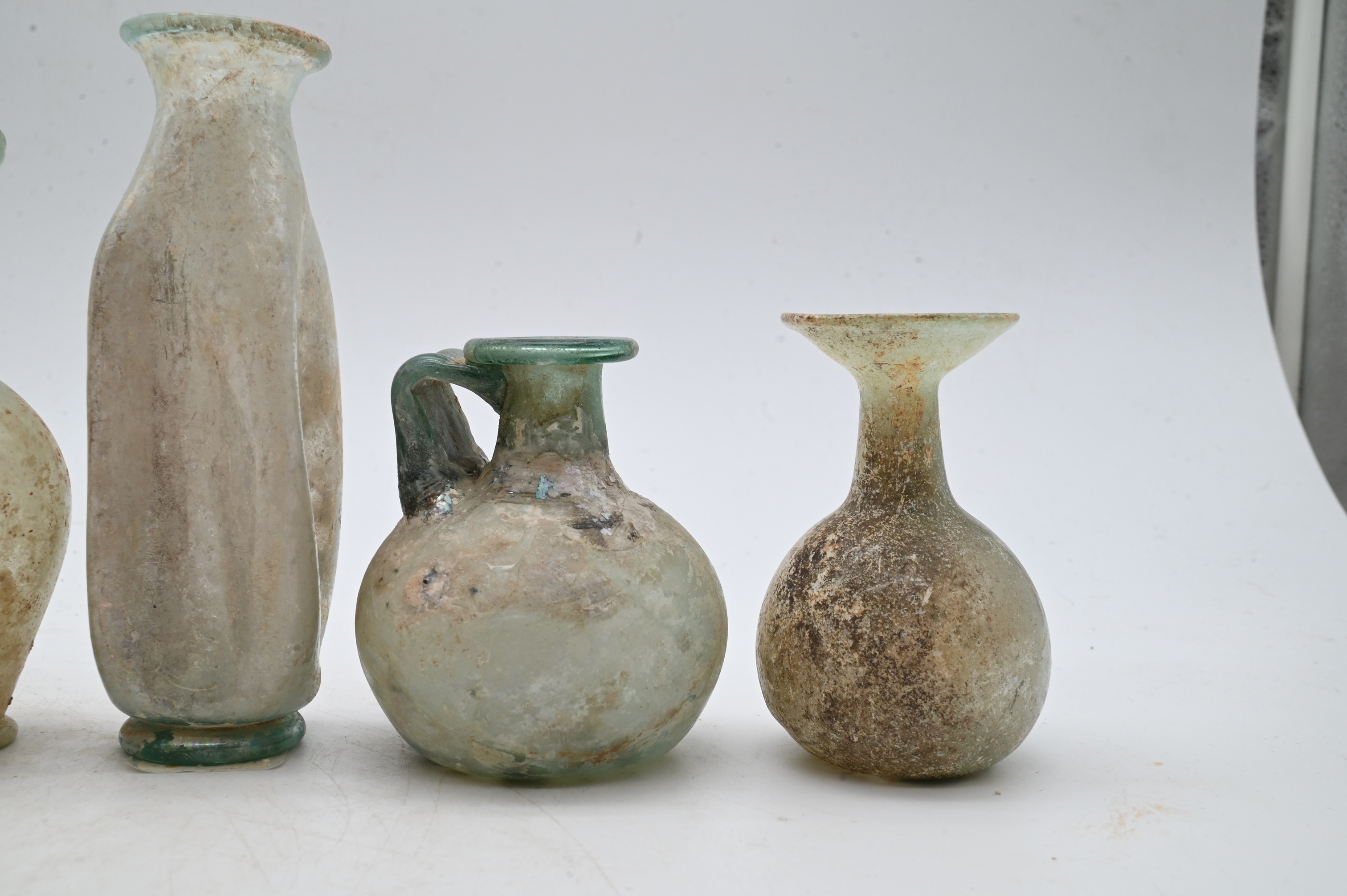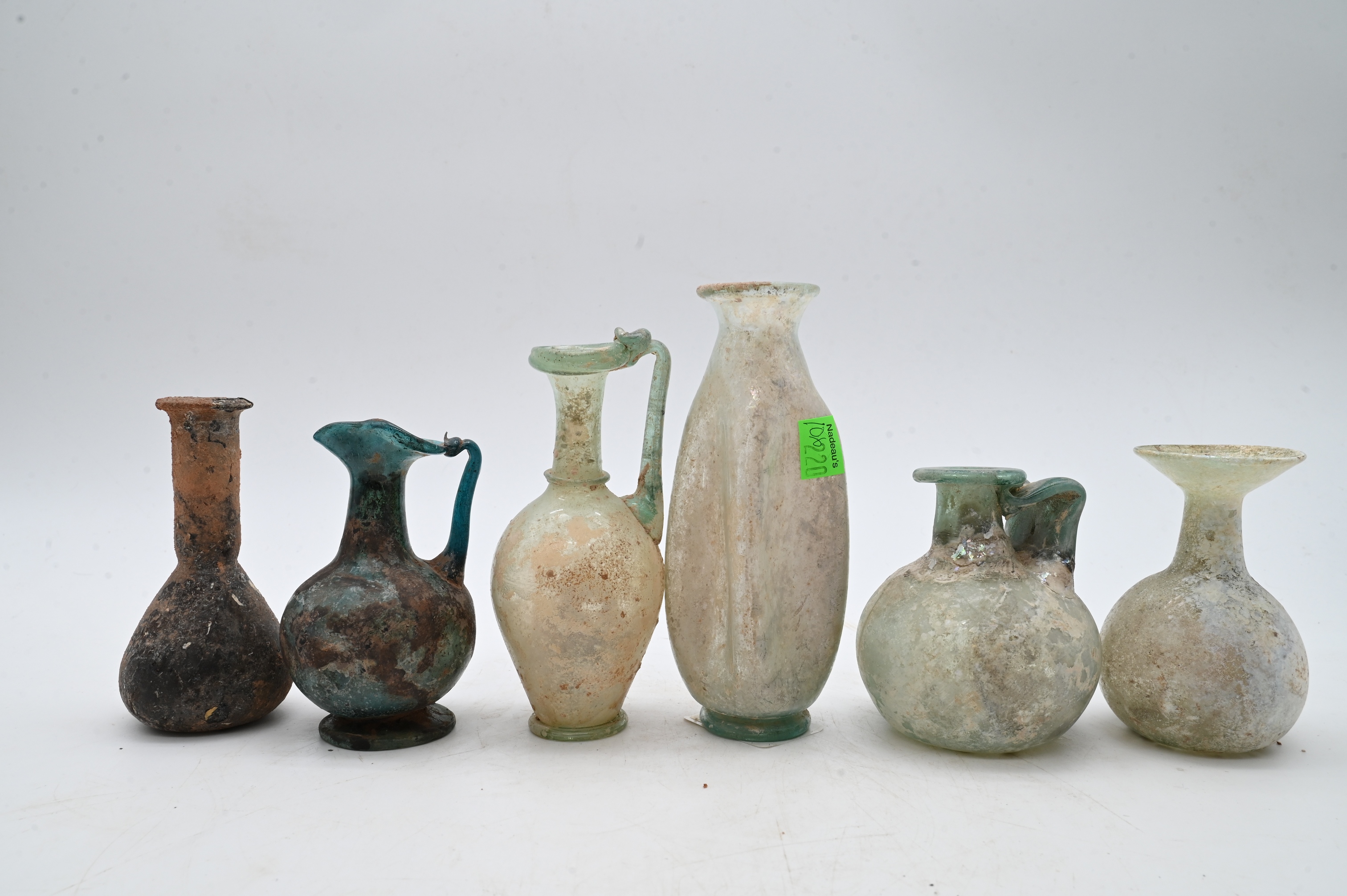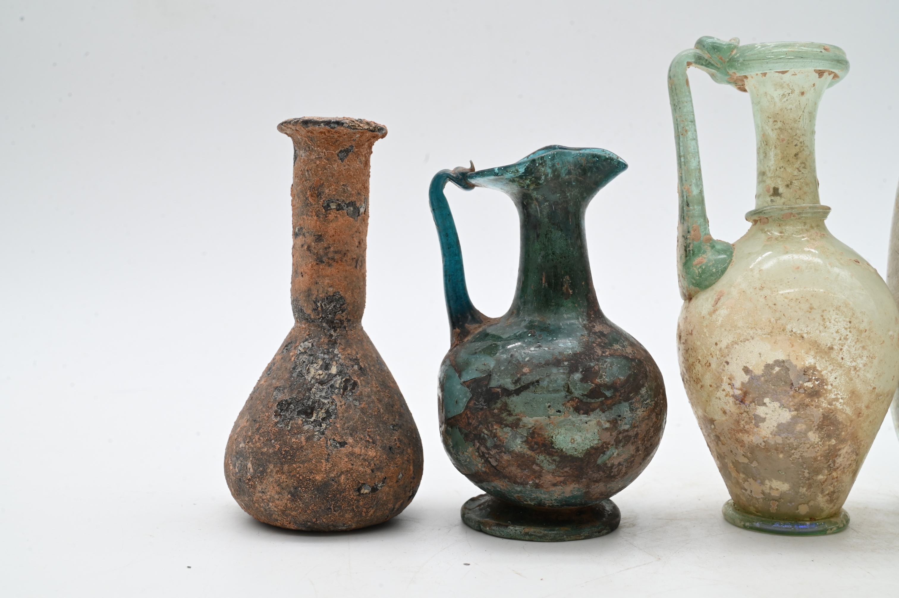 including a pitcher in deep blue-green glass, a pitcher with pinched sides, a second pitcher, two beakers, and a bottle with pinched square sides in pale green glass, all free-blown and with surface encrustation consistent with burial