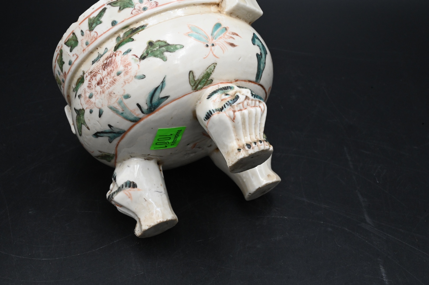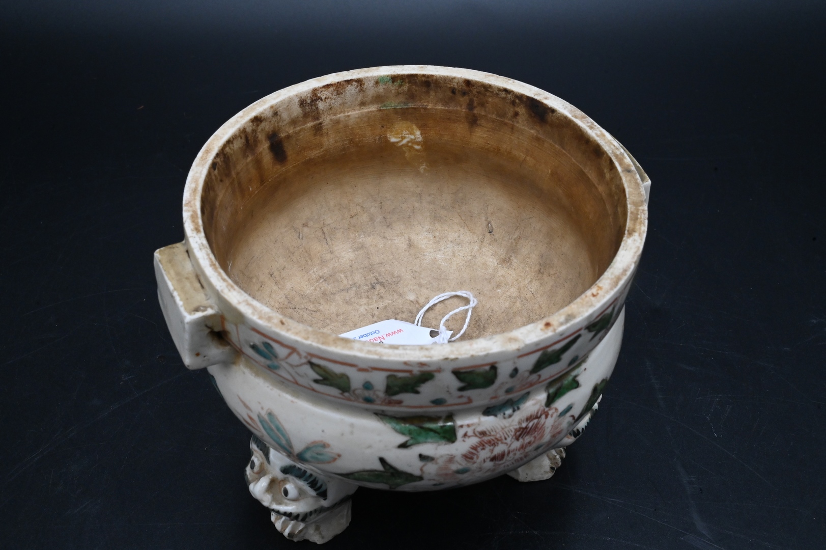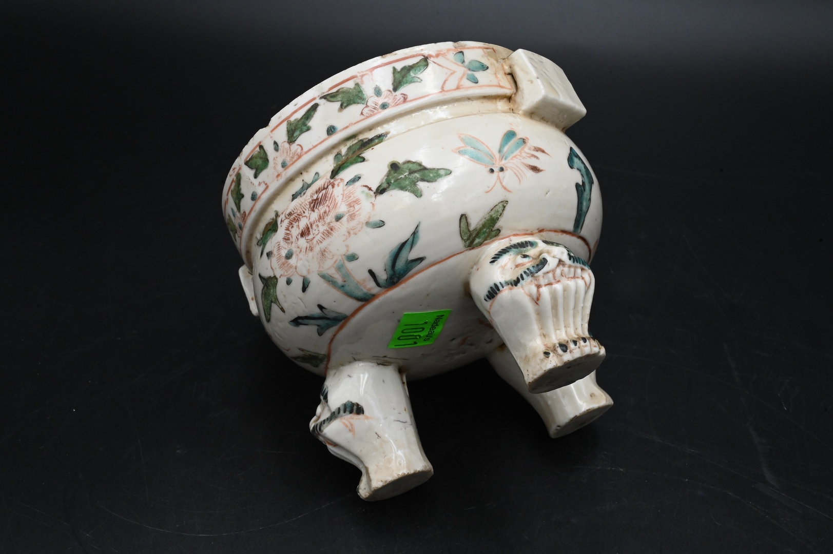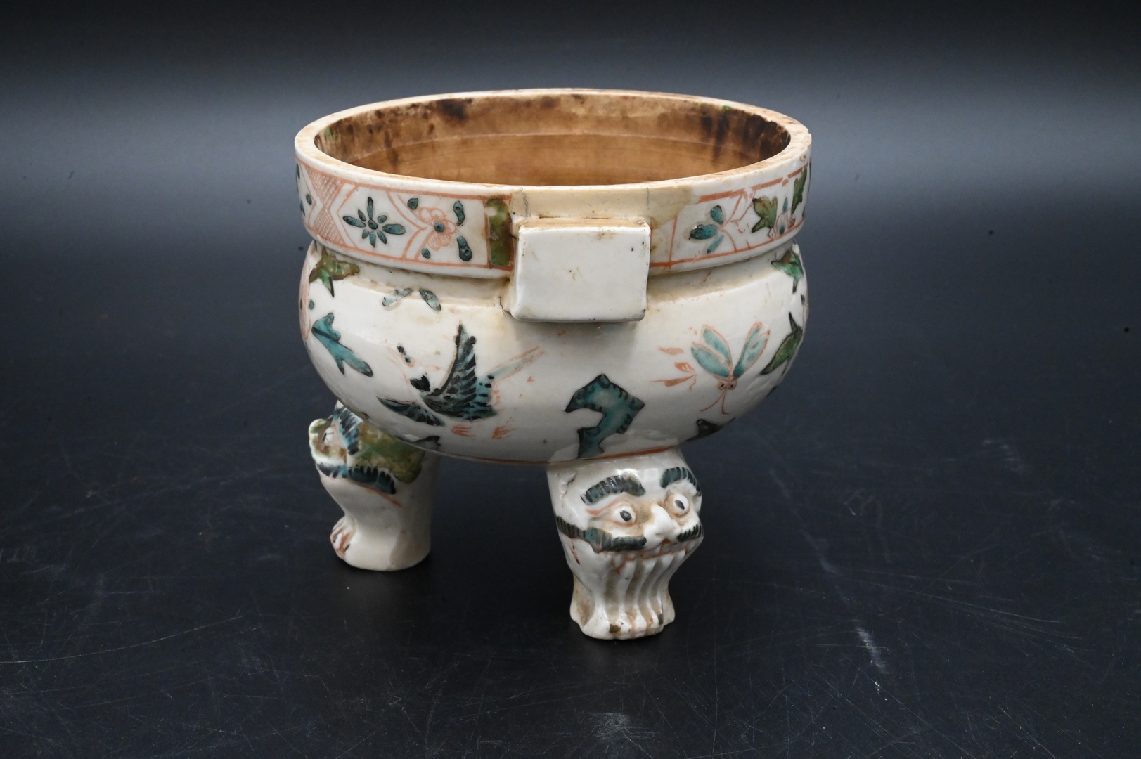 Small Japanese Arita Porcelain Tripod Censer, Edo period (1603 – 1868), possibly Kakiemon, zoomorphic legs support a body decorated with chrysanthemum flowers and leaves, height 5 inches. Provenance: Estate of James Dana English of New Haven to benefit the New Haven CT Museum.