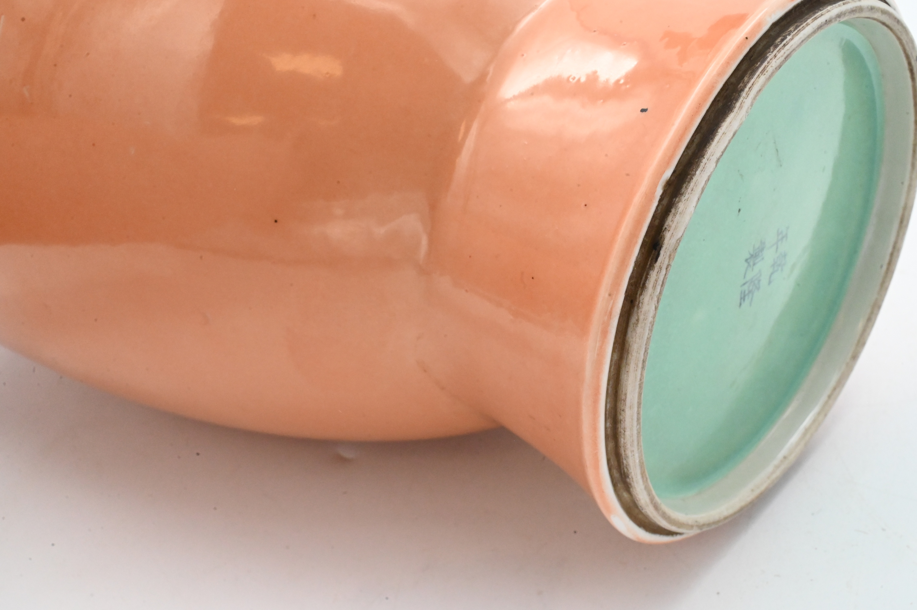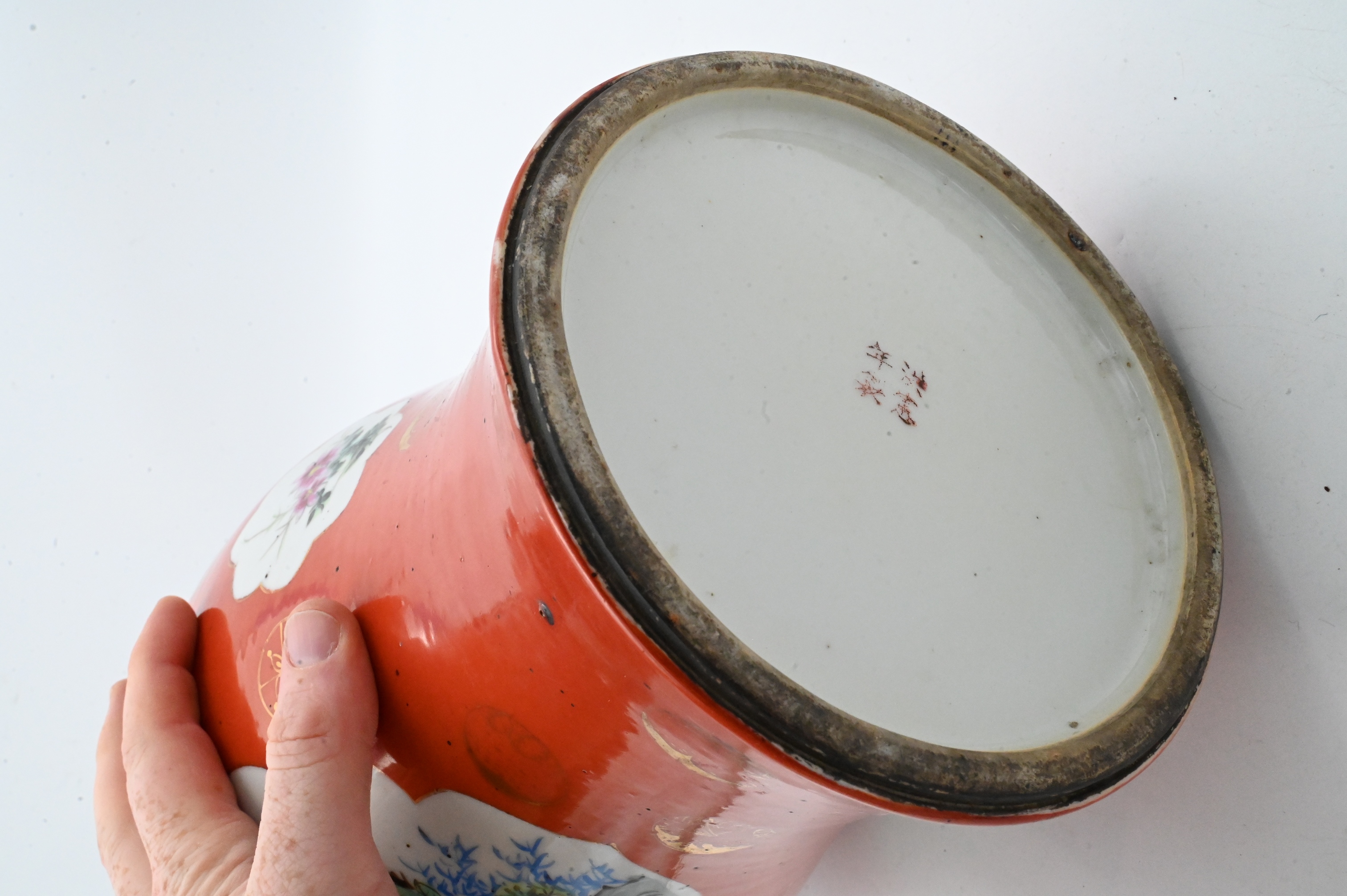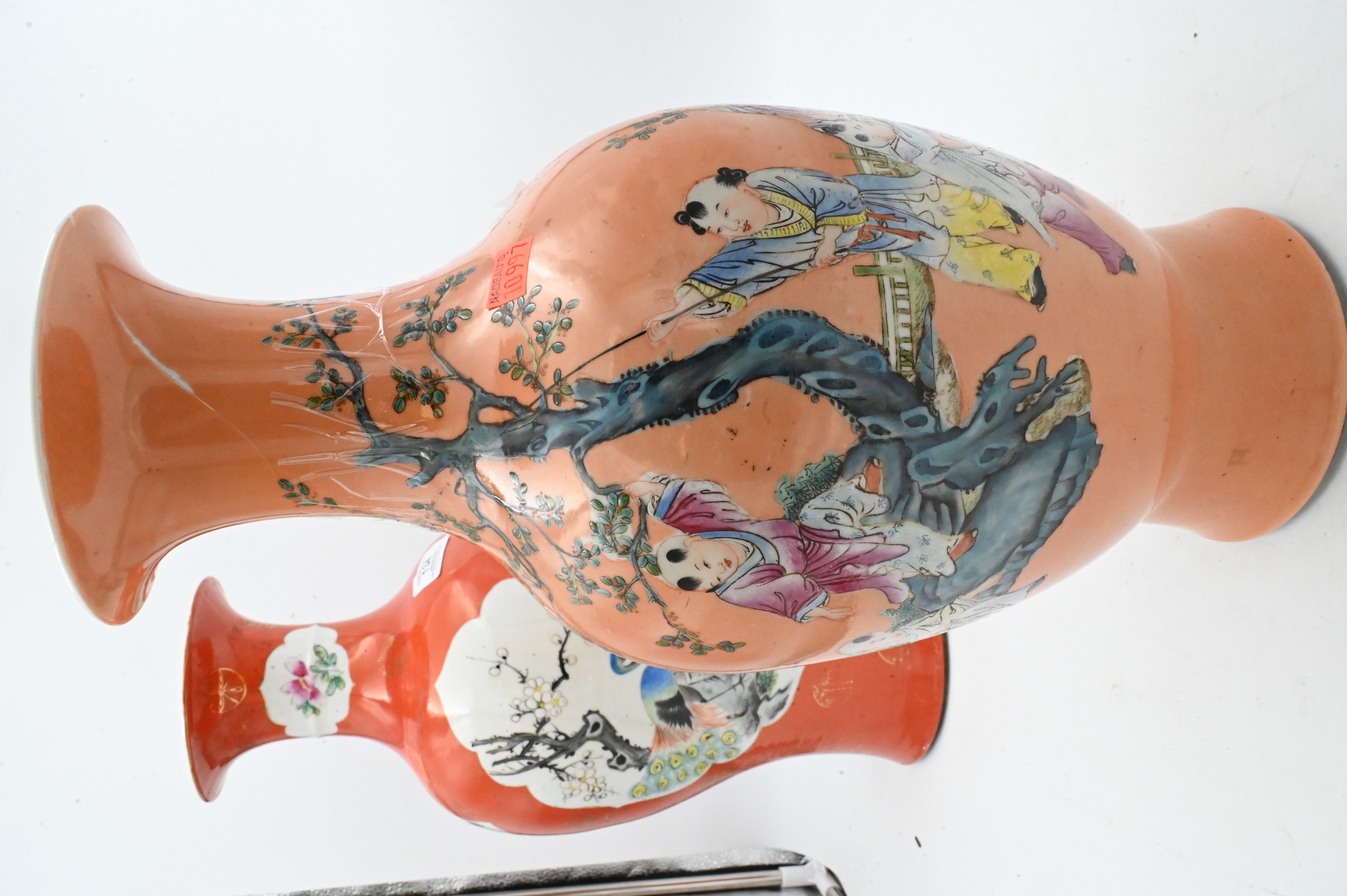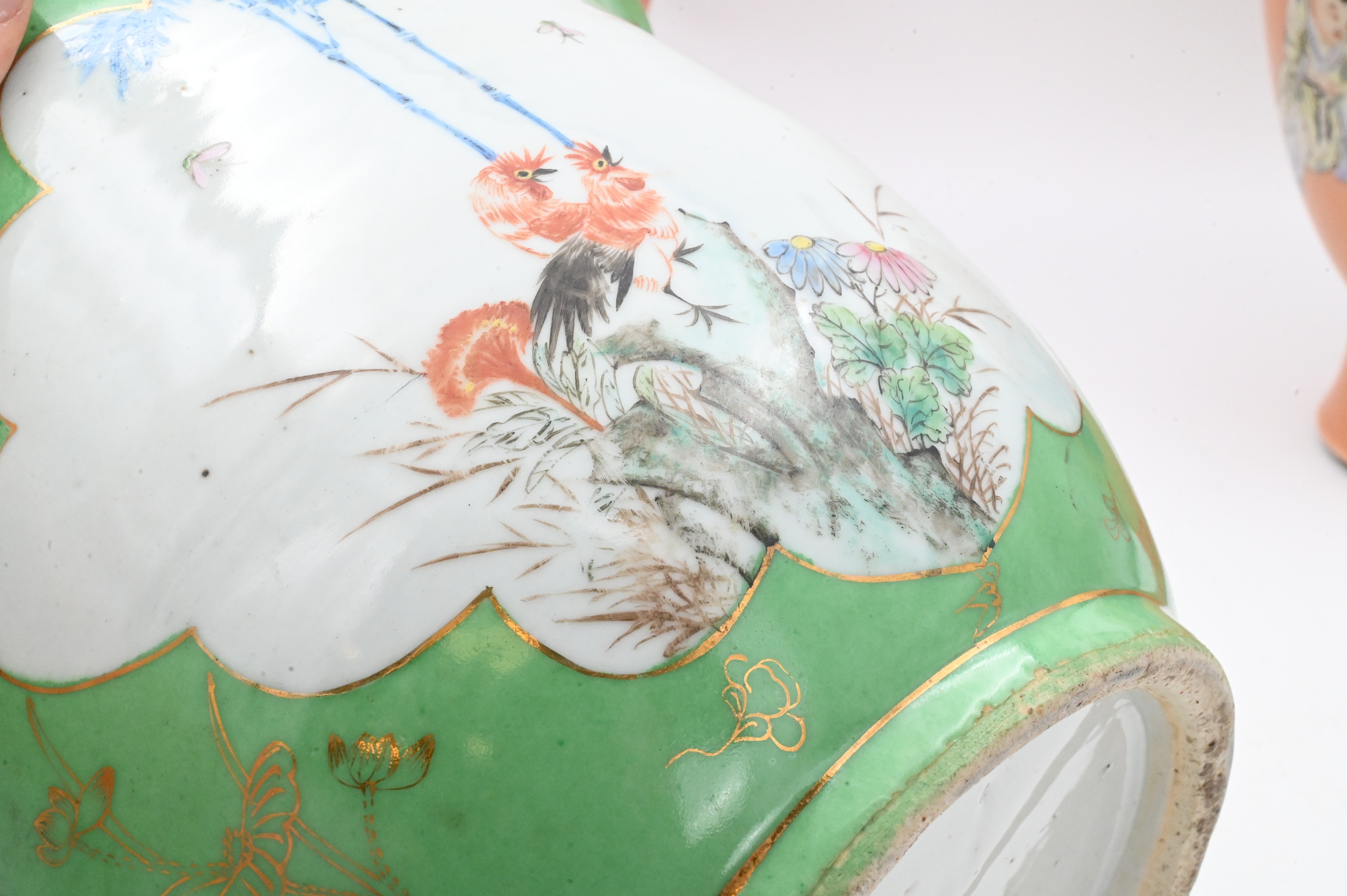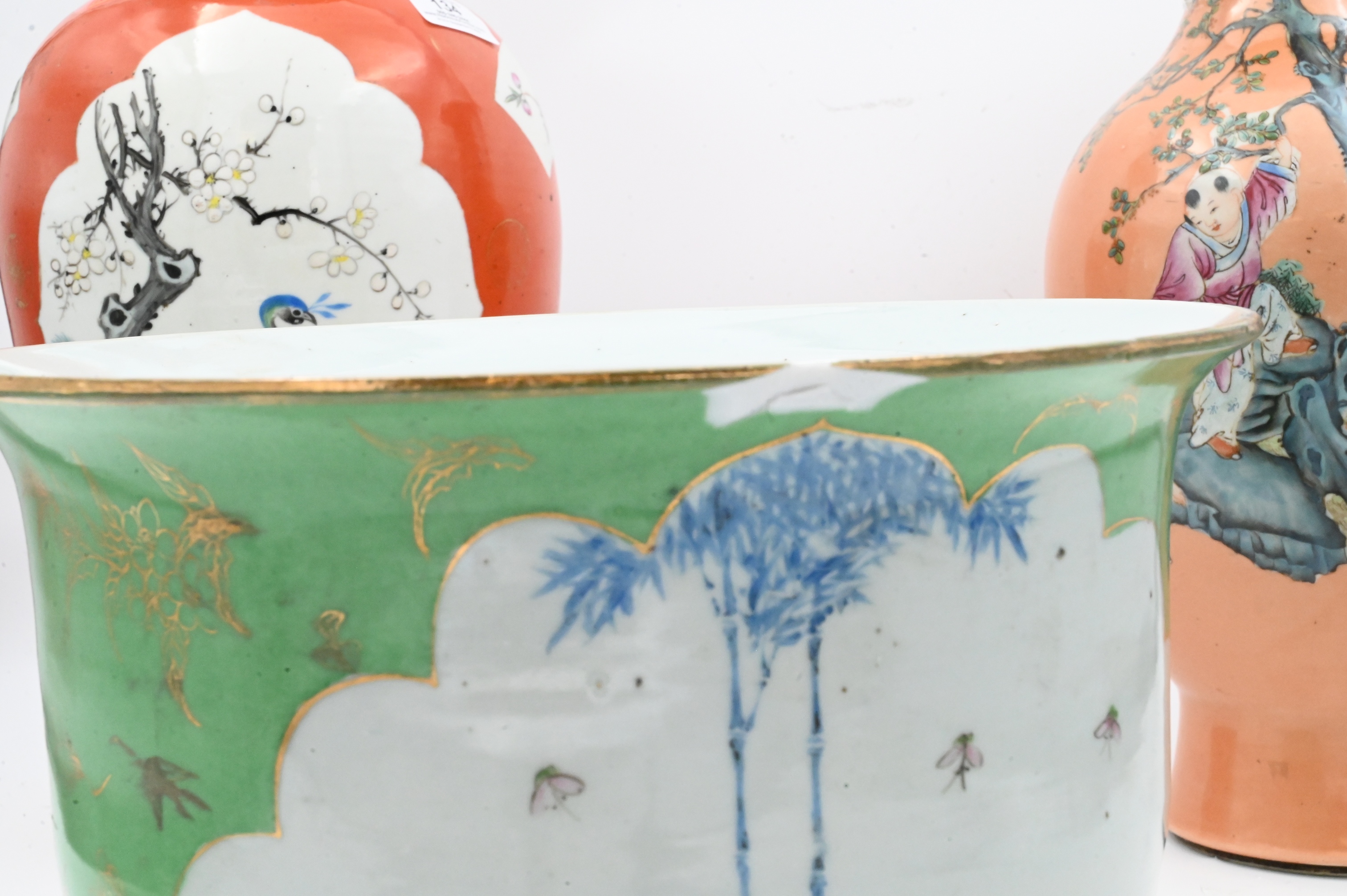 one red/orange coral having peacock and pink peony cartouches with gilt circular medallions, along with light orange ground playing boys vase along with green planter with gilt accents and rooster and duck bird motif
