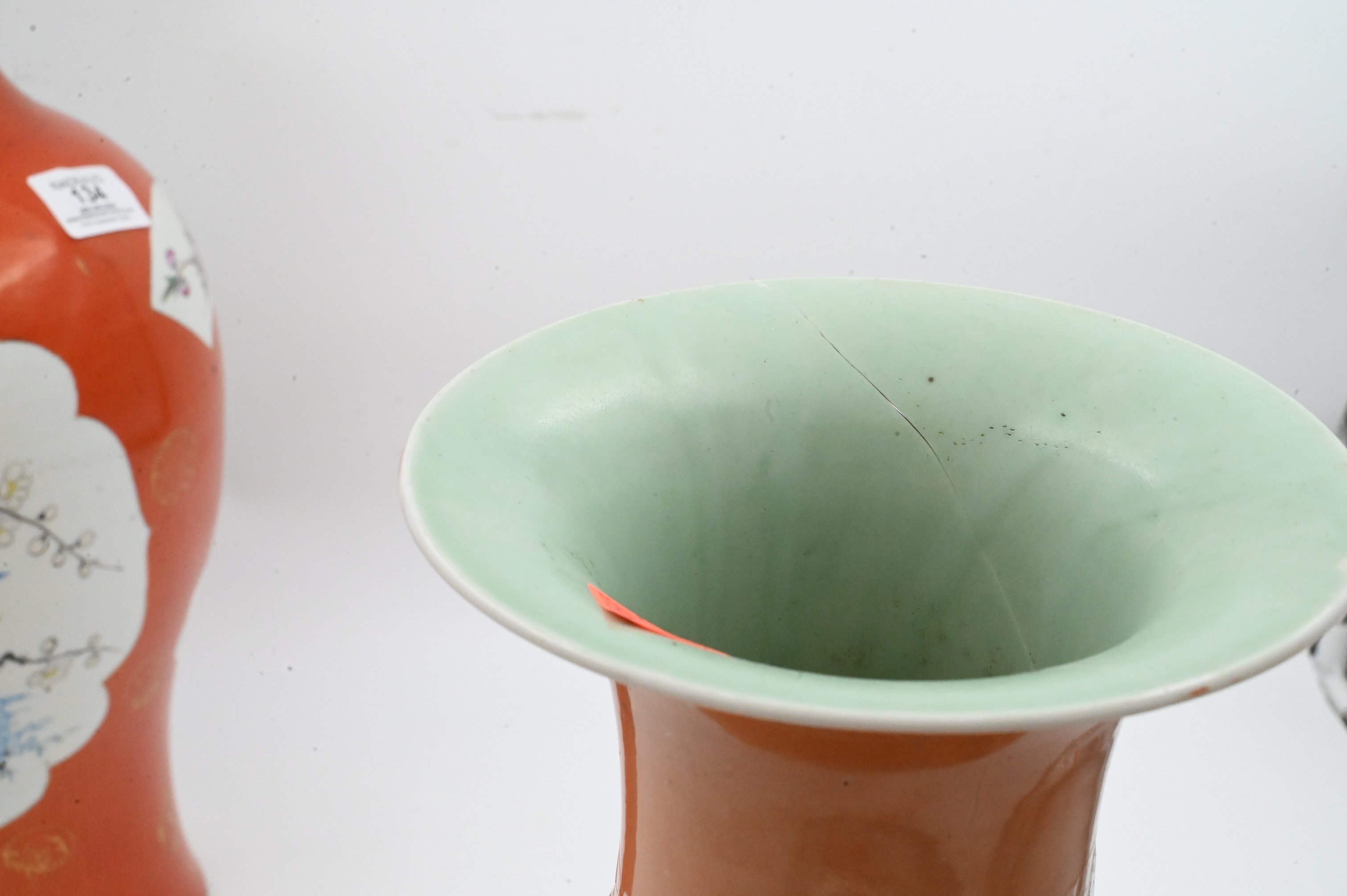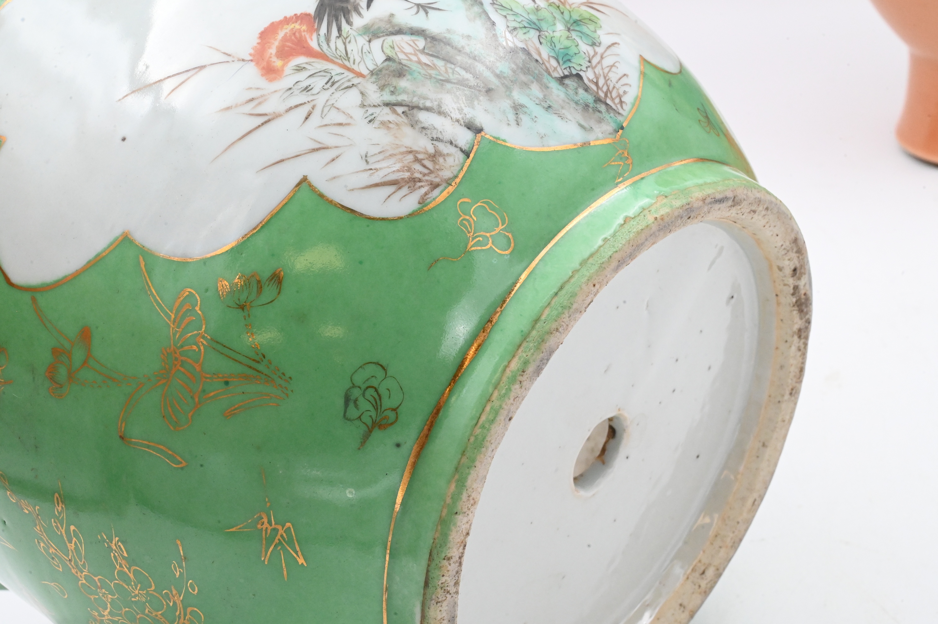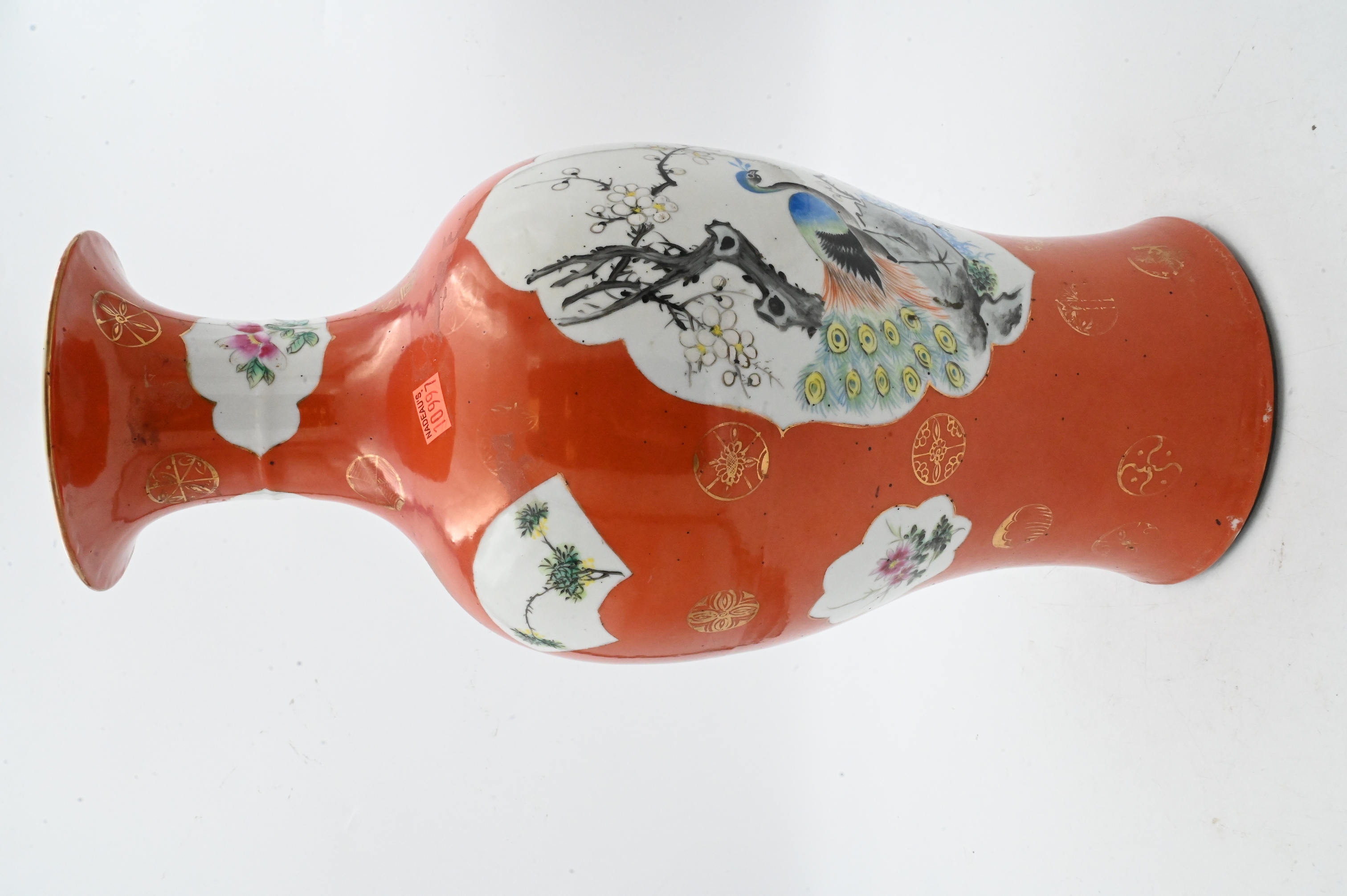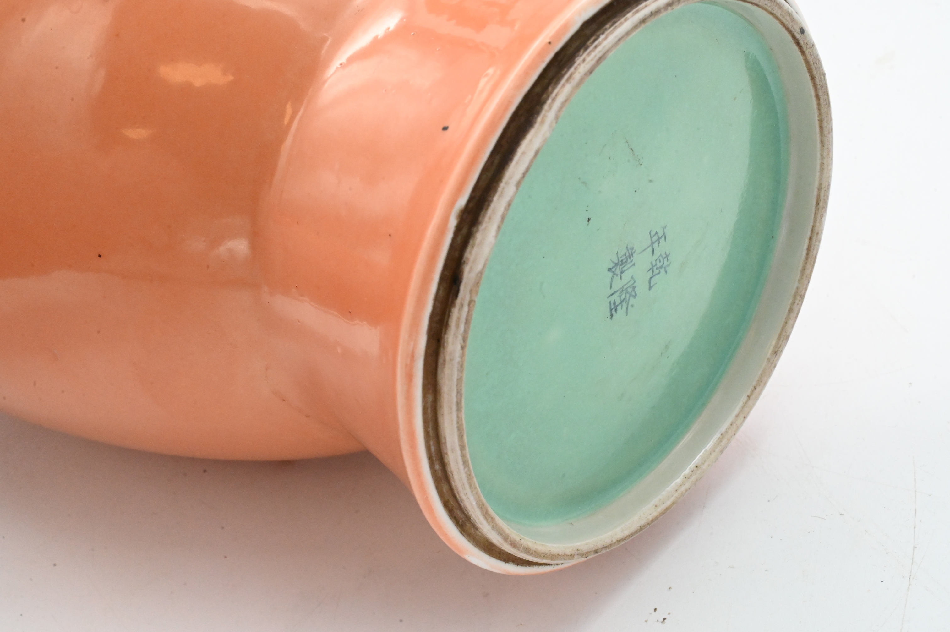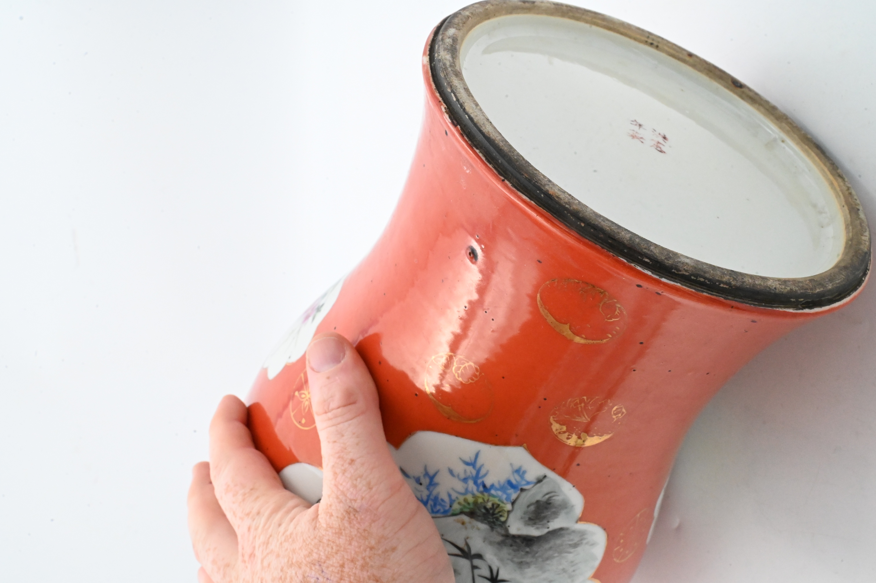 one red/orange coral having peacock and pink peony cartouches with gilt circular medallions, along with light orange ground playing boys vase along with green planter with gilt accents and rooster and duck bird motif