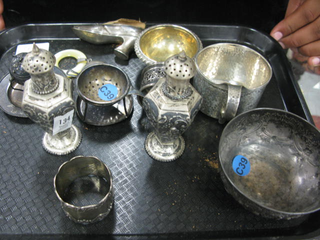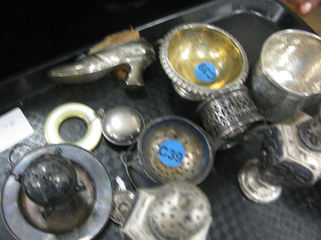 Tray lot of silver including tea ball, tea strainer, cup, rattle, pin cushion, napkin rings, salt and pepper shakers, etc