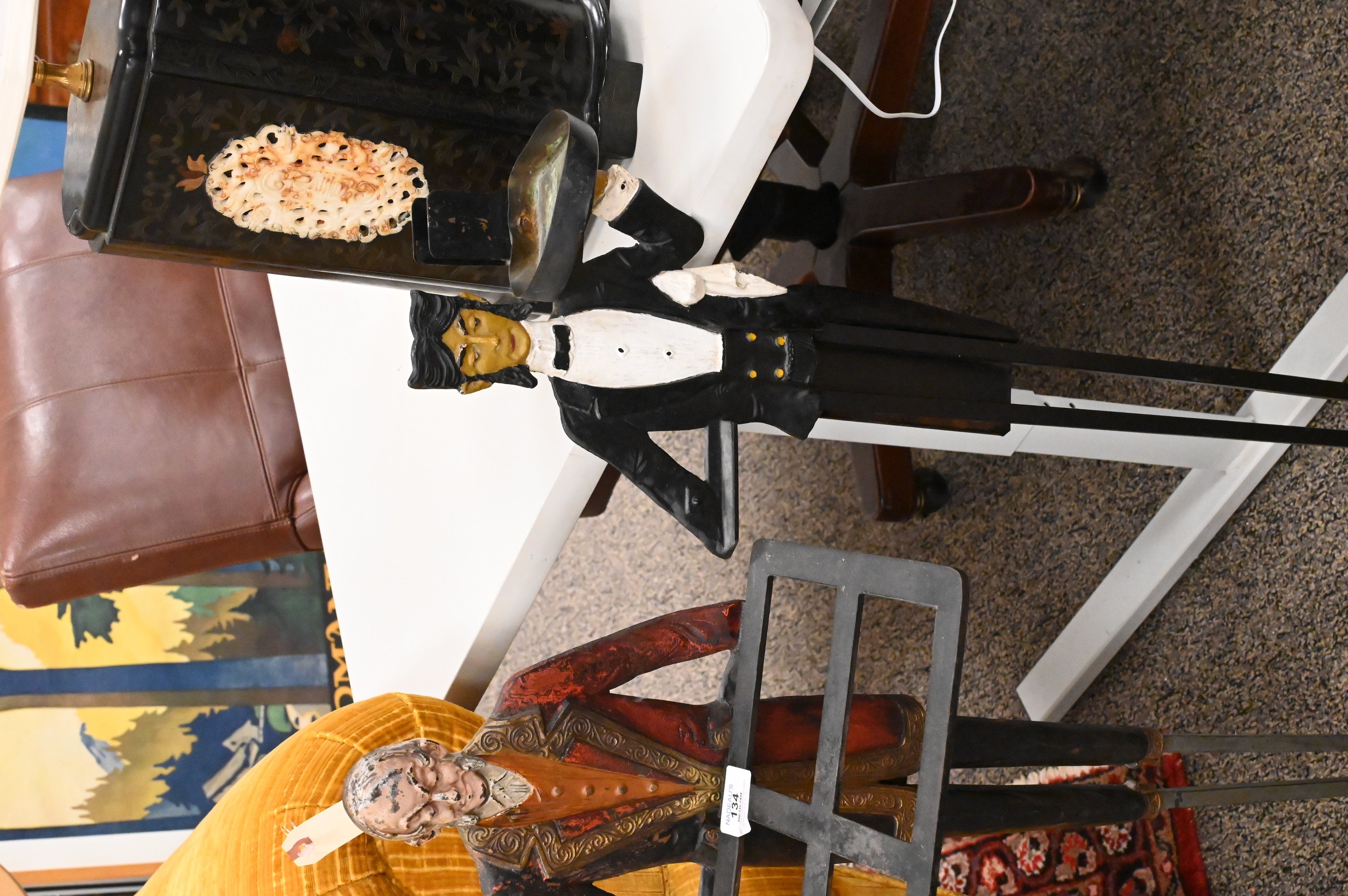 One in ornately painted suit with tray having space for four inserts, on square base with patent mark, height 37 inches
