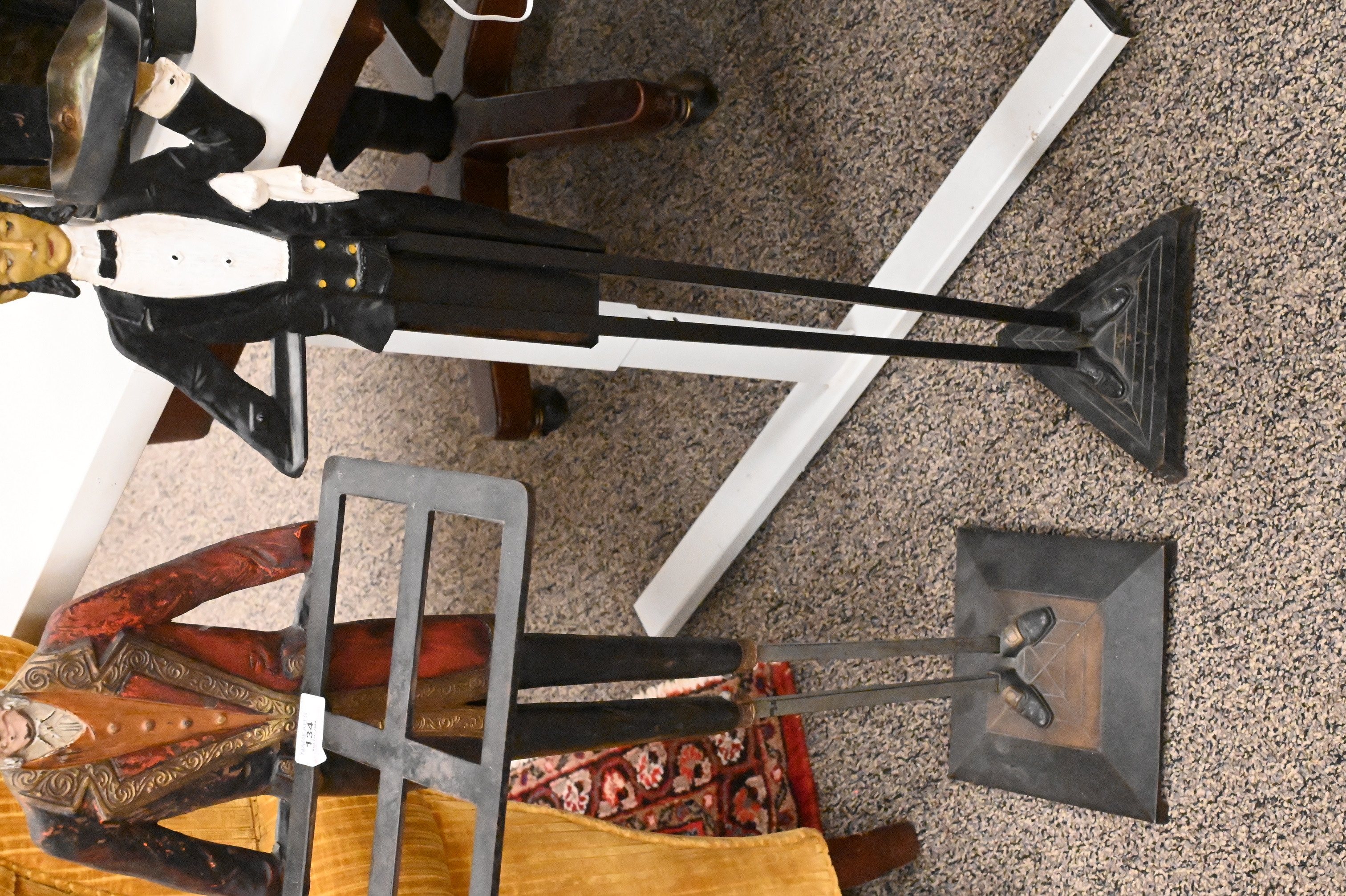 One holding up round ashtray and matchbox holder on triangle base with patent mark, height 36 inches