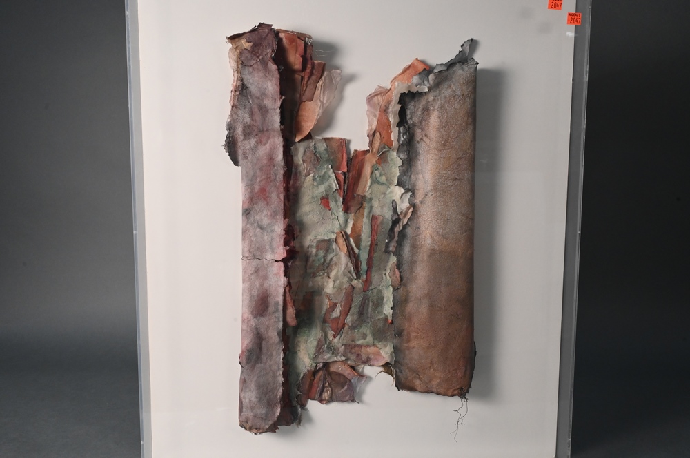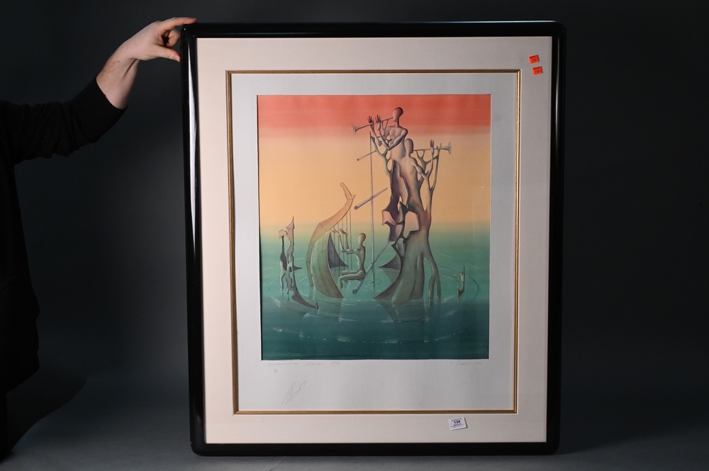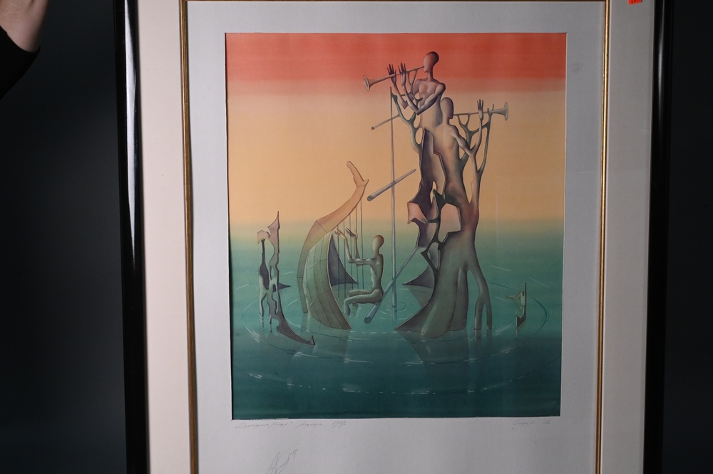 Lot 134: Two Framed Pieces, to include Dead Sea Scrolls, 1988, frame size 29.5″ x 26″; and The Musicians by Alex Spivak watercolor 1989, 24″ x 21″.