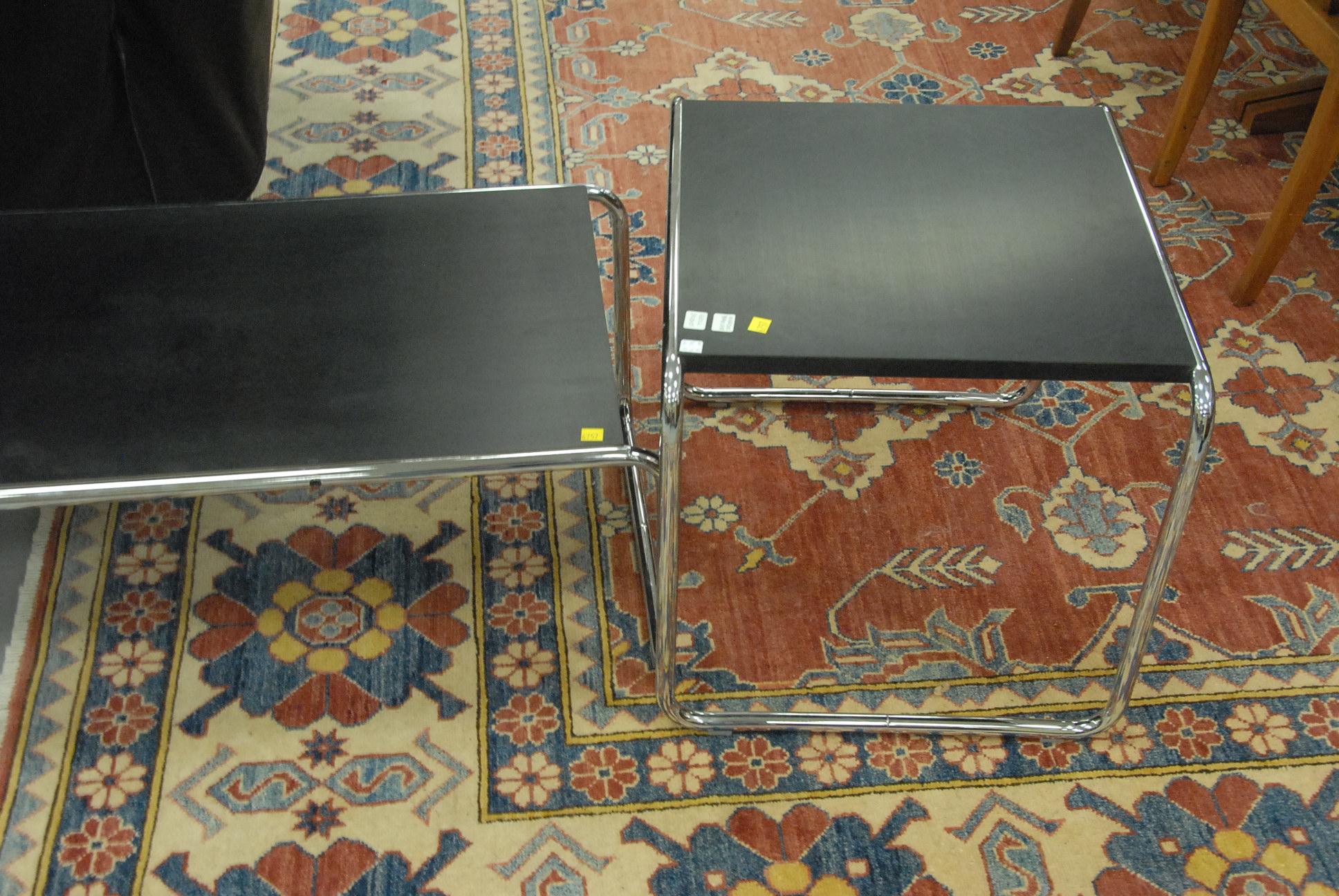 Two Marcel Breuer tubular chrome tables with black laminate tops by Knoll Studio, circa late 1990s edition coffee table: lg. 52 wd. 18 1/2, side table: 18 1/2 x 18 1/2.