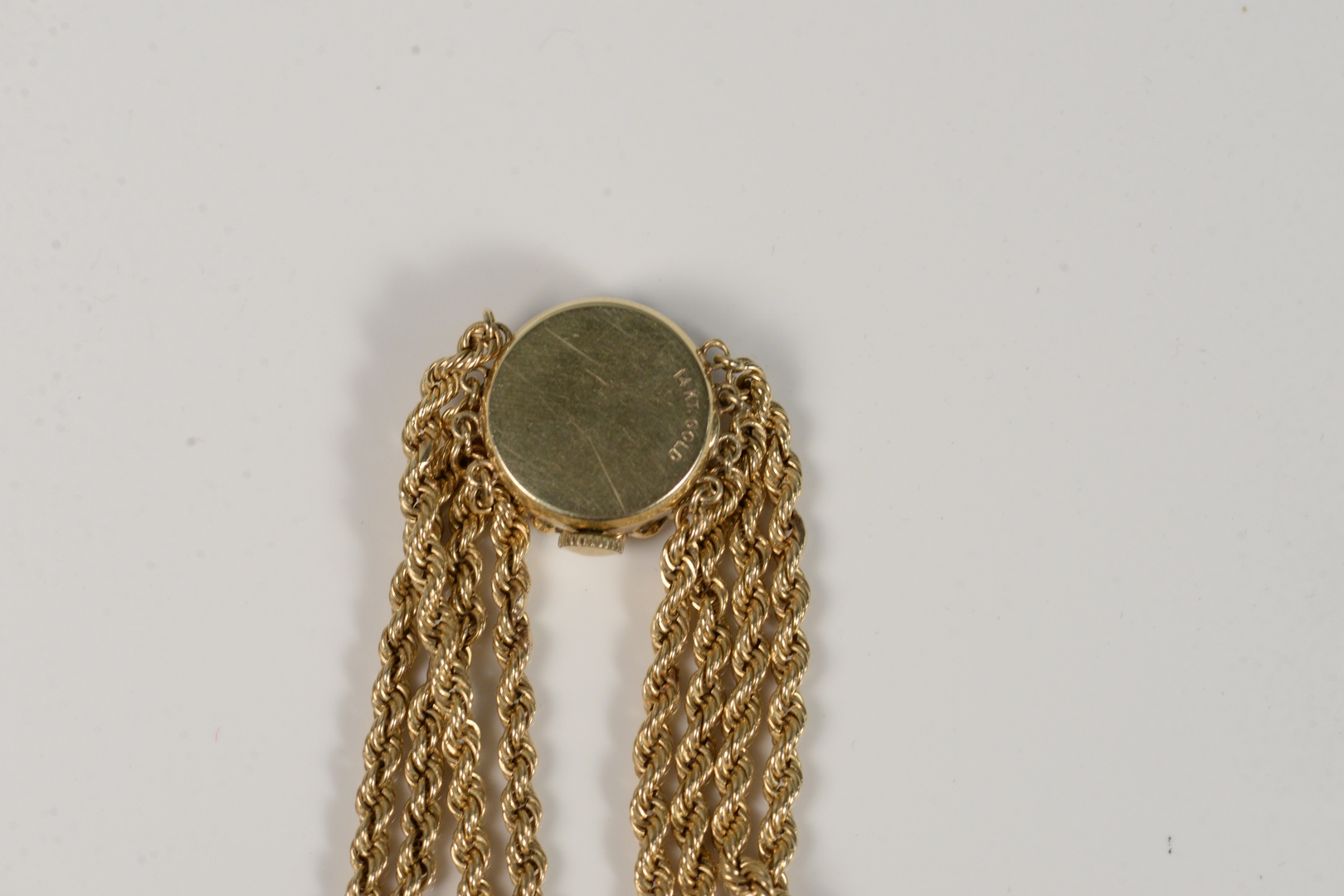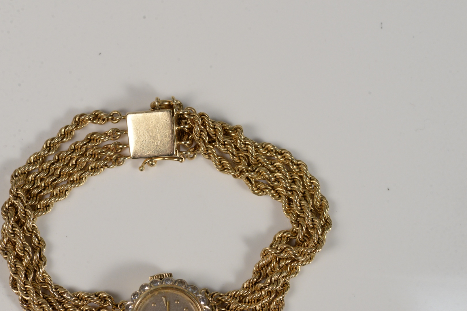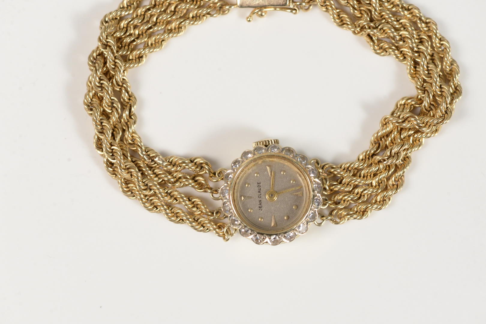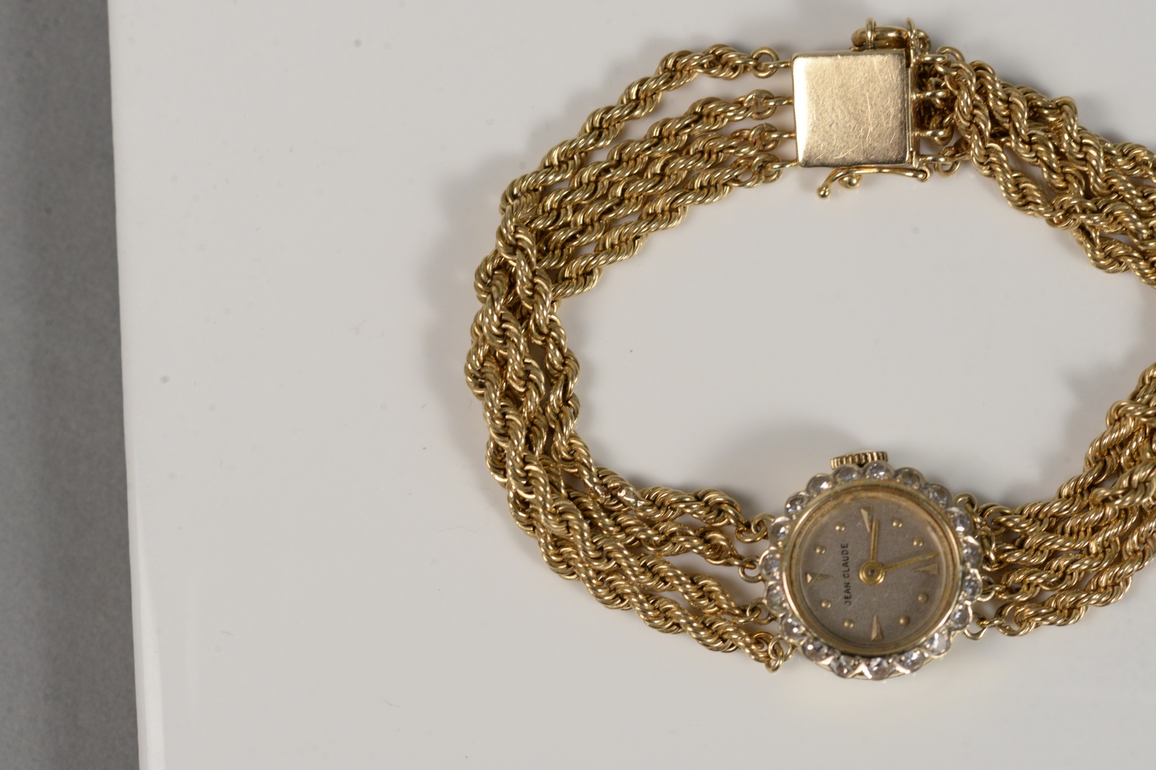 Lot 135: 14K Jean Claude Women’s Wristwatch with four strand gold bracelet, dial surrounded by diamonds 19.7 millimeters total weight 29.1 grams