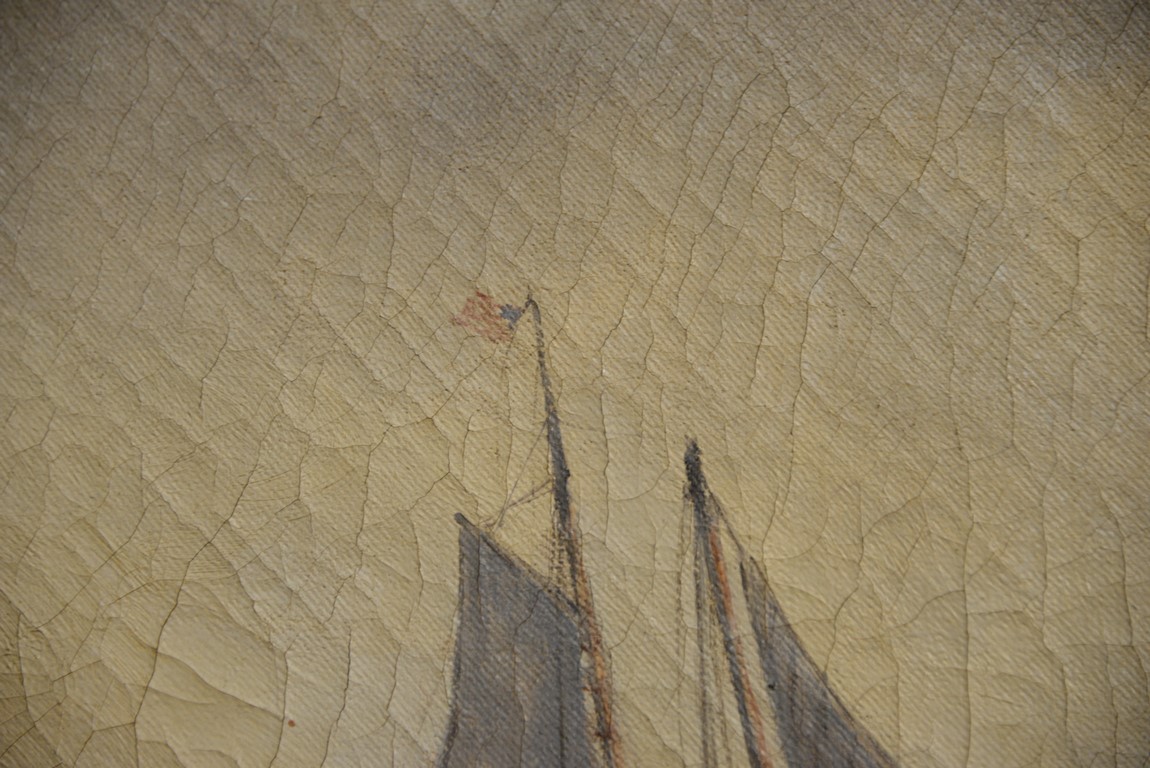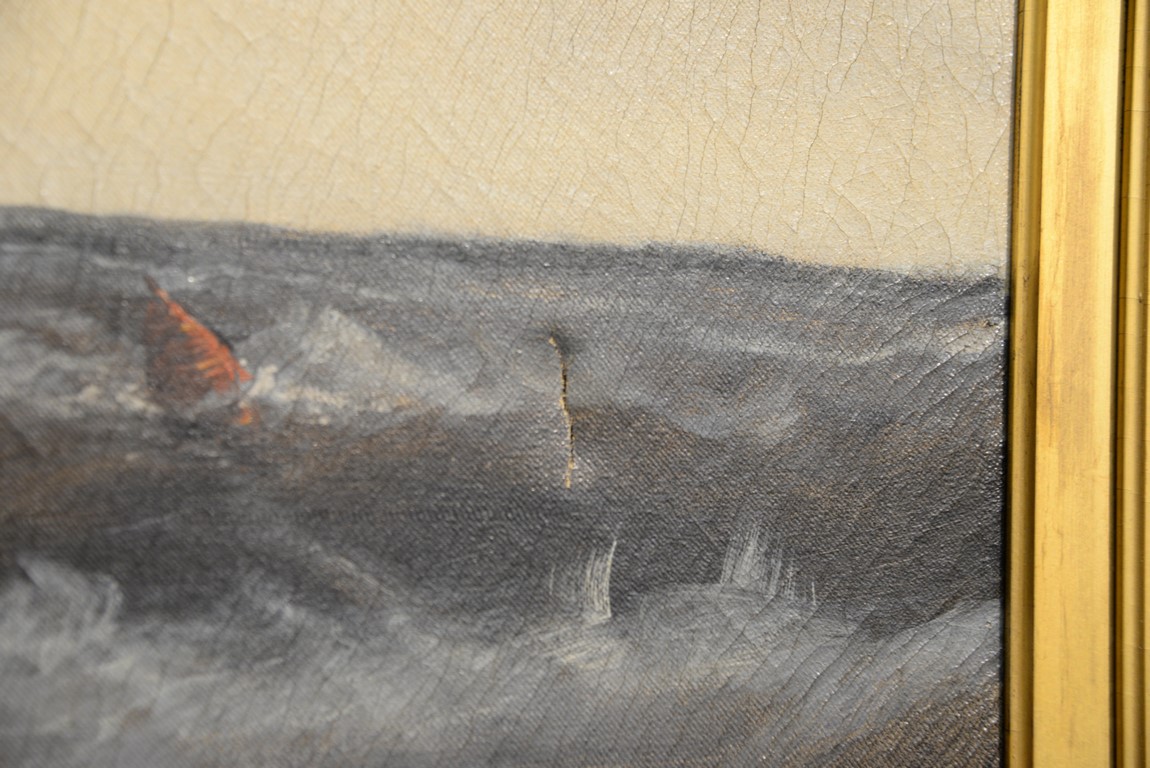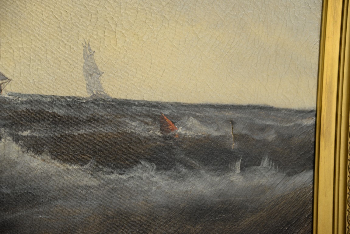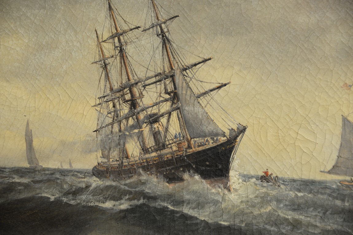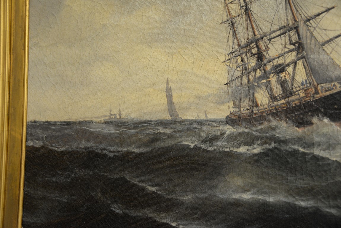Lot 135: 19th Century Ship Painting oil on canvas Foreground with three masted ship in rough seas Background with two masted ship fl…