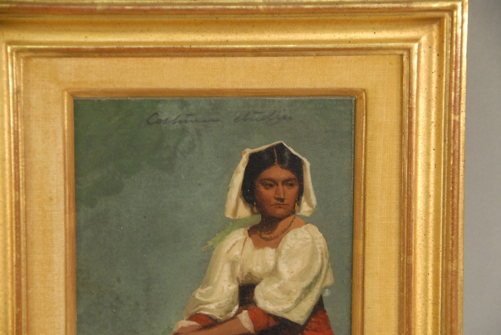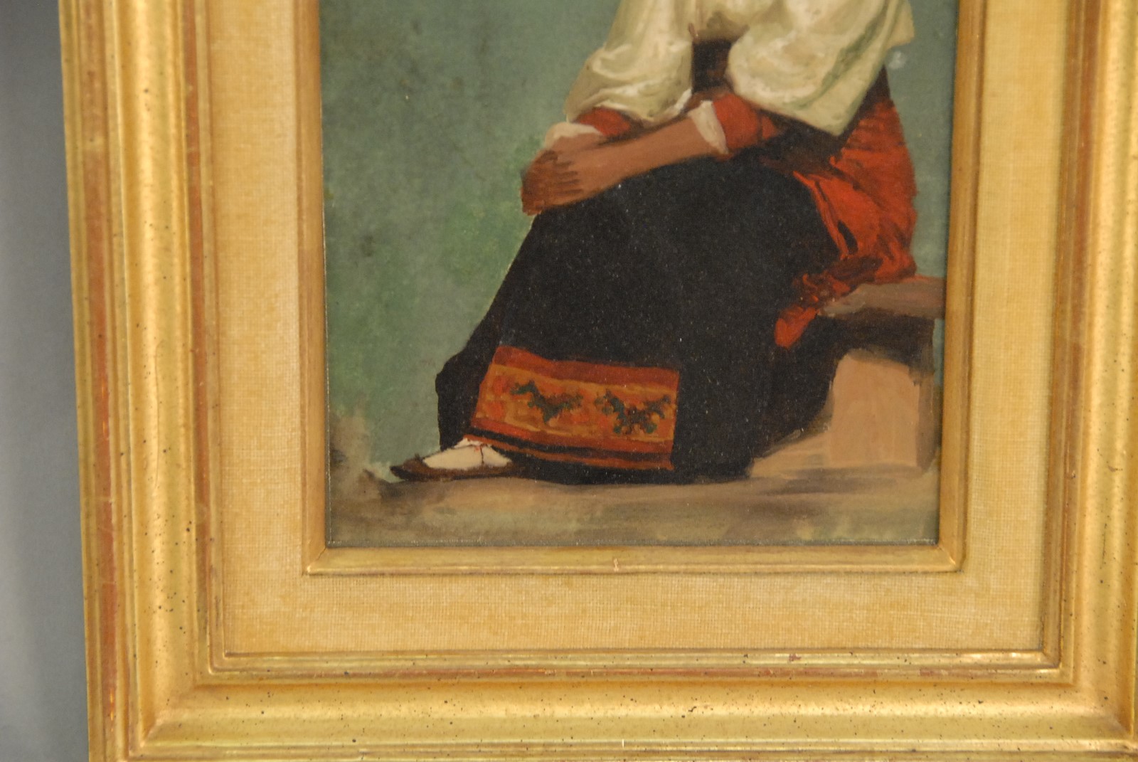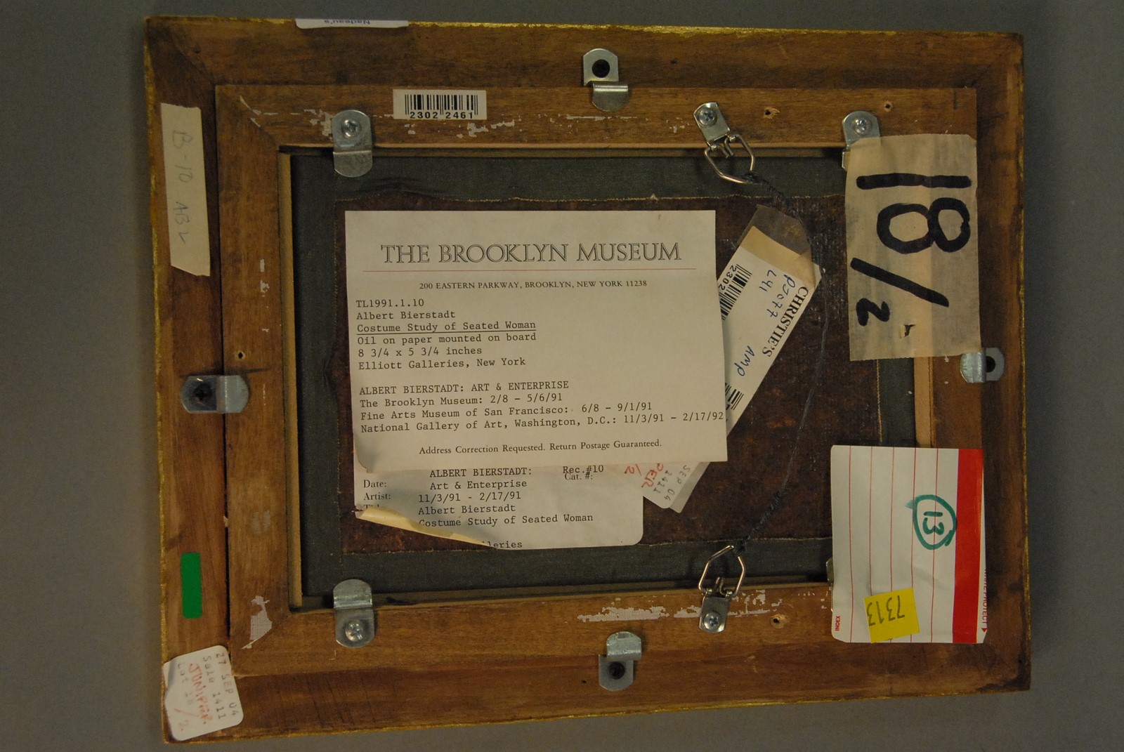 Lot 135: Albert Bierstadt 1830-1902 COSTUME STUDY OF SEATED WOMAN oil on paper mounted on board unsigned marked top center Costume Study’s labels on verso from The Brooklyn Museum and National Gallery of Art
