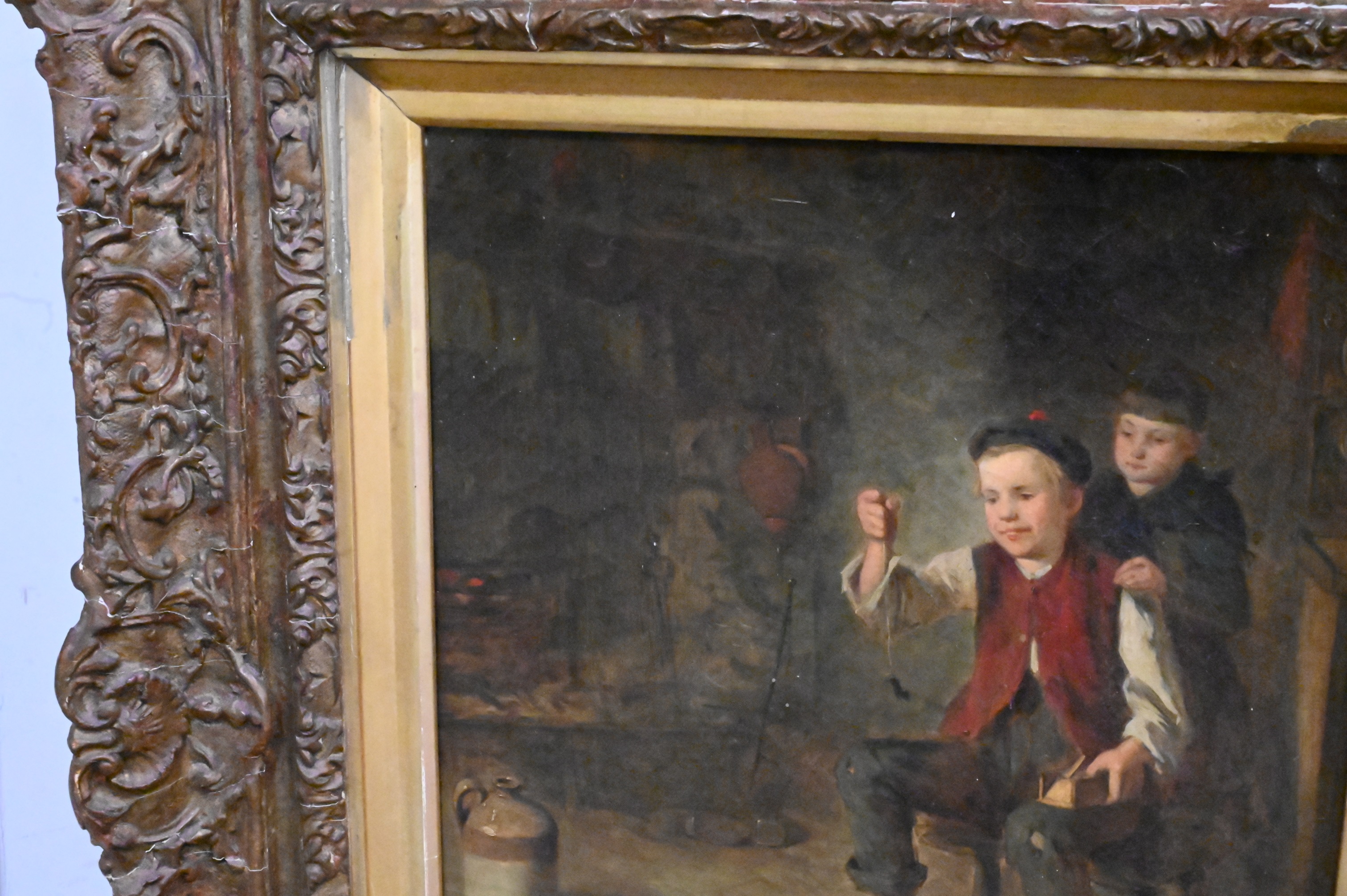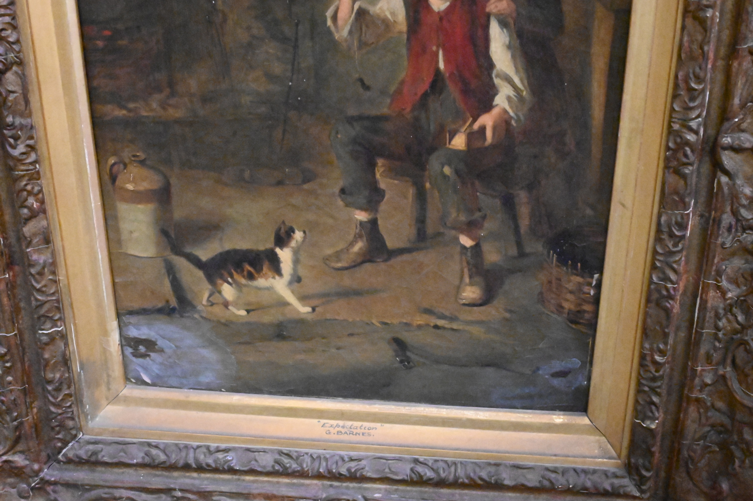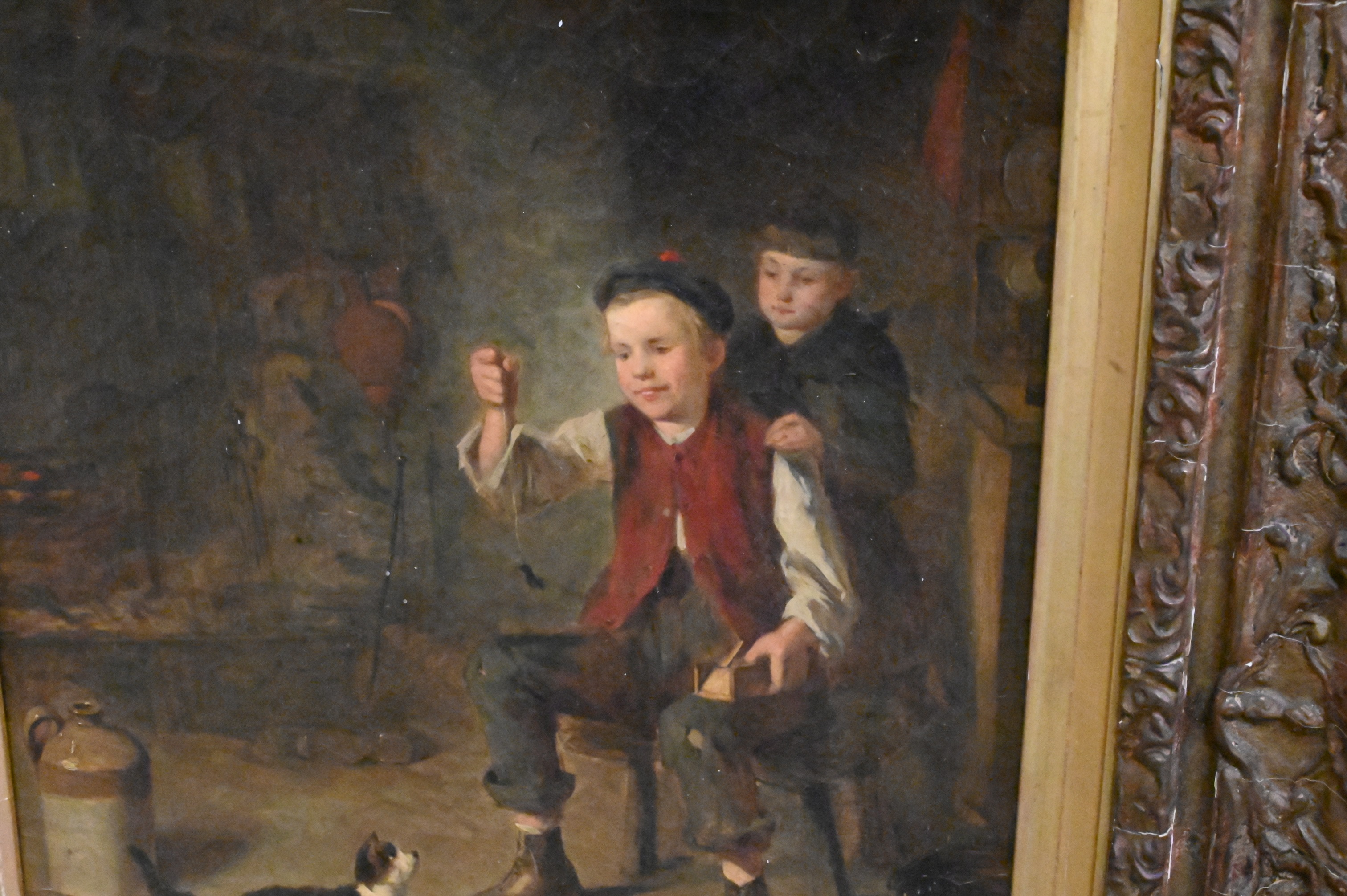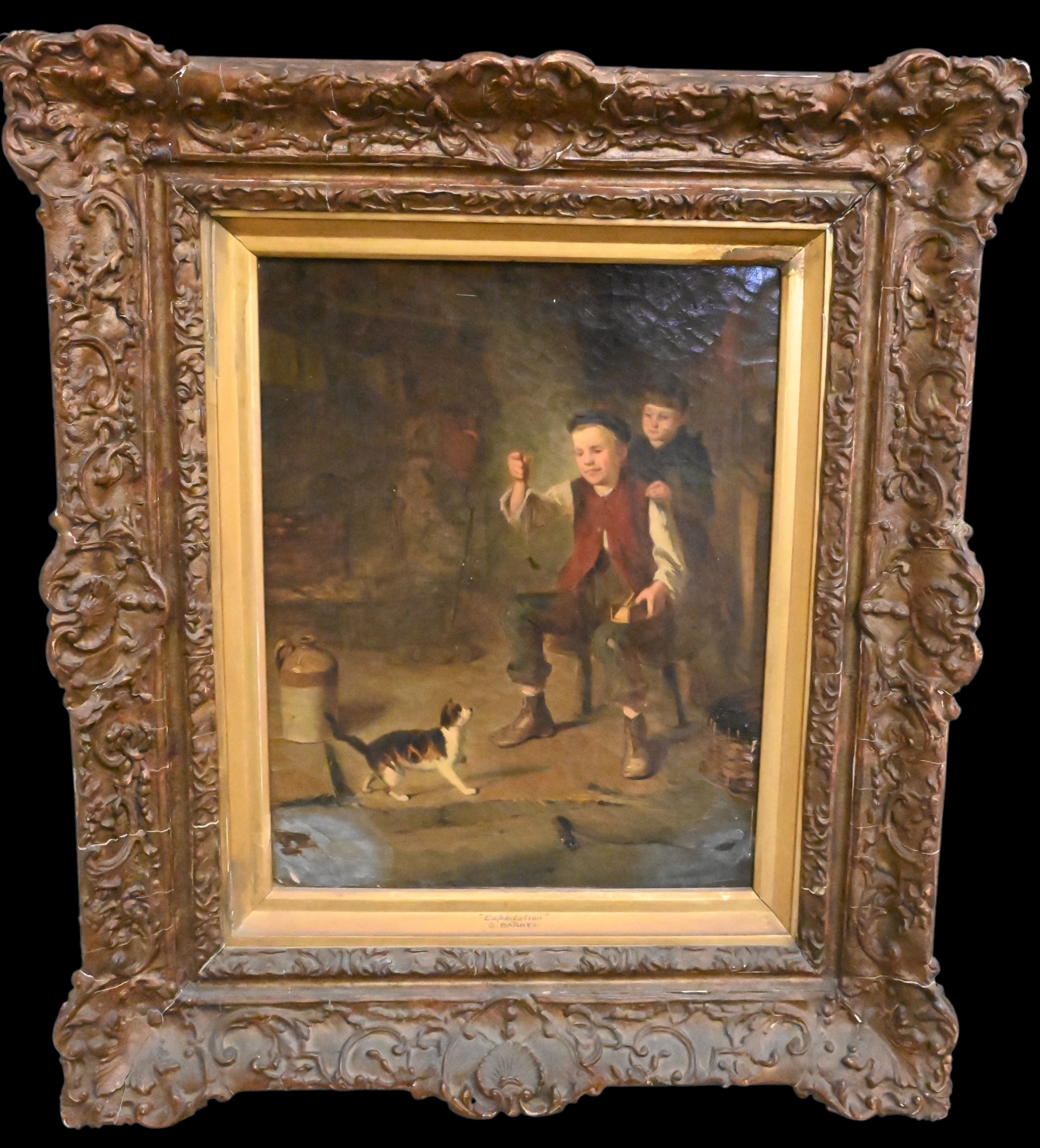 Attributed to Gertrude Jameson (Jenkins) Barnes (American, 1865 -1939), “Expectations”, interior scene with two young children playing with a cat, oil on canvas, 18″ x 14 1/4″.