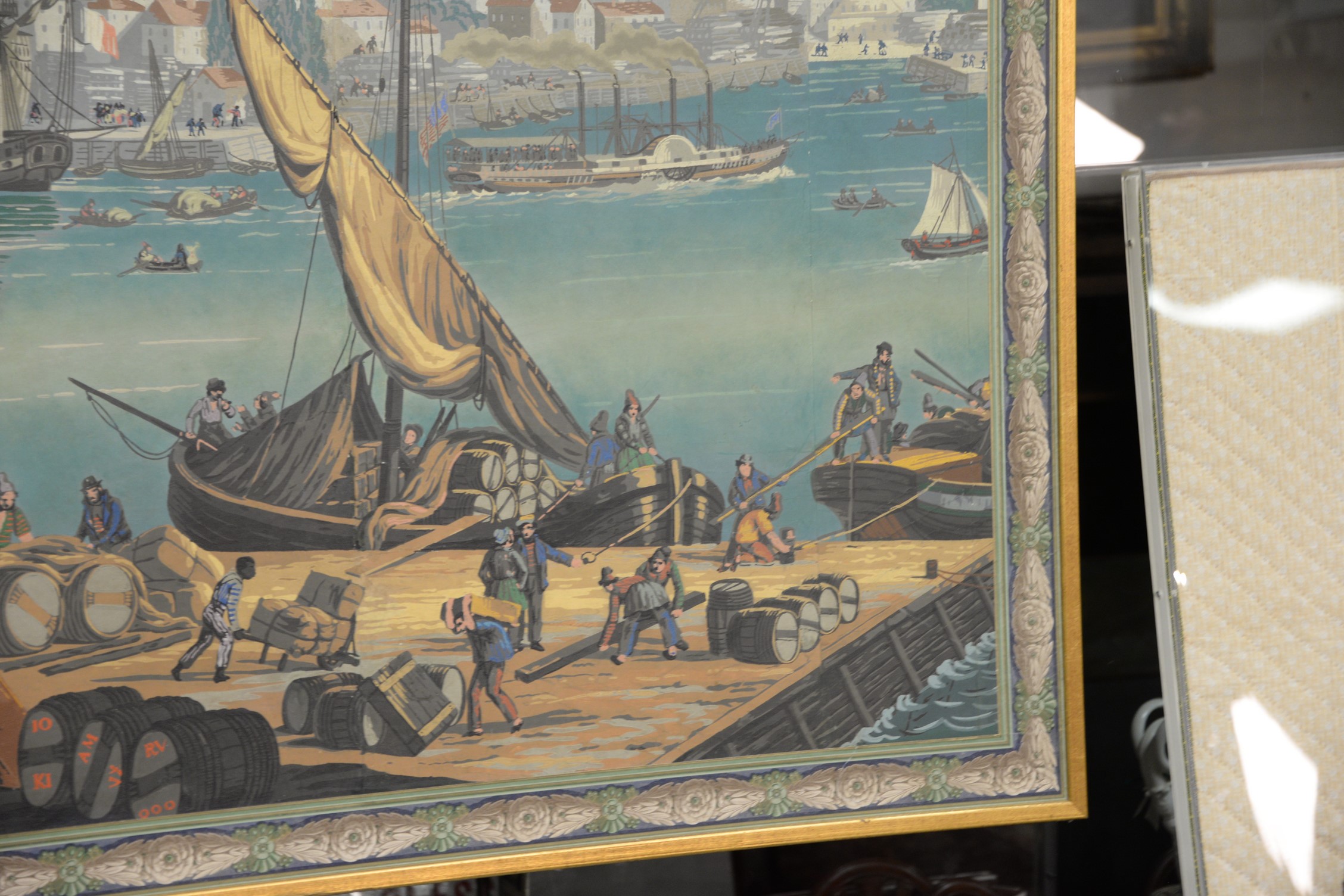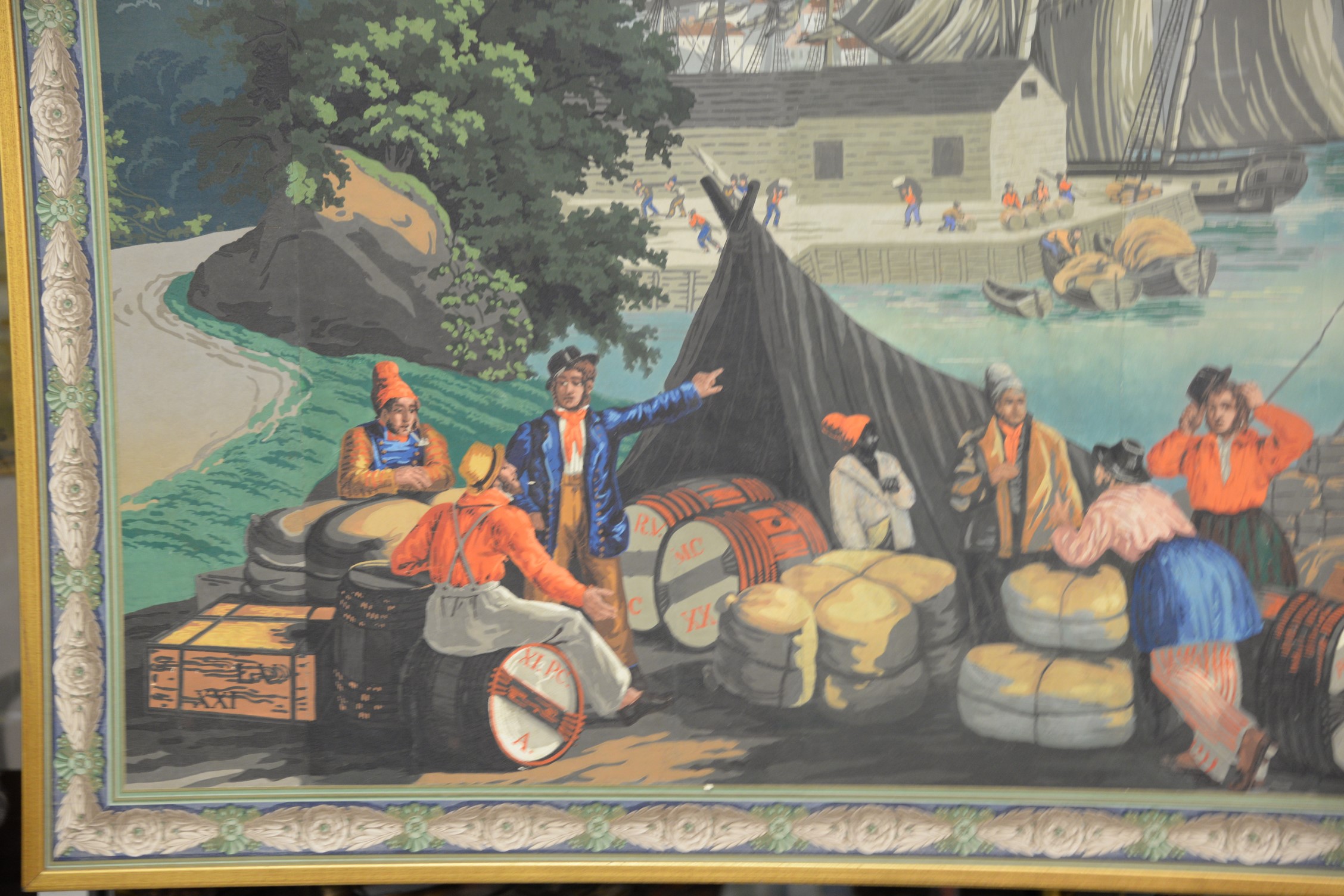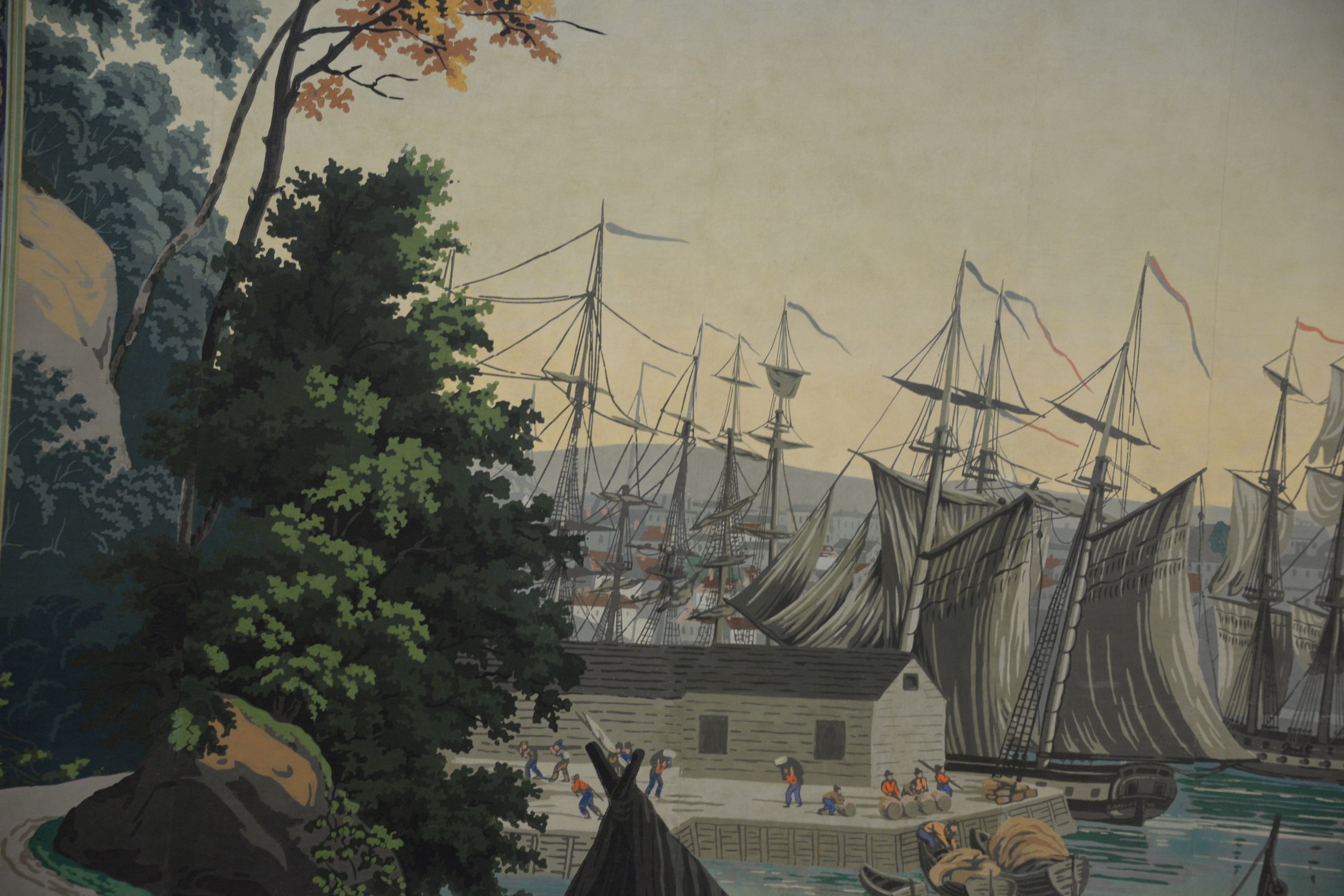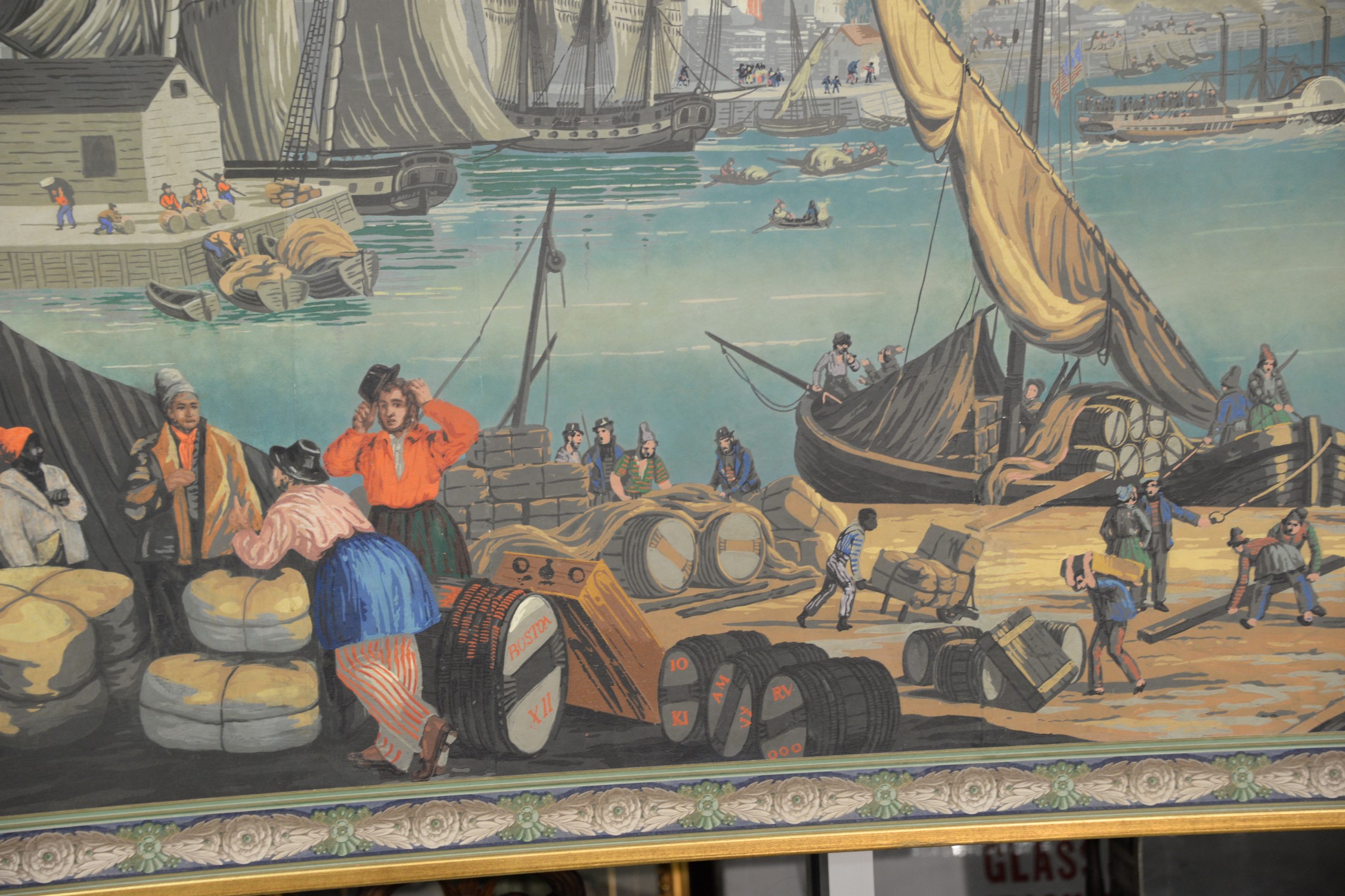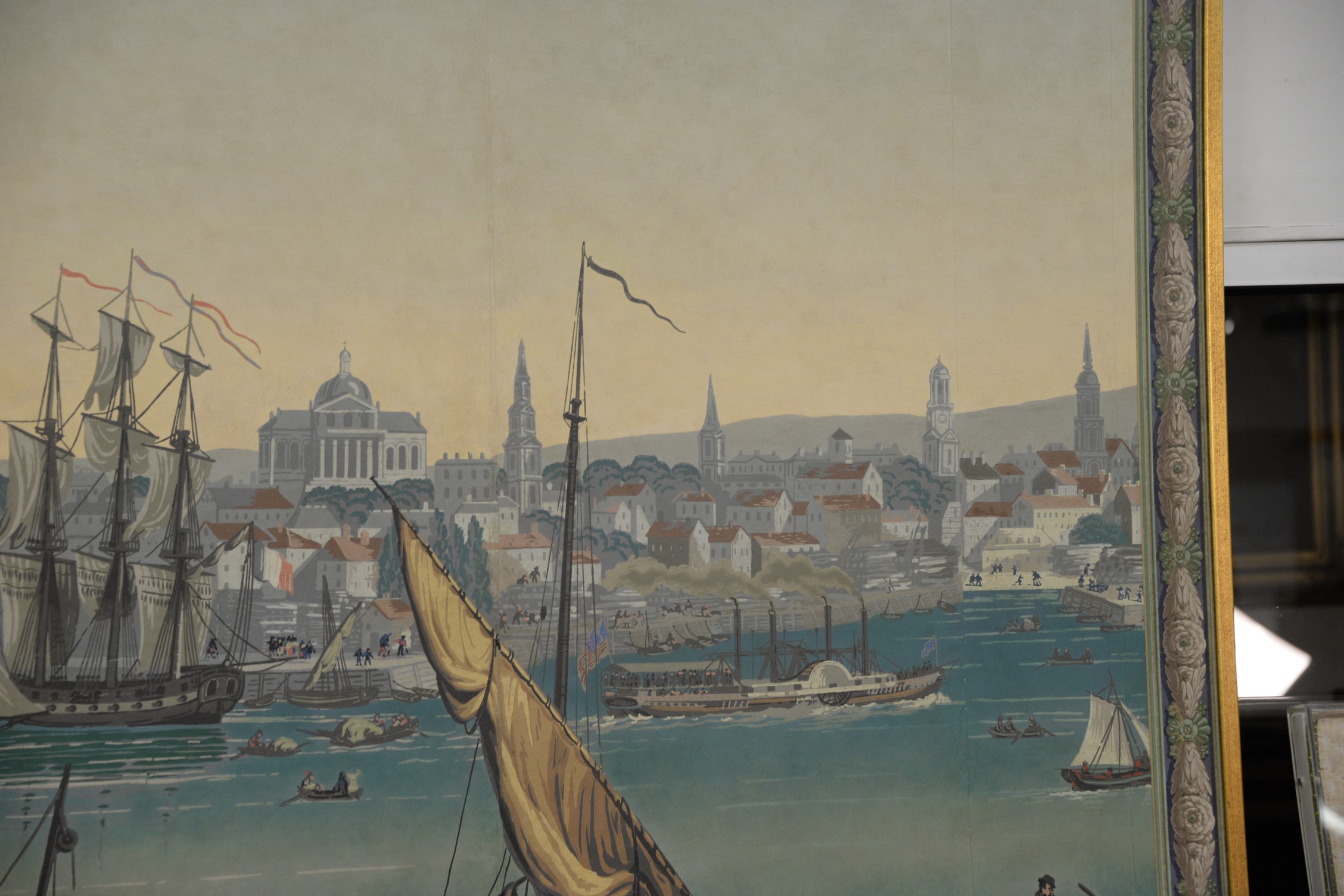 Attributed to Jean Zuber France Designed after Jean-Julien Deltil 1791-1863 group of mounted wallpaper panels depicting Boston Harbor, 19th century, in the foreground a bustling wharf with one barrel marked Boston XII and ships being unloaded oil on wallpaper several sections wide laid on board This scene was originally 49 ft. long, made in 1834. Jacqueline Kennedy had an antique vue de l’Amerique Nord 1834 designed Zuber wallpaper installed in the diplomatic reception room of the White House. 63 x 94 Provenance: Property from Credit Suisse’s Americana Collection