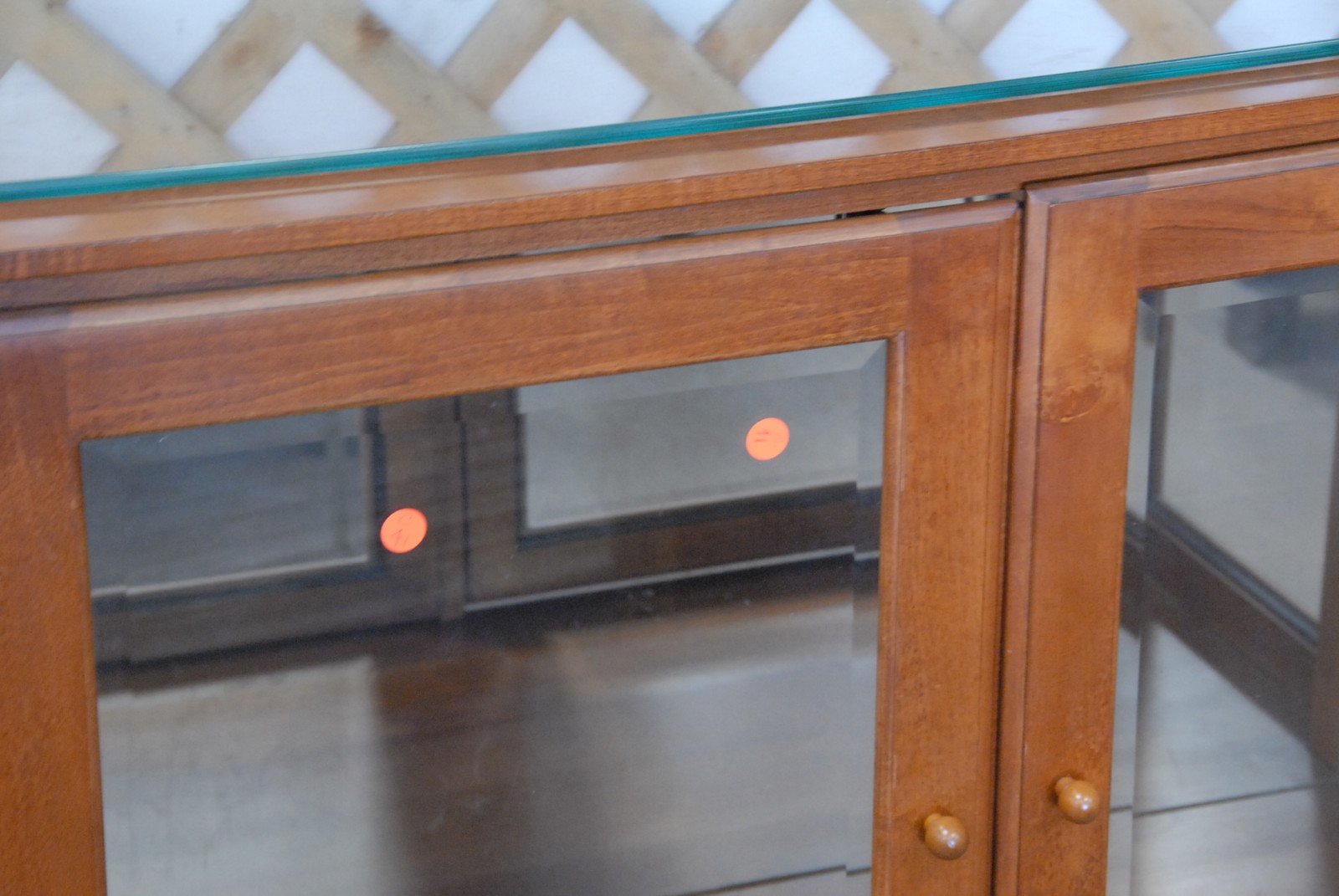Contemporary curio cabinet with beveled glass doors, glass shelves, and drawer