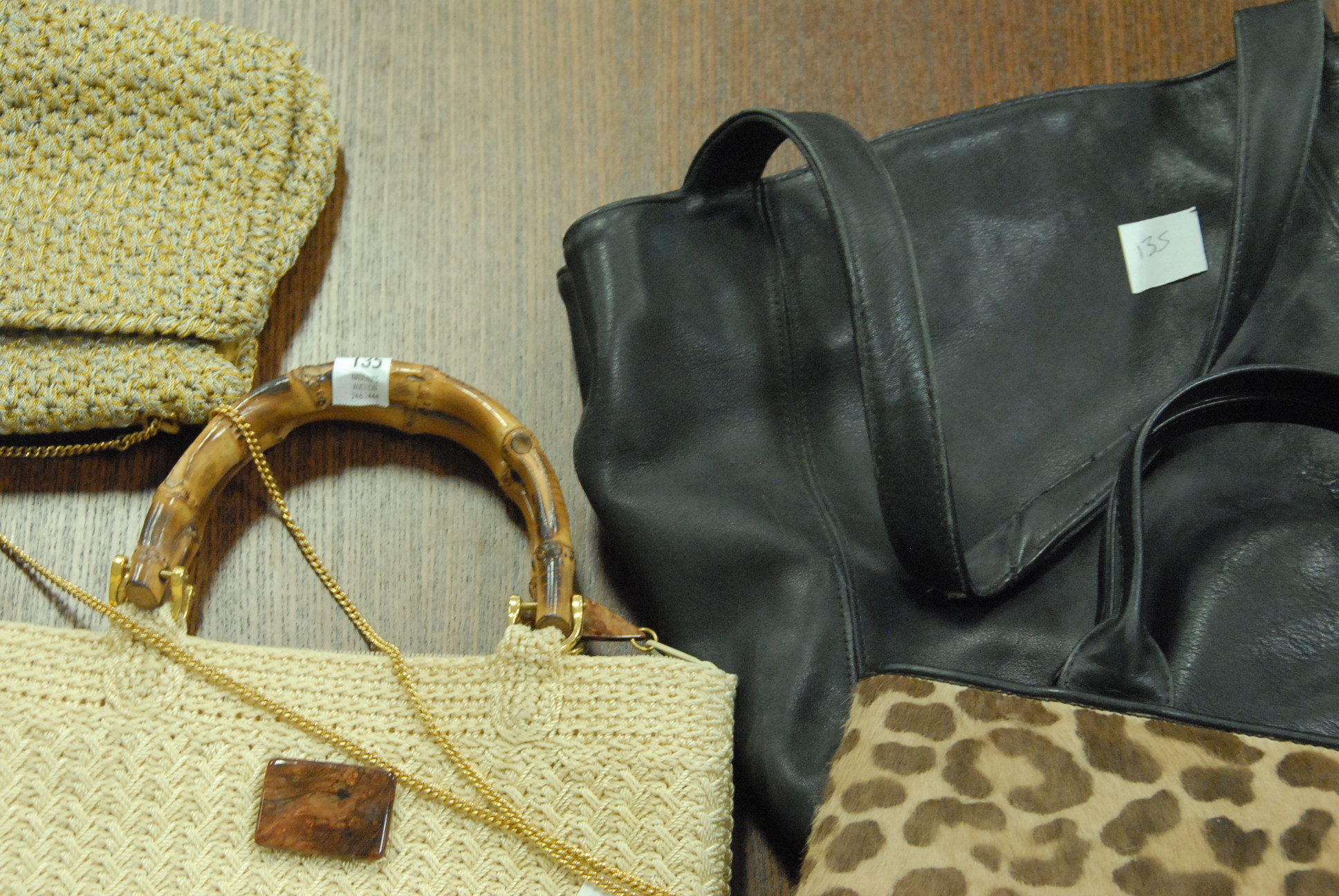 Four purses including a leather Coach, faux leopard handbag, woven mesh Sax Fifth Avenue, and a Christian Livingston.
