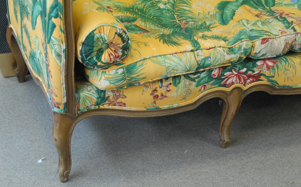 French style upholstered sofa in jungle style upholstery, lg. 7’4