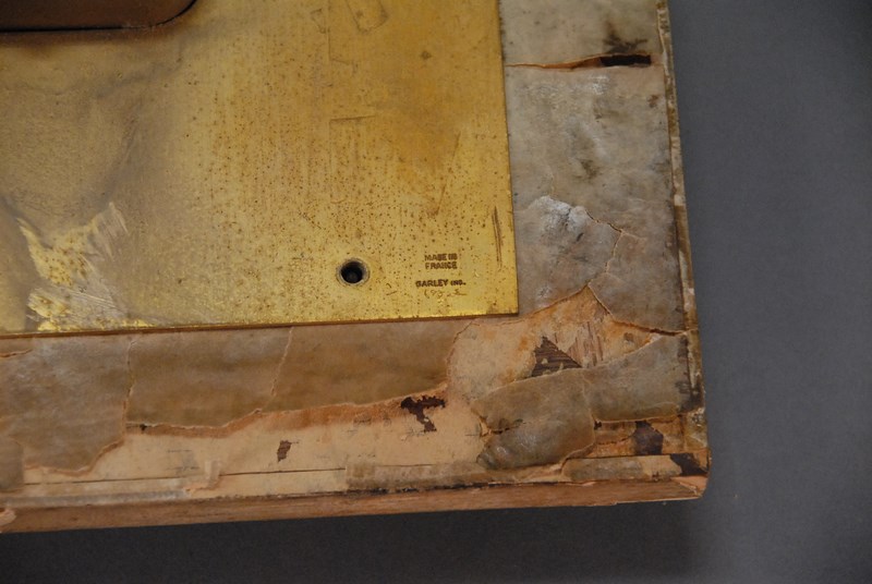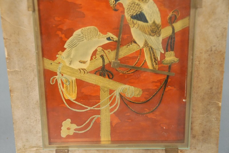 Lot 135: Garley Inc. bronze clock with hand painted dial with parrots mounted on wood plaque, signed Garley Inc. Made in France wood plaque paper covering as is. clock 9 1/2 x 8