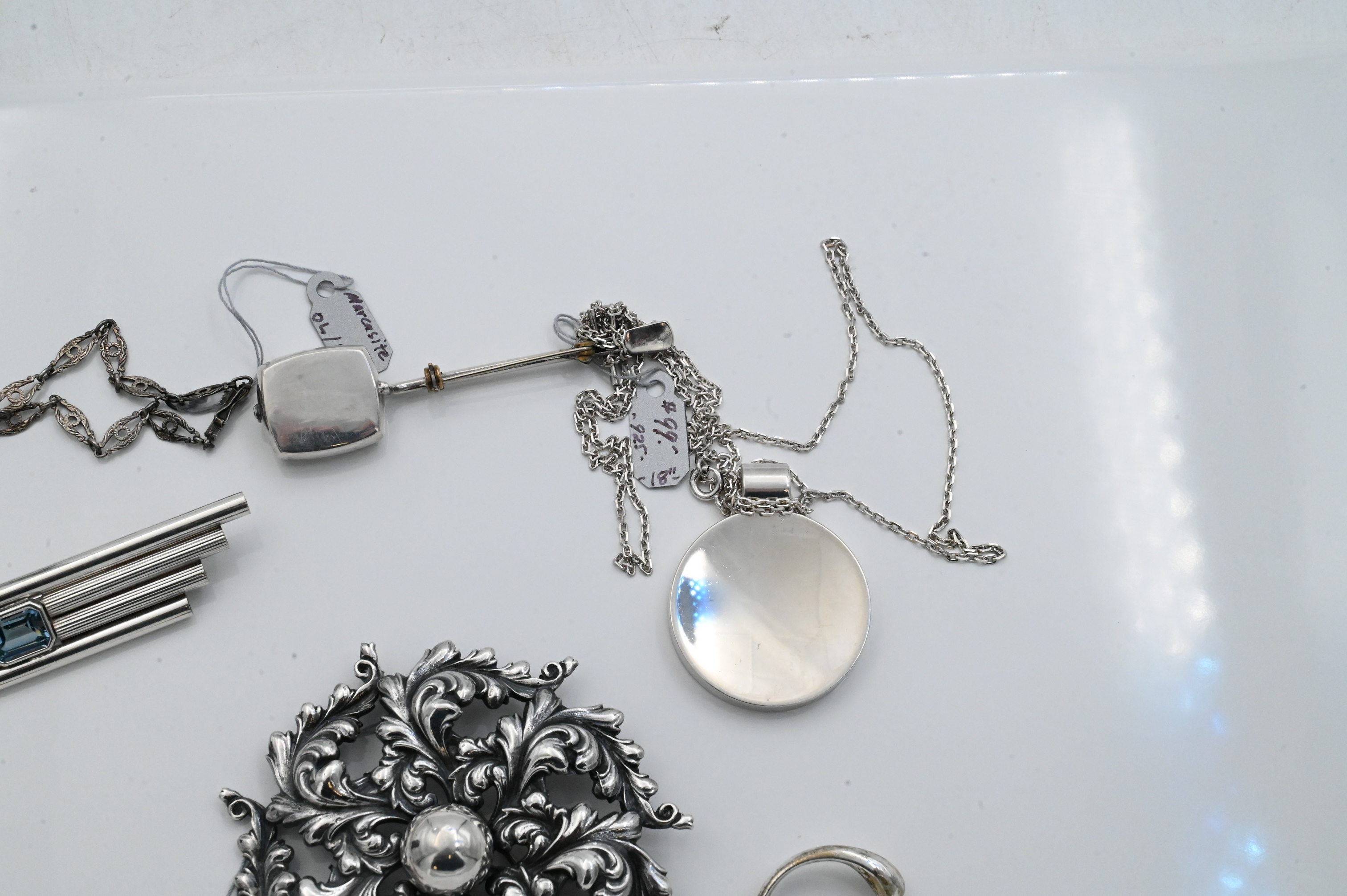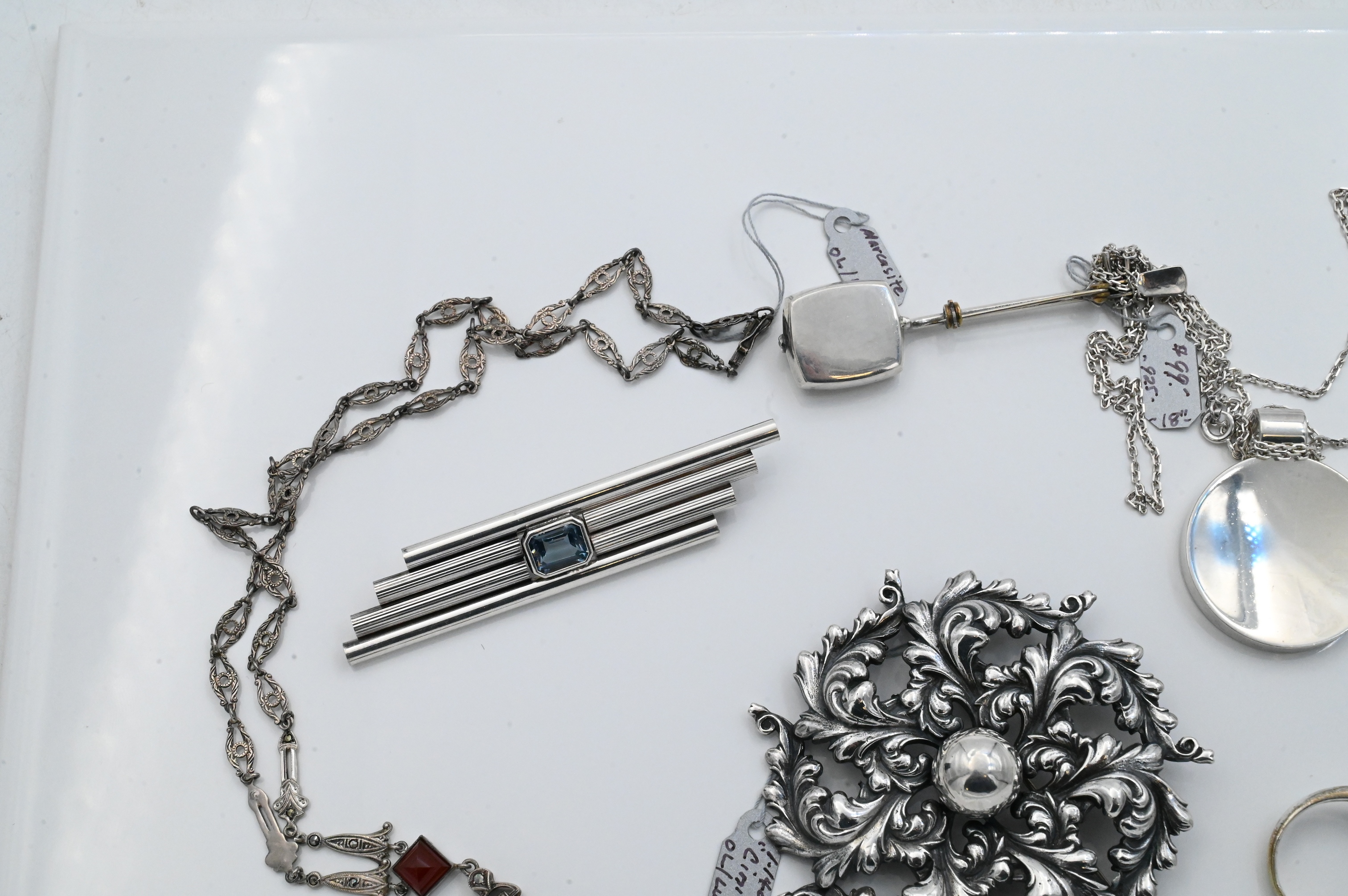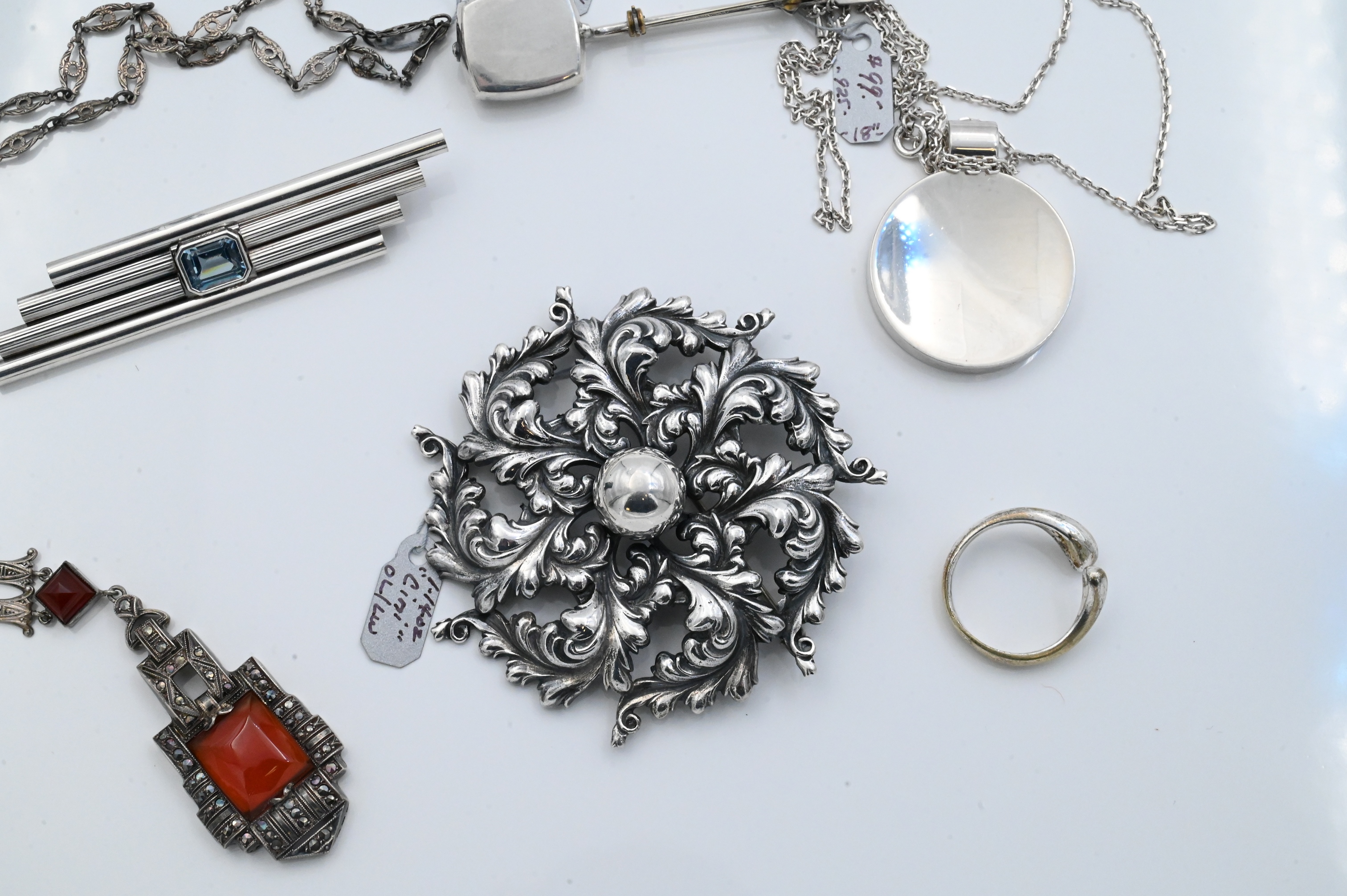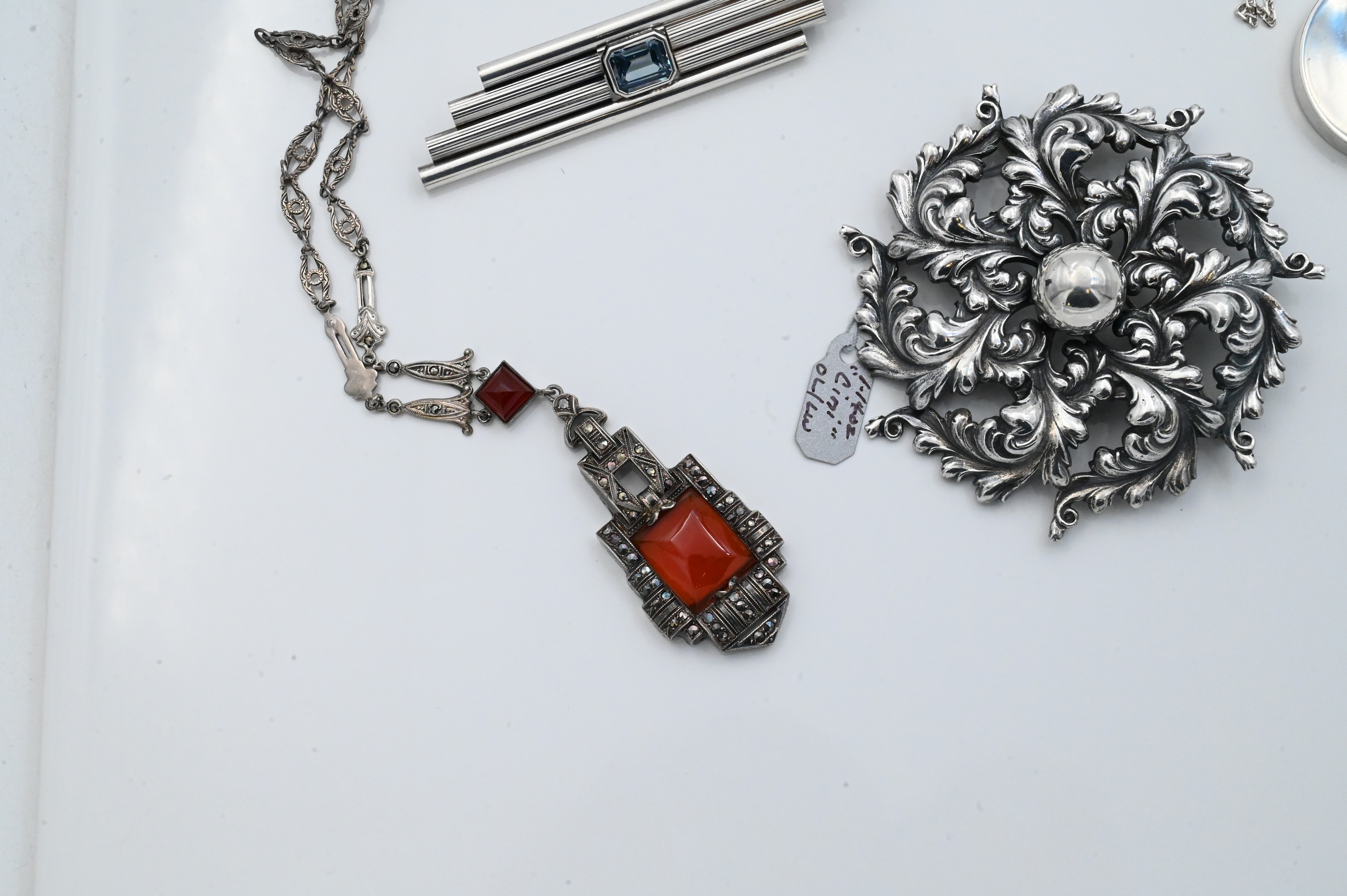Including seven pieces: a large repoussé floral brooch marked “Cini Sterling,” a modernist brooch set with a rectangular blue stone marked “925,” a Christofle sterling pendant on chain, a Tiffany & Co. sterling silver ring, a sterling key-form brooch, an Art Deco style necklace set with carnelian and marcasite, and a filigree necklace marked “835.”