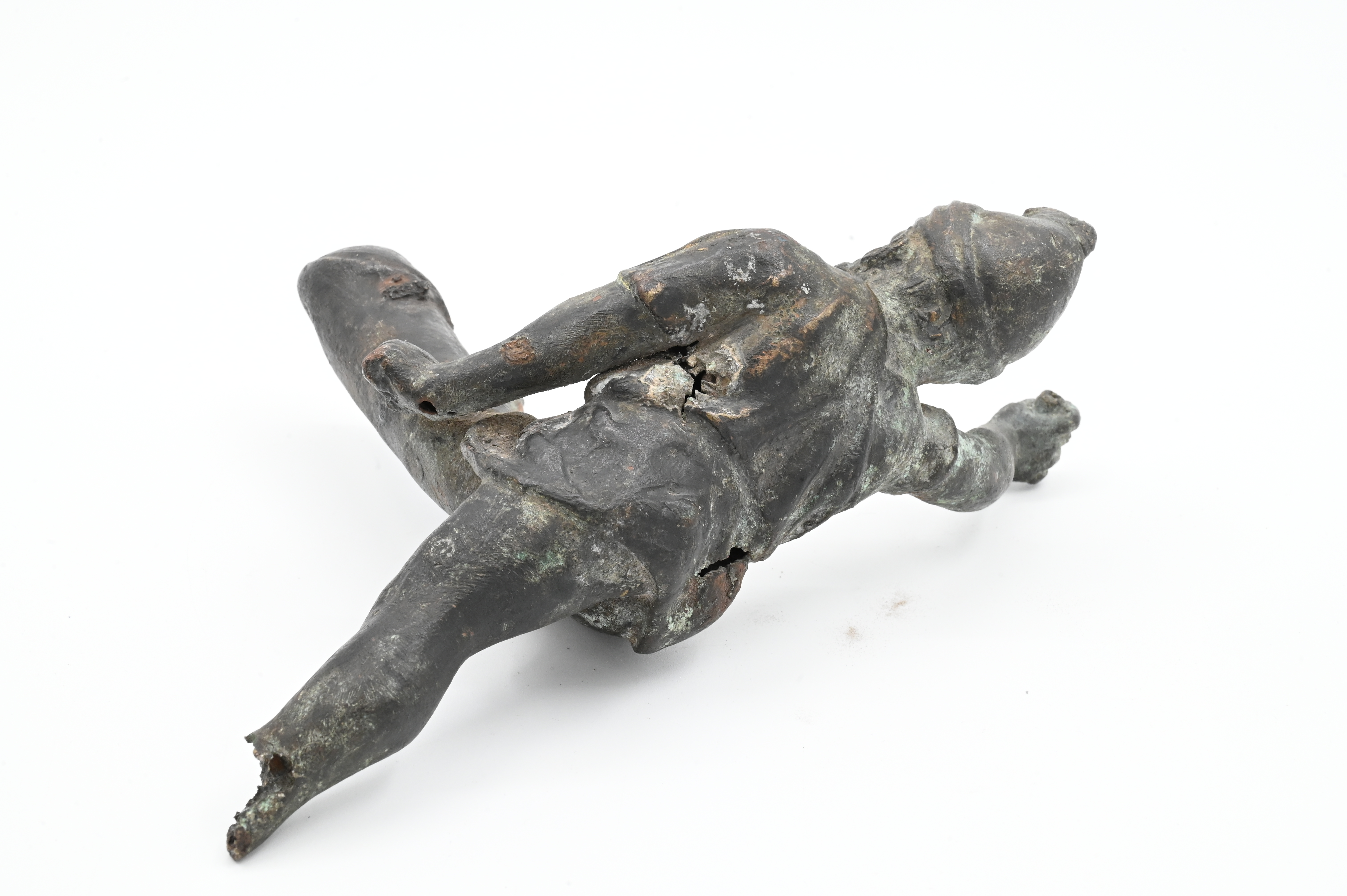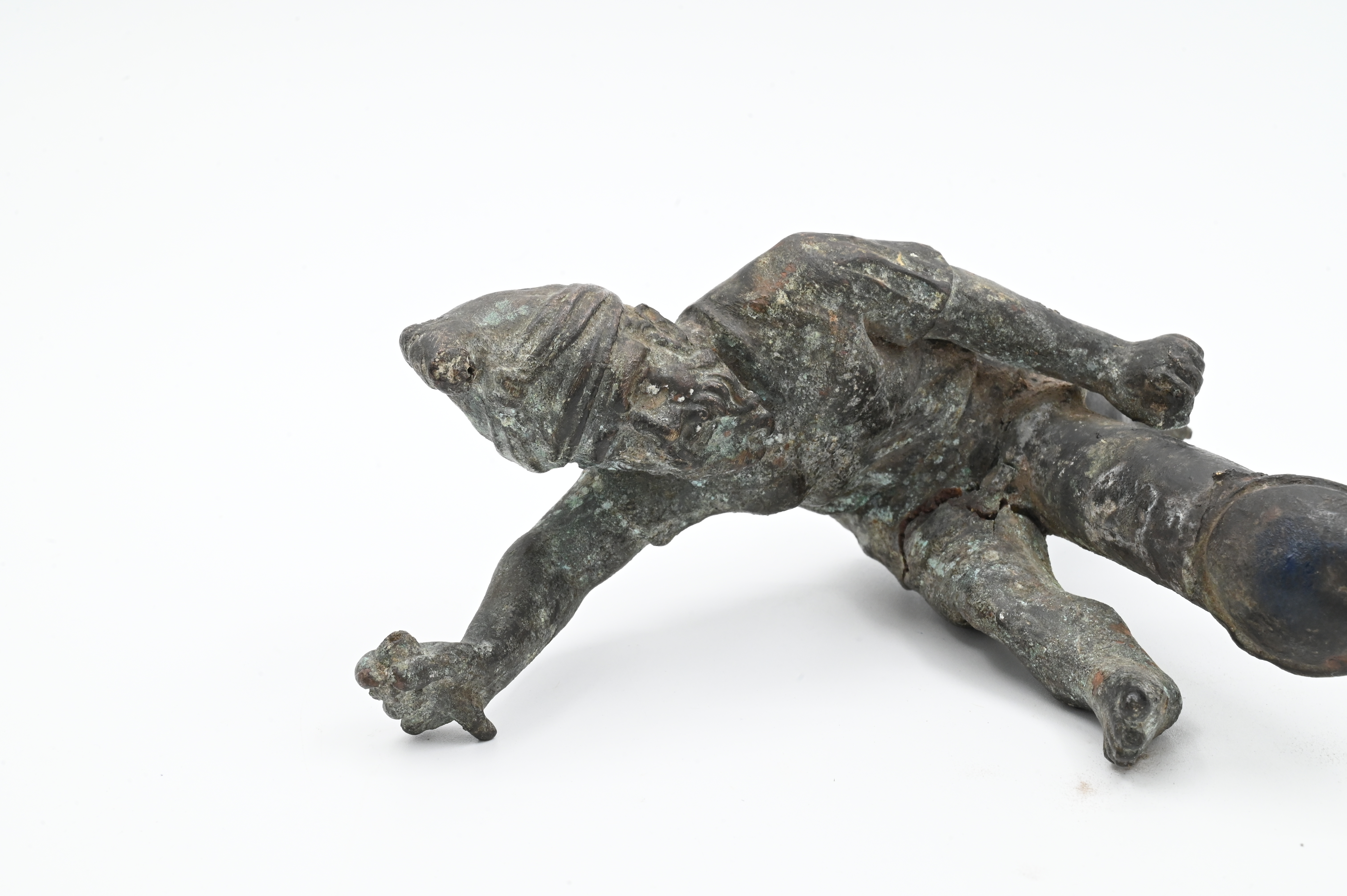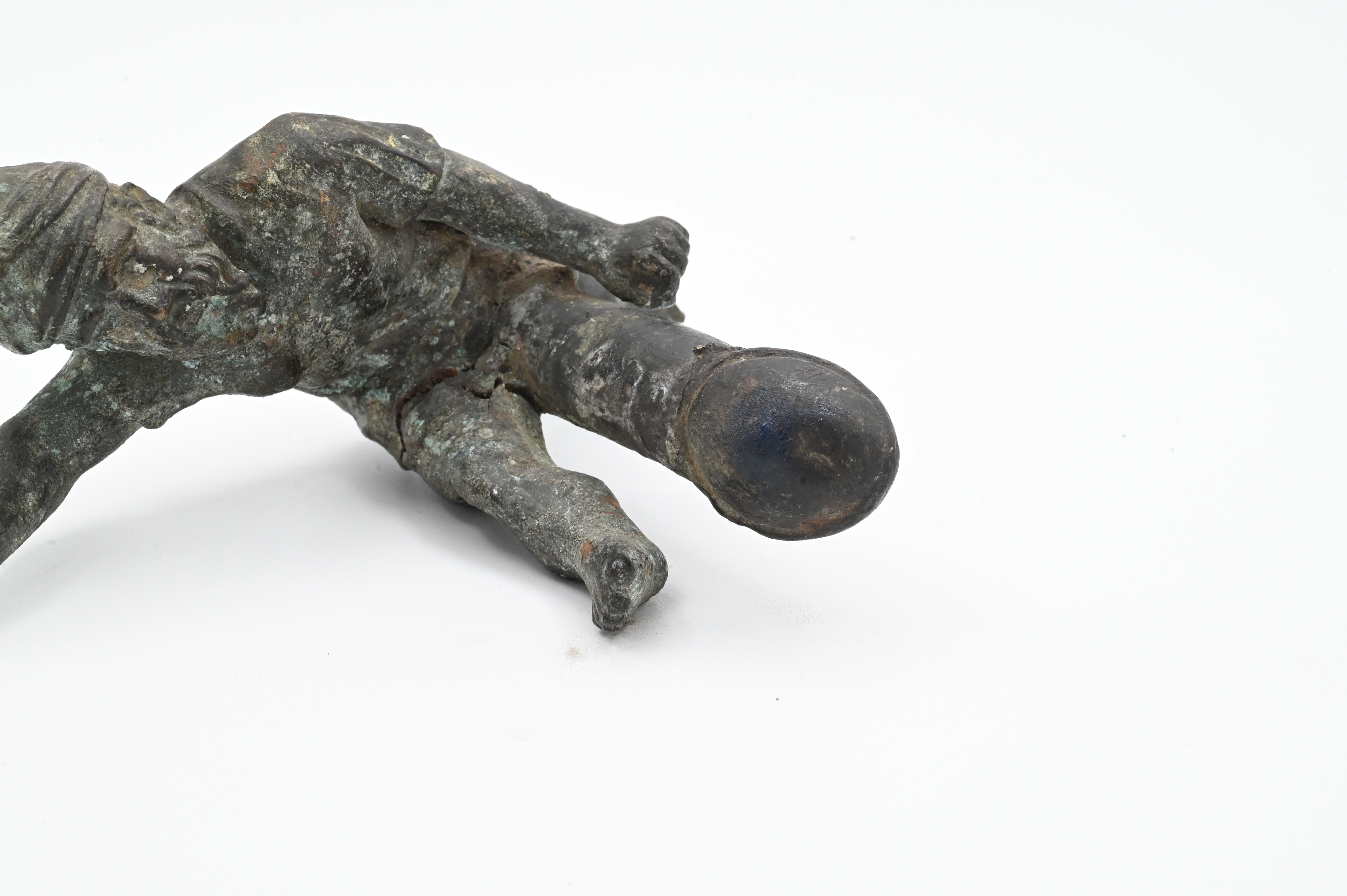 cast bronze figure depicting a Greek dwarf in a Phrygian/Thracian helmet, arms and legs outstretched to reveal exaggerated phallus, some losses throughout (was likely once wielding a sword)