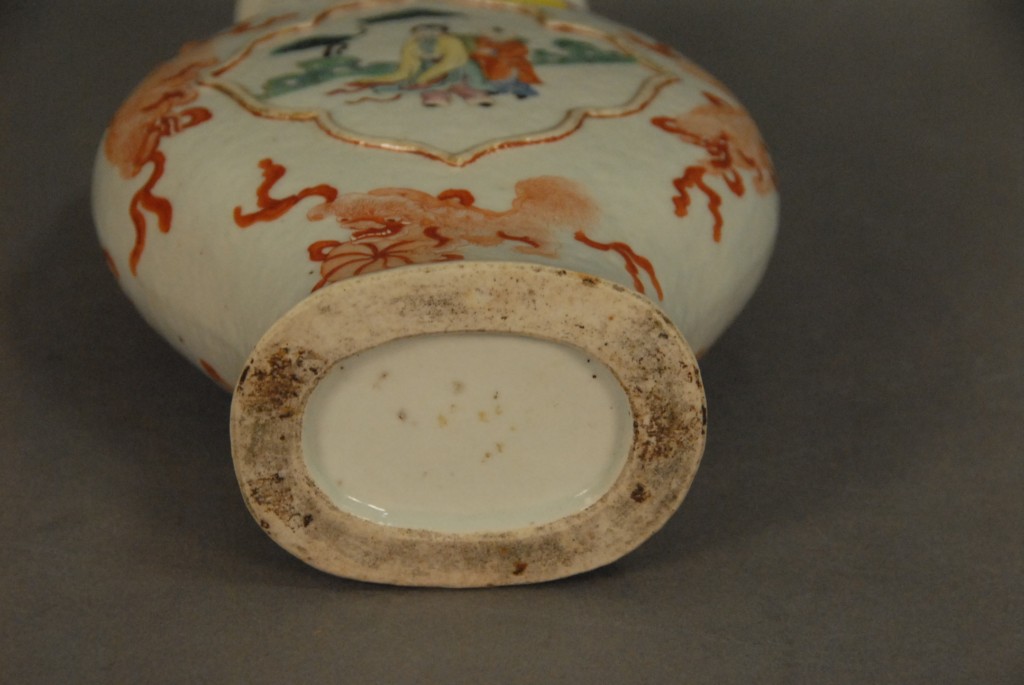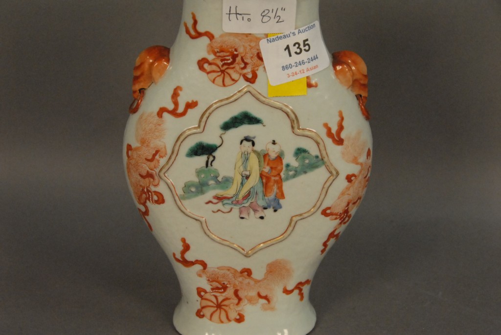 Lot 135: Iron red dragon vase having painted panel on each side and elephant molded handles, ht. 8 1/2.