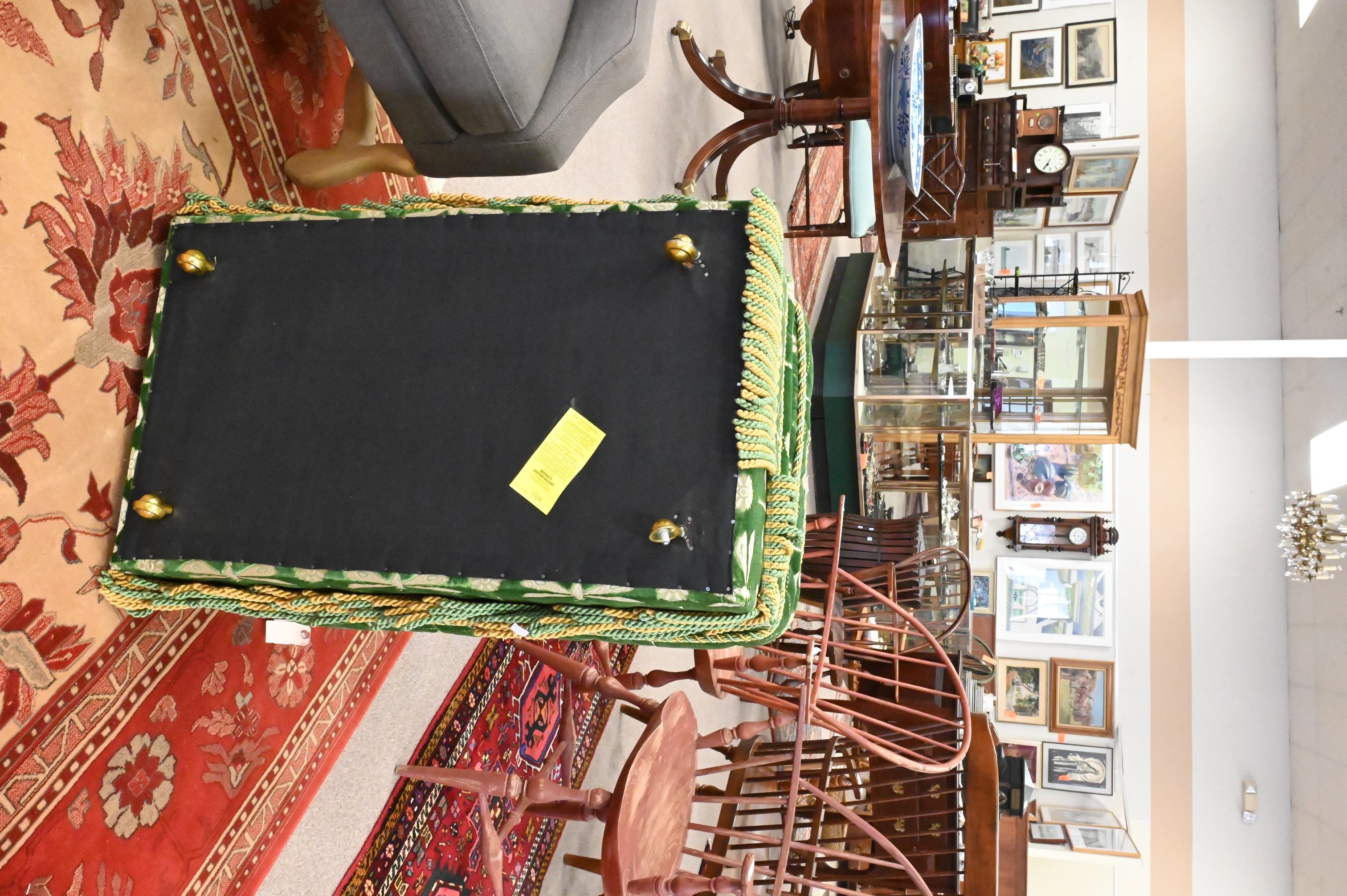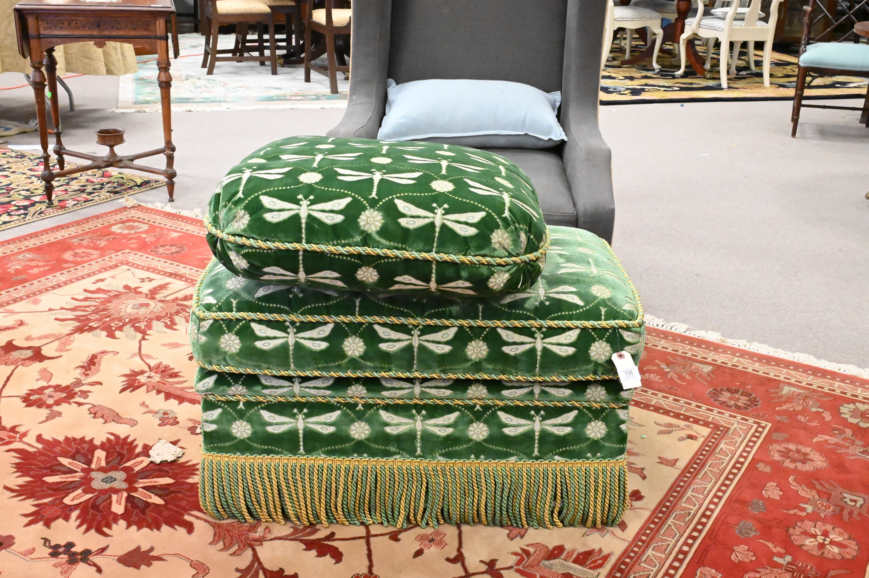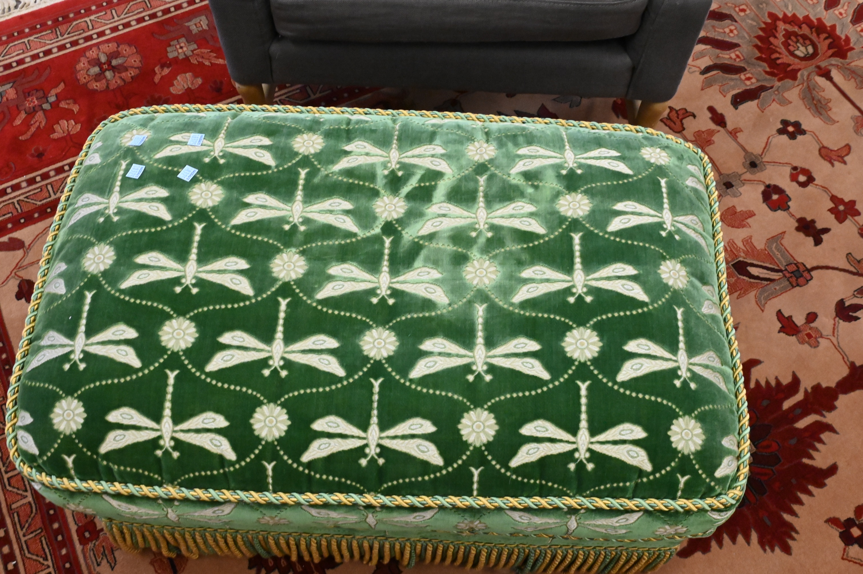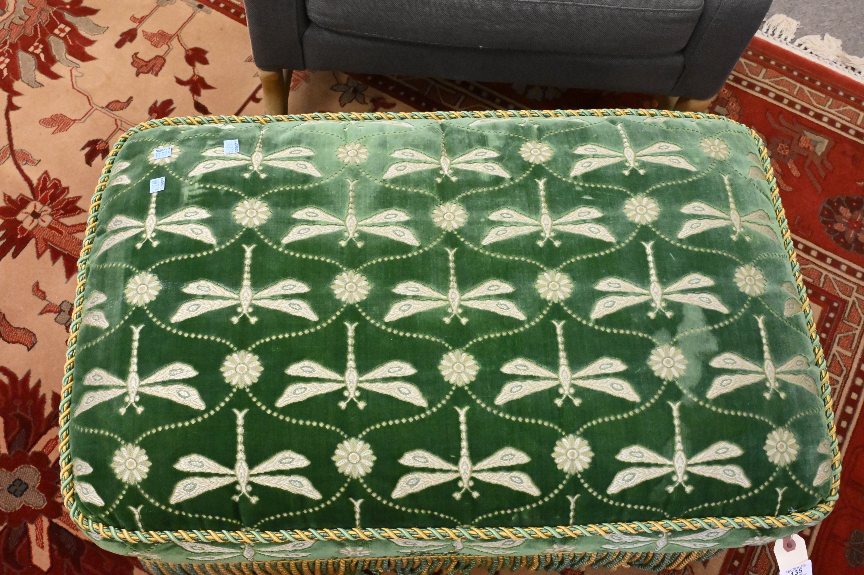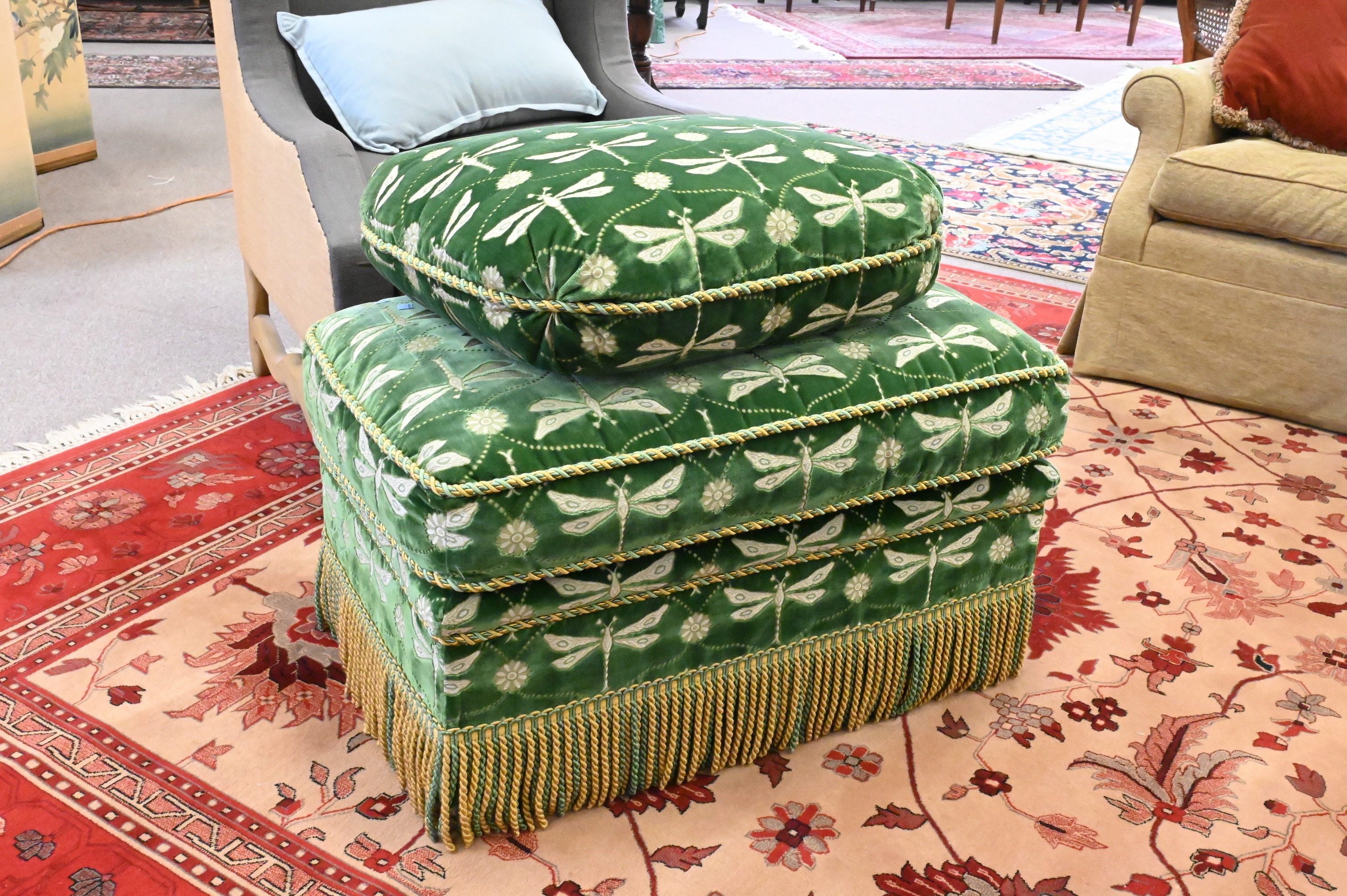 in green velvet upholstery and repeating dragonfly embroidered motif, bolster pillows, ending in braided trim fringe skirts