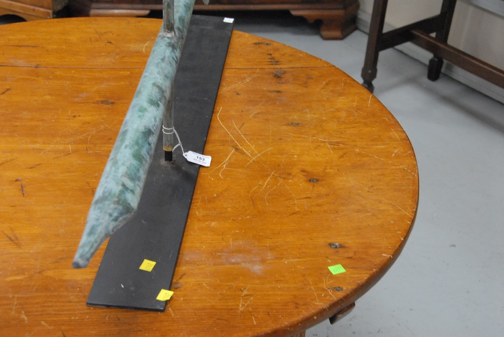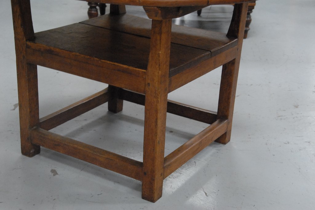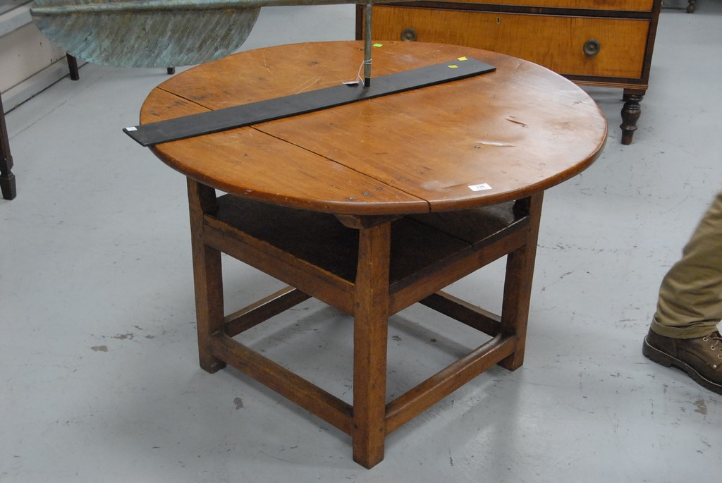Lot 135: Primitive chair table with round top on base with hickory square legs and box stretchers. ht. 26 1/2in. dia. 40in.