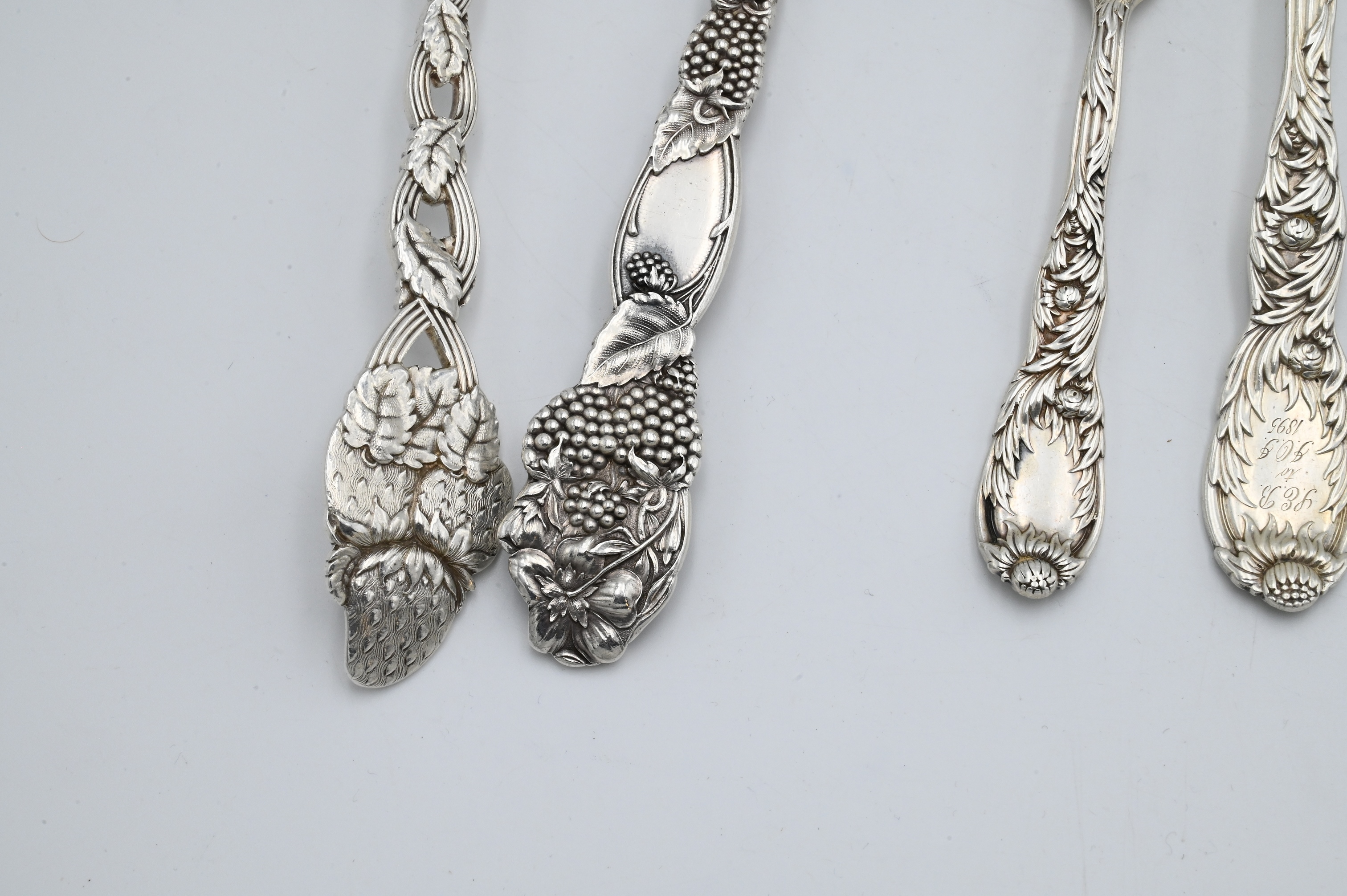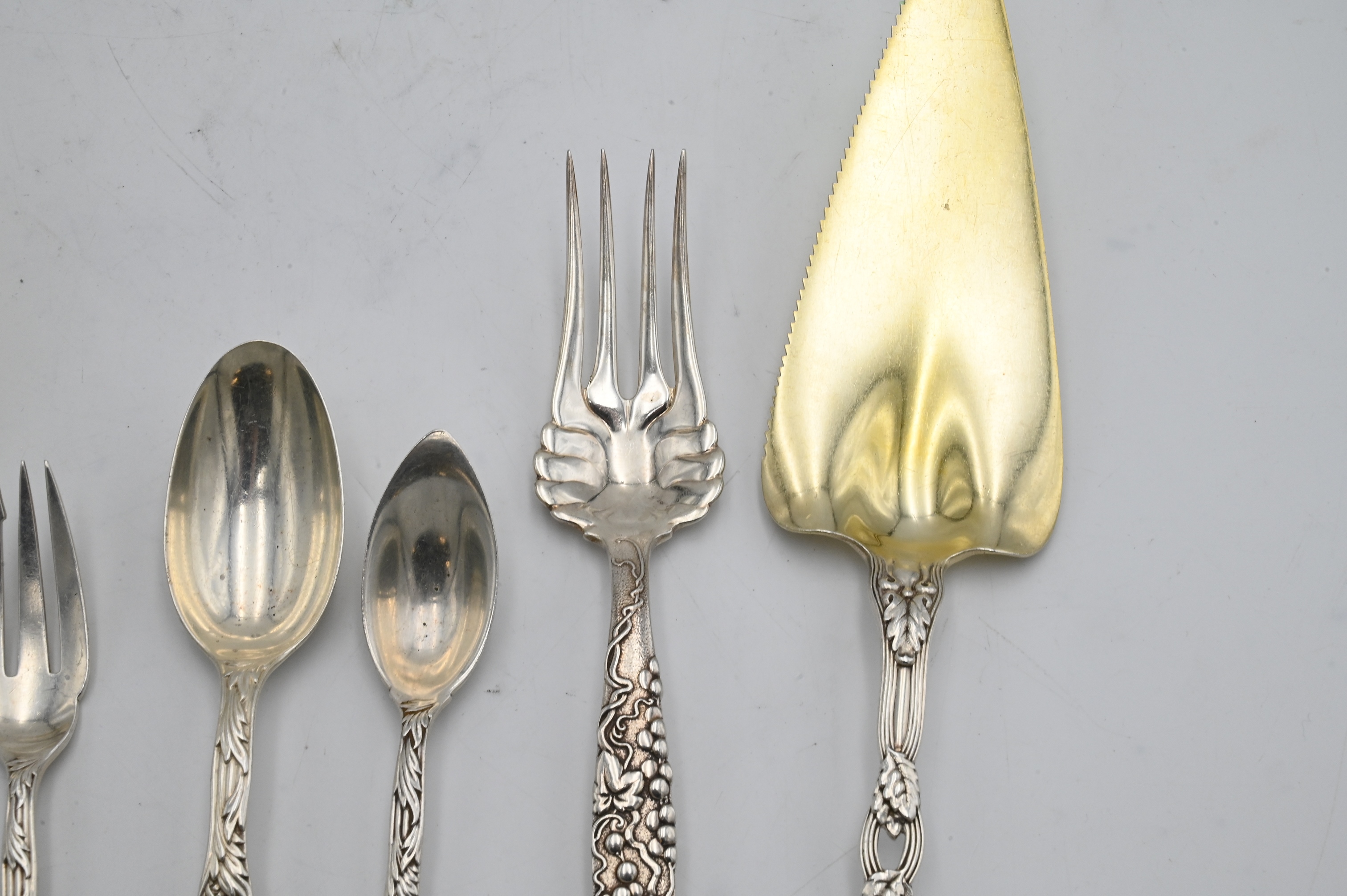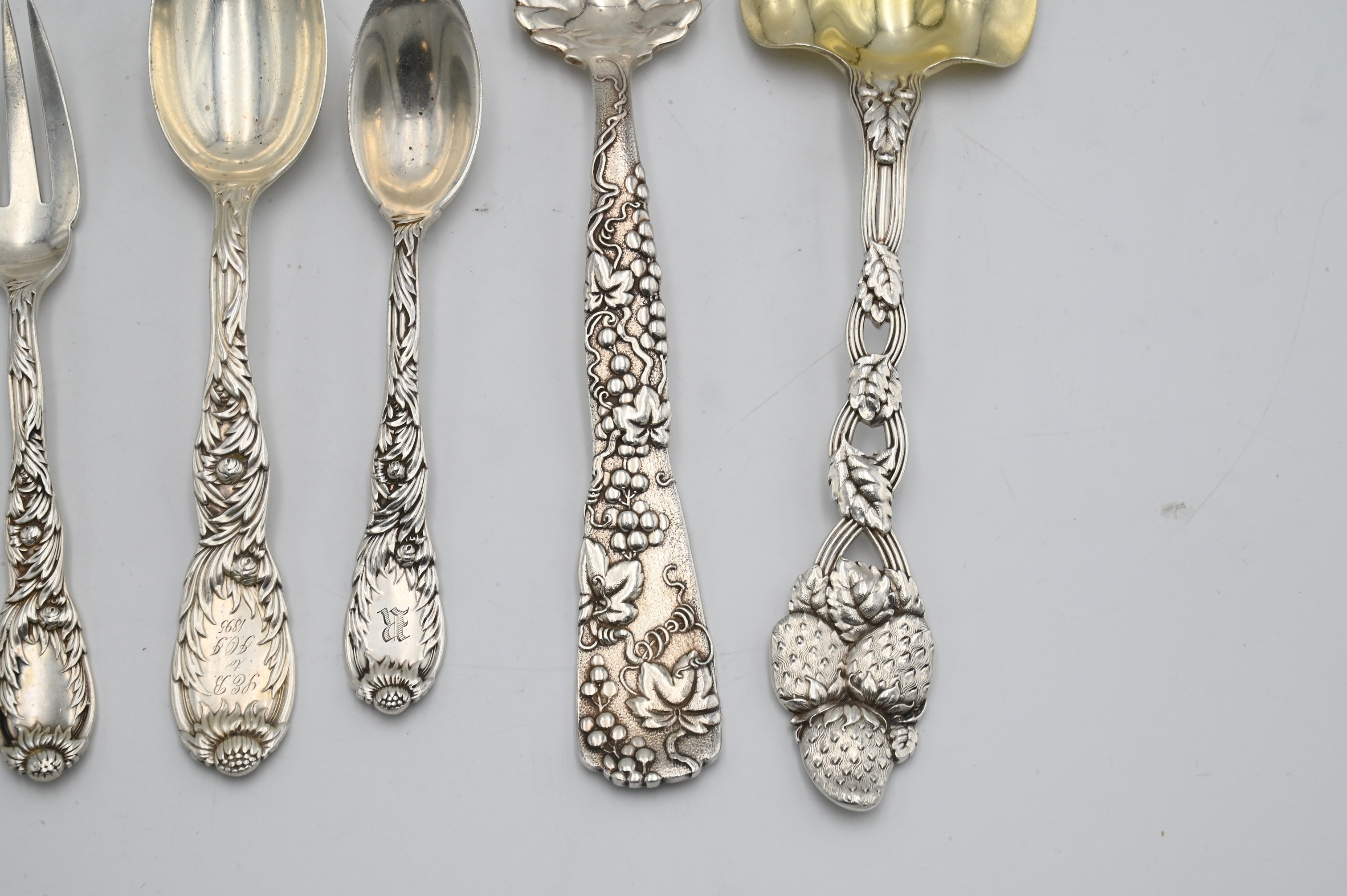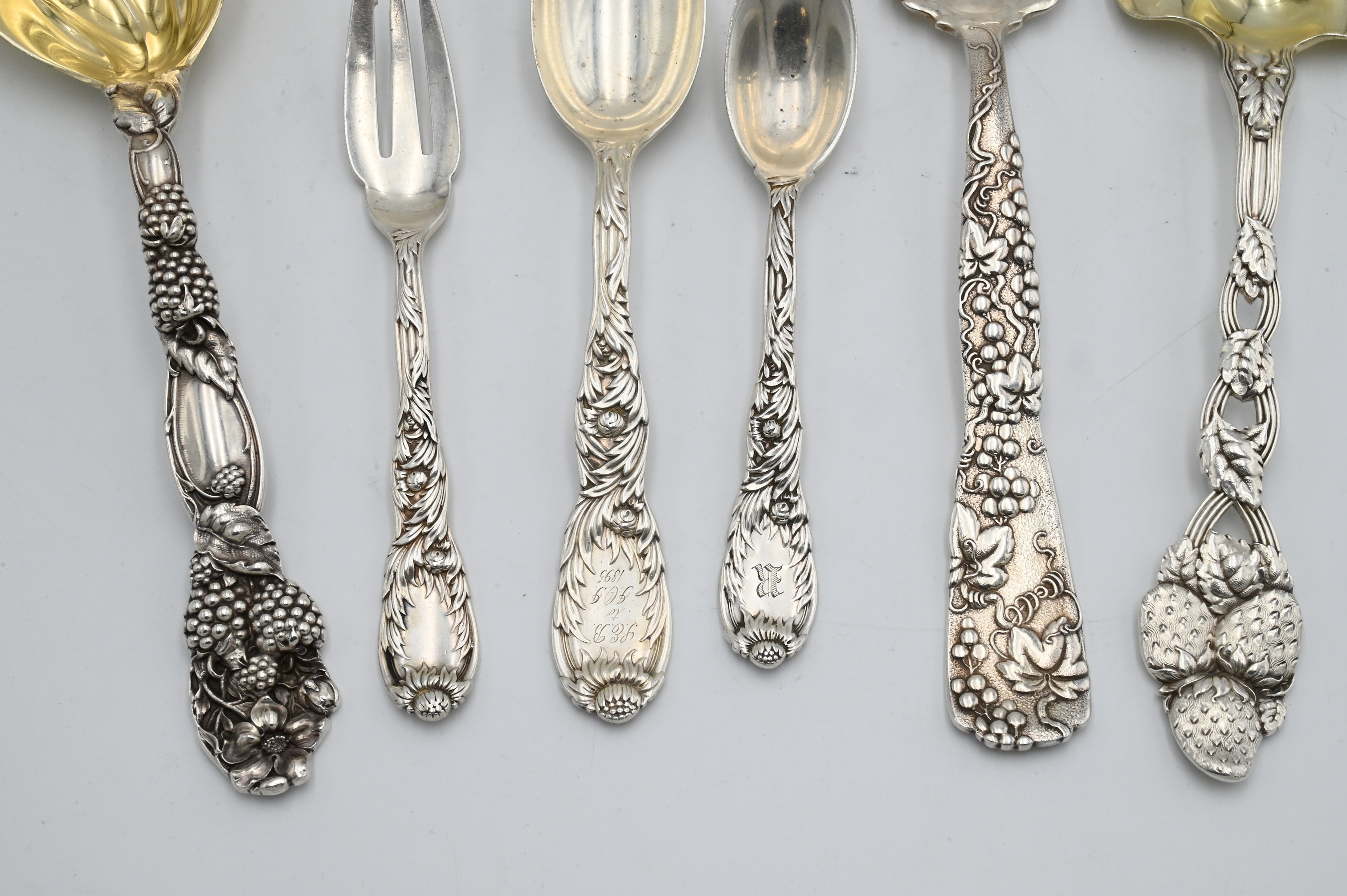 to include grape pattern fruit serving spoon, three chrysanthemum pieces and cherry pattern serving fork, some with monograms