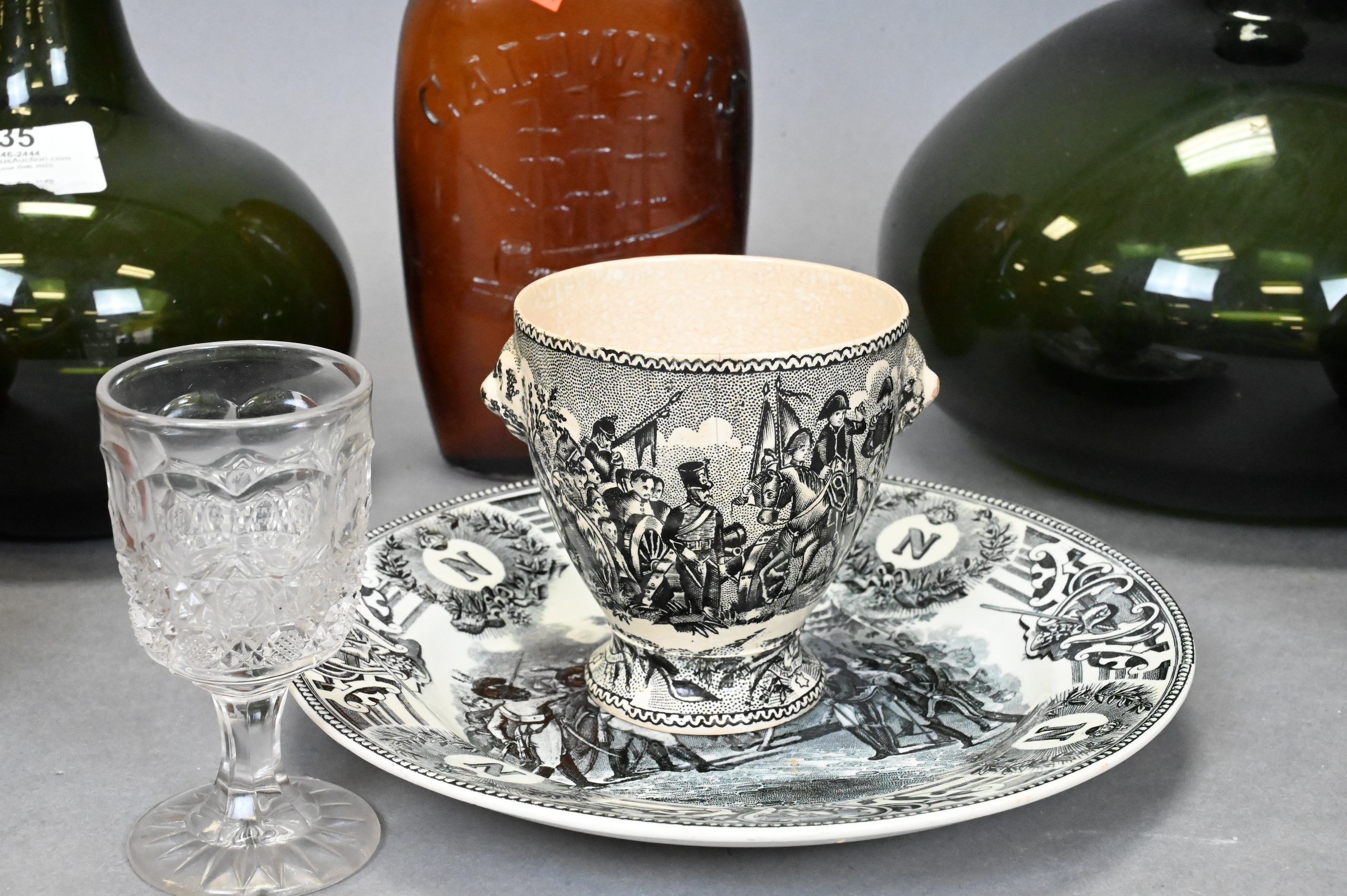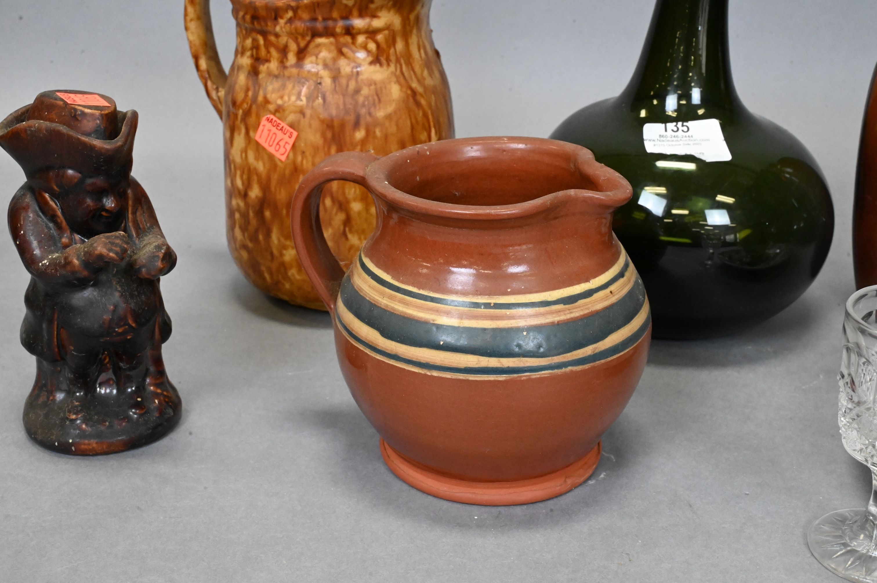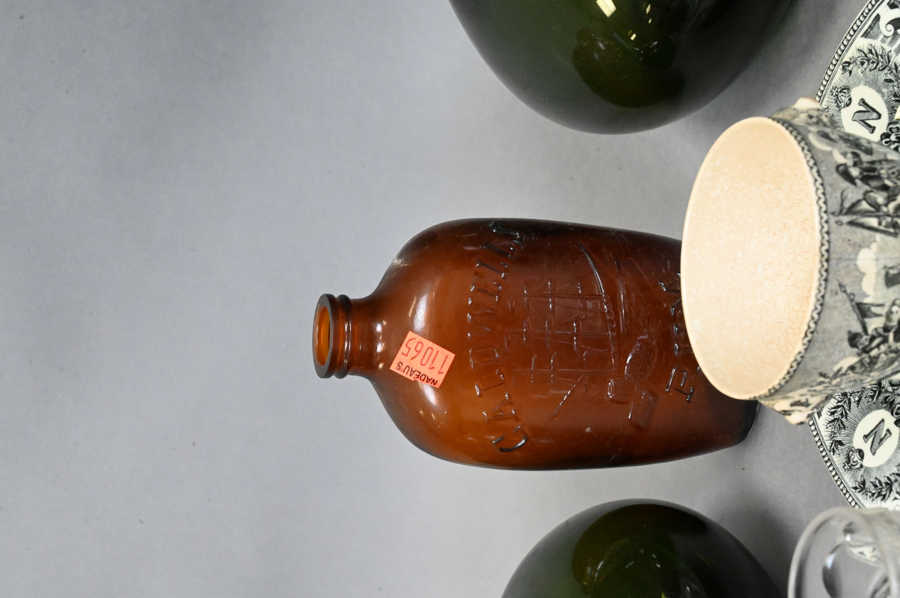 two early green hand blown bottles, amber Caldwell’s Rum bottle, stoneware pitchers, Napoleon transferware cup and saucer, Benington Toby jug etc…