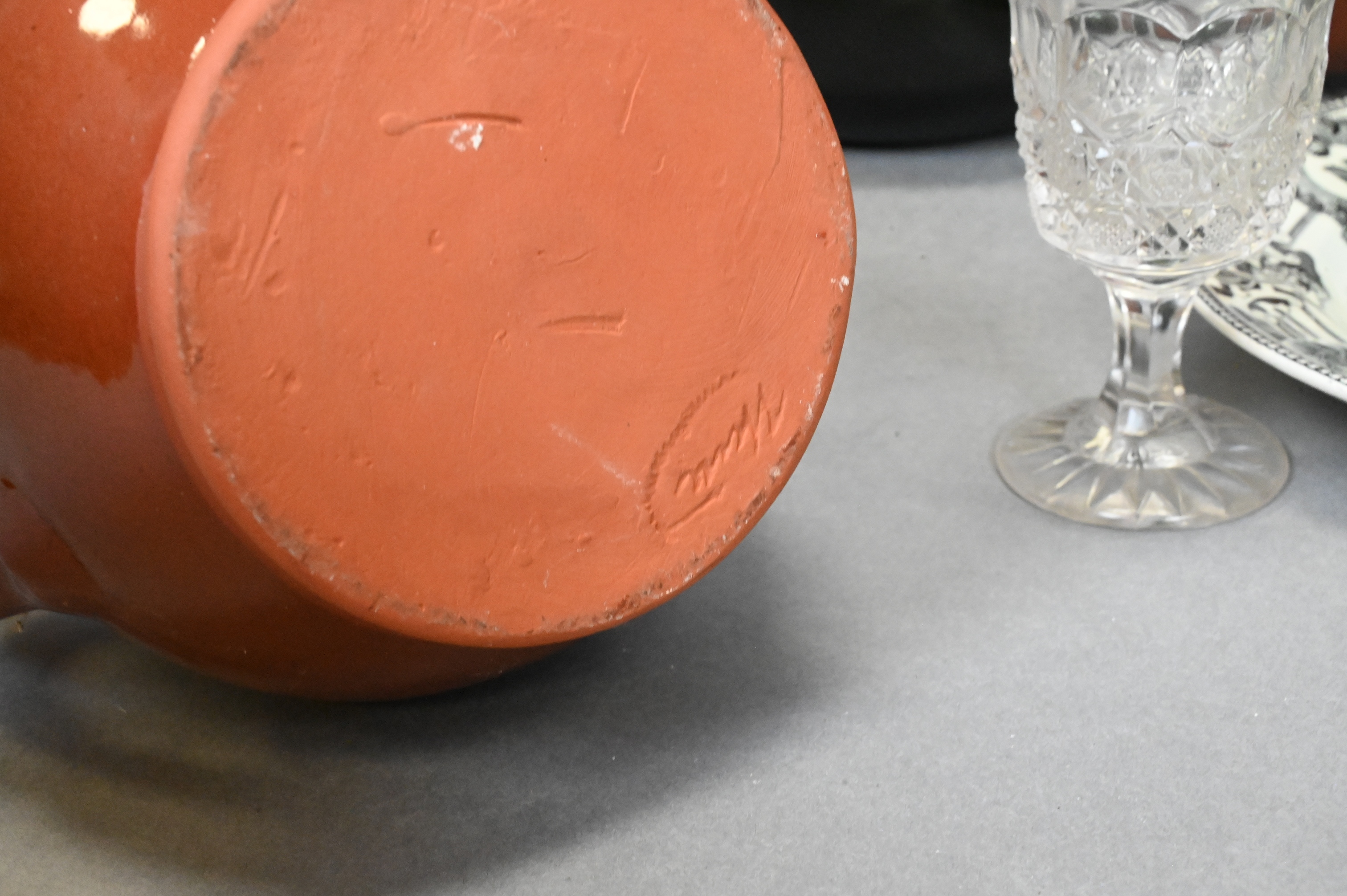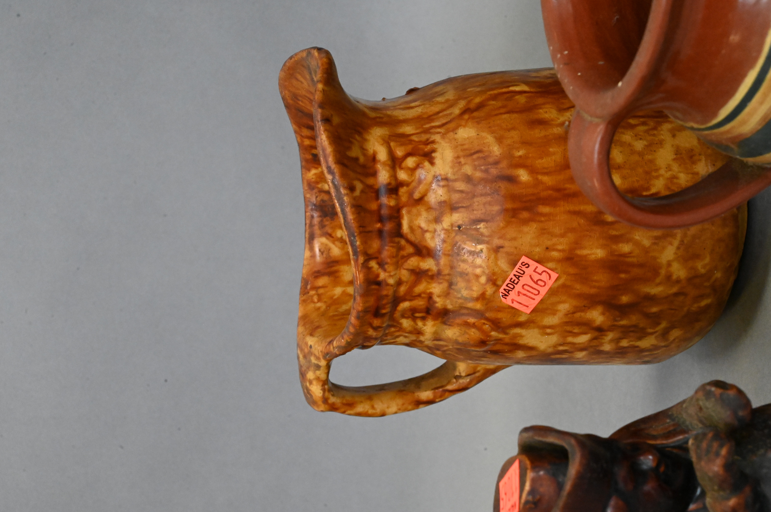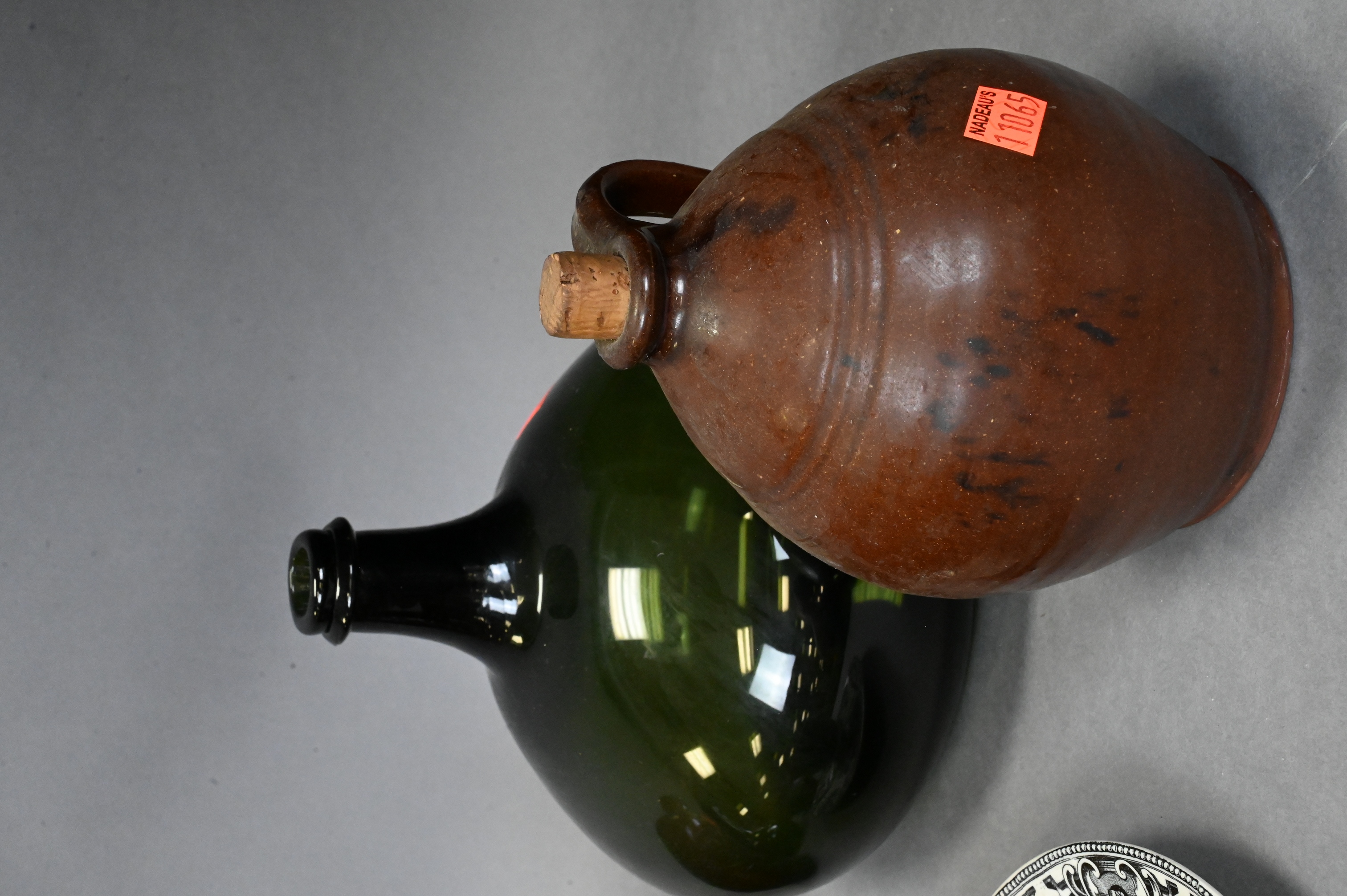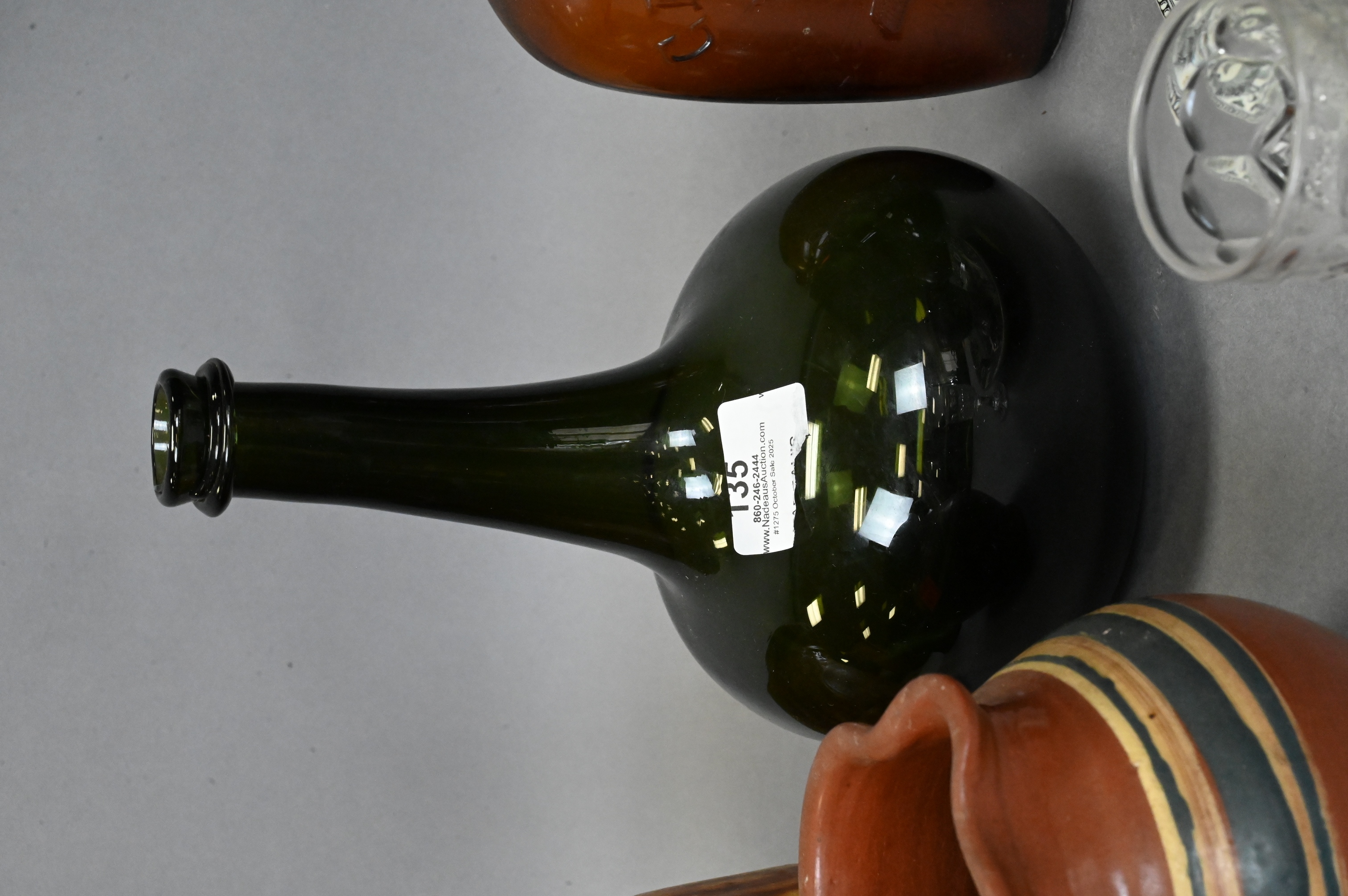 two early green hand blown bottles, amber Caldwell’s Rum bottle, stoneware pitchers, Napoleon transferware cup and saucer, Benington Toby jug etc…