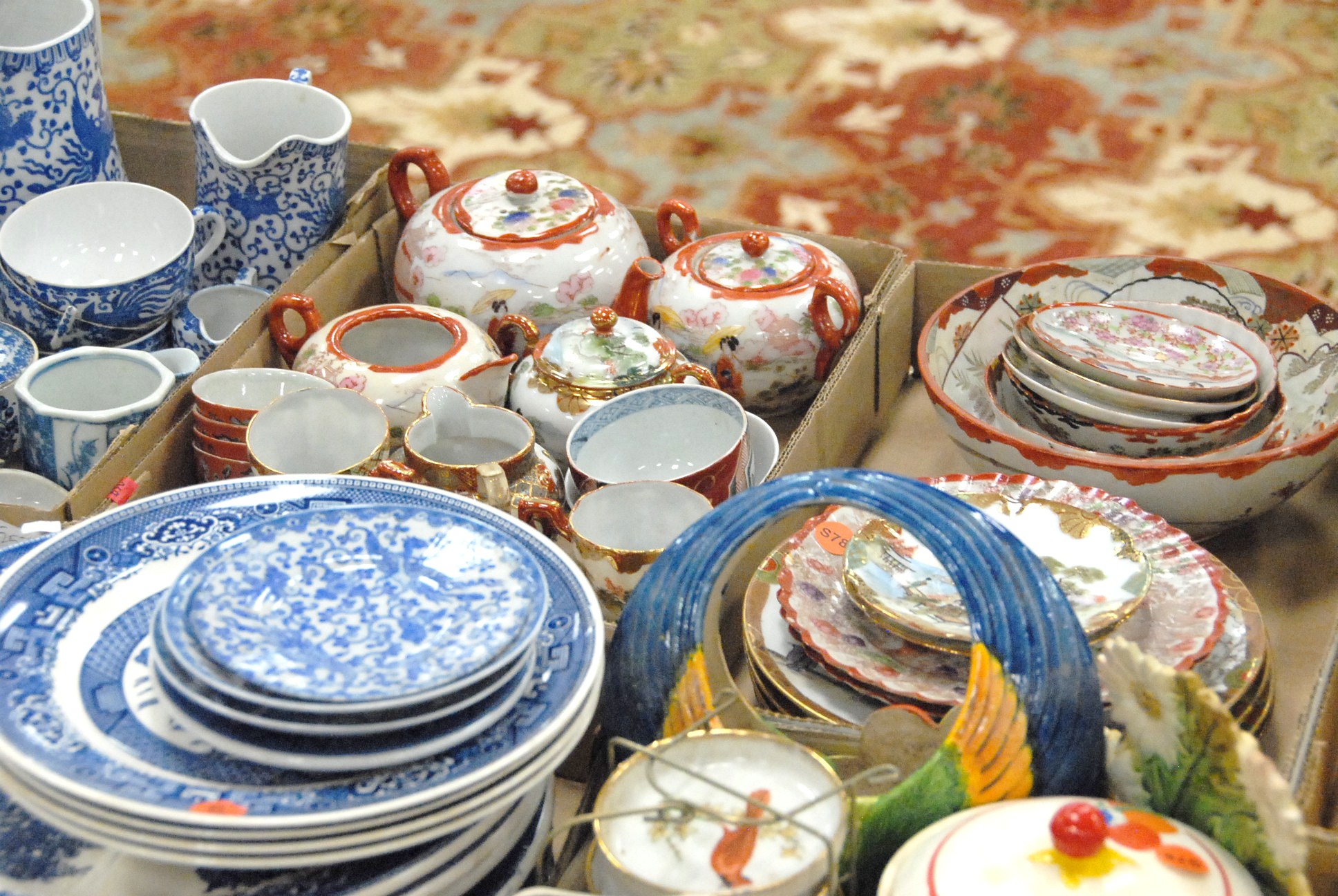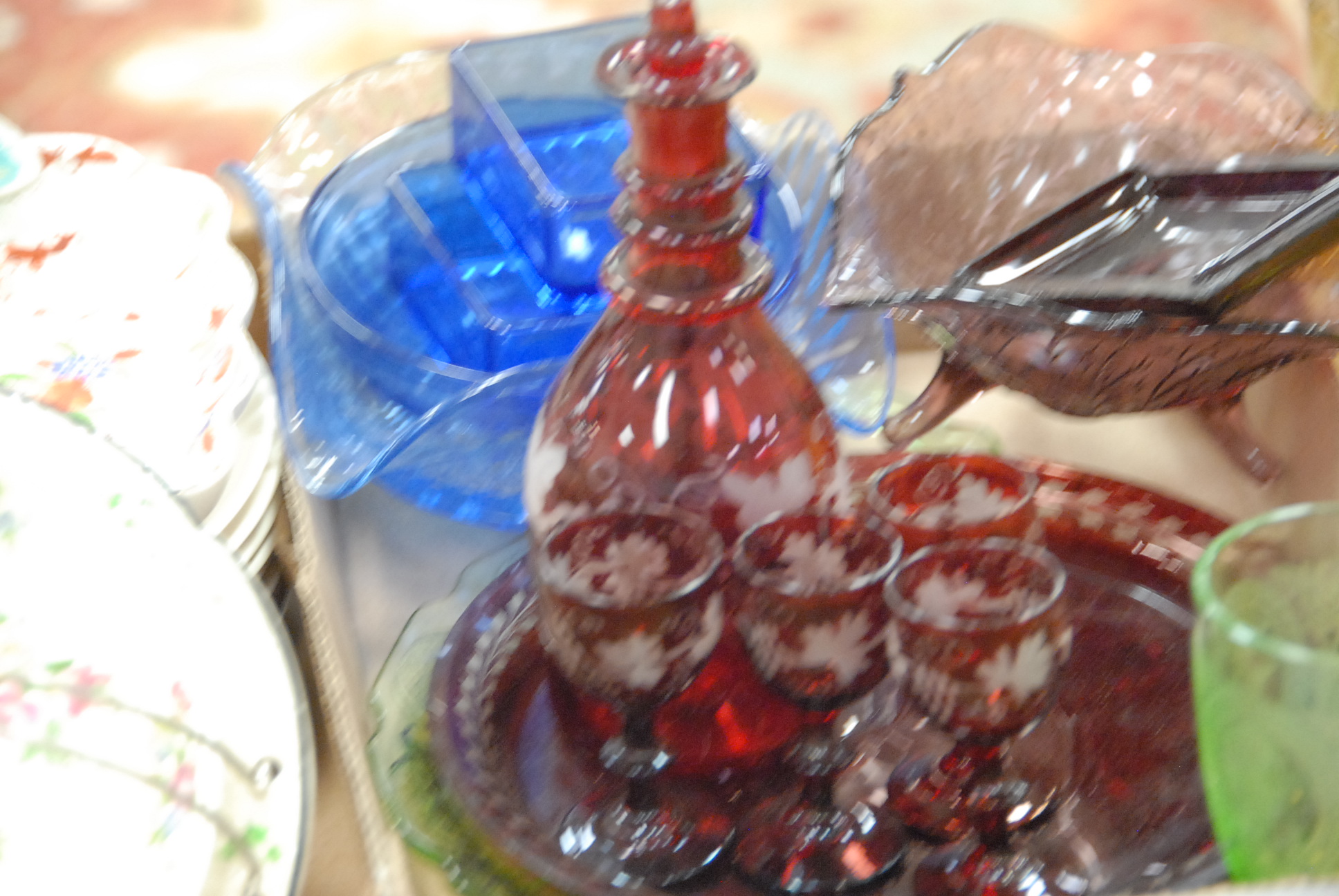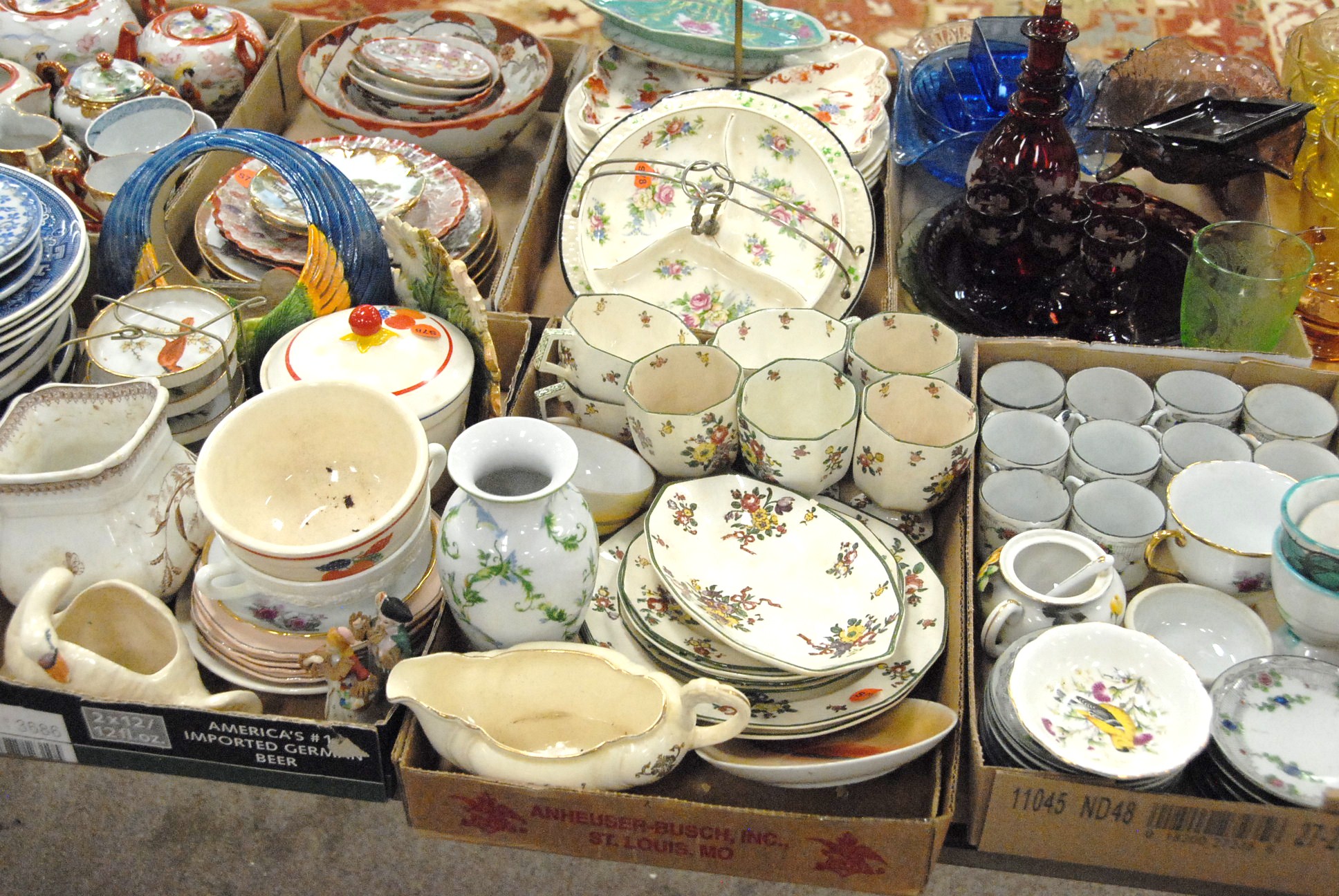 Ten boxes of blue and white china, Japanese china, cups, saucers, Bohemian glass decanters, four glasses, and under plate.