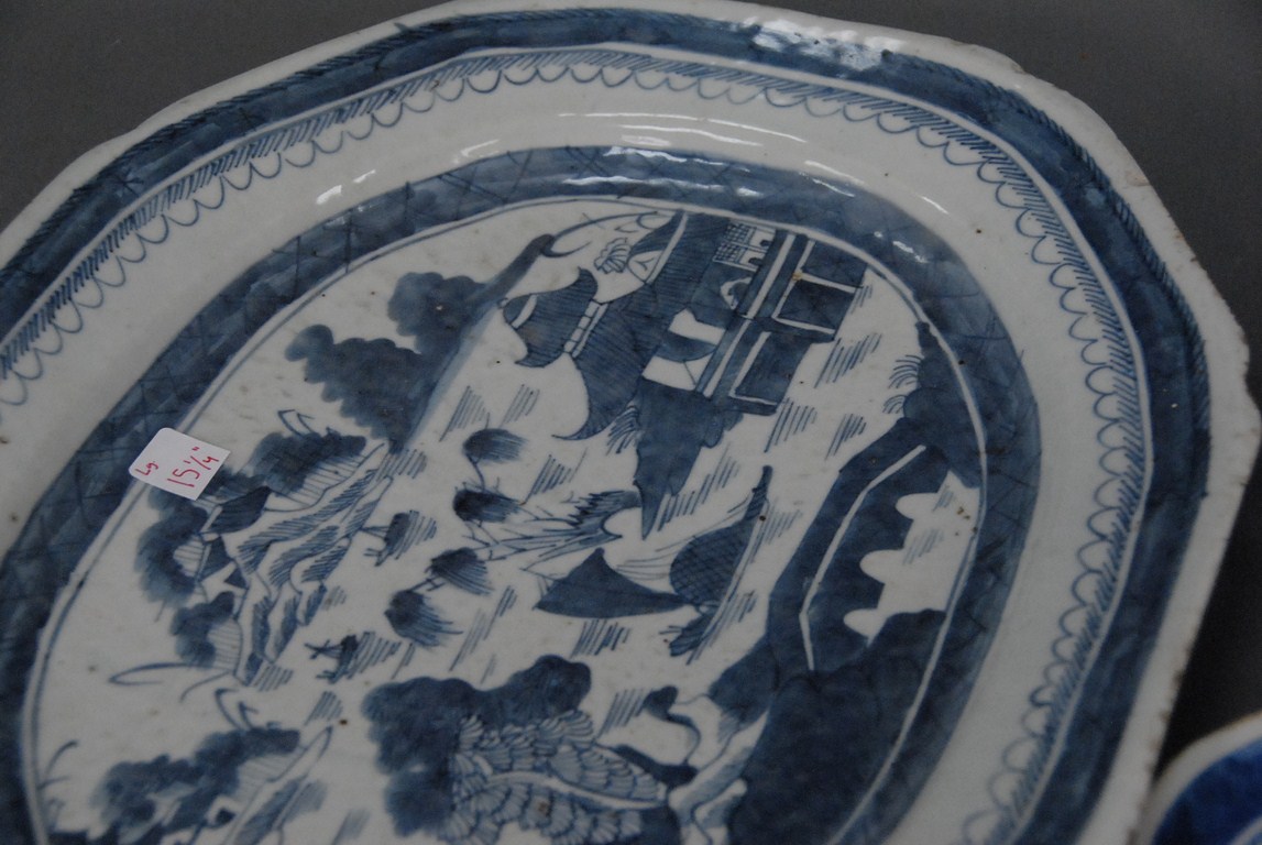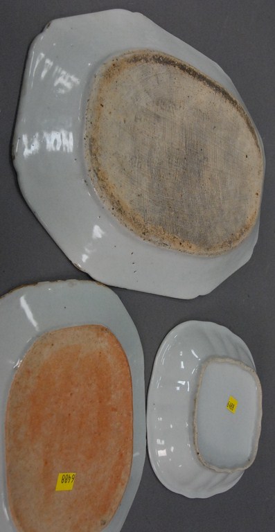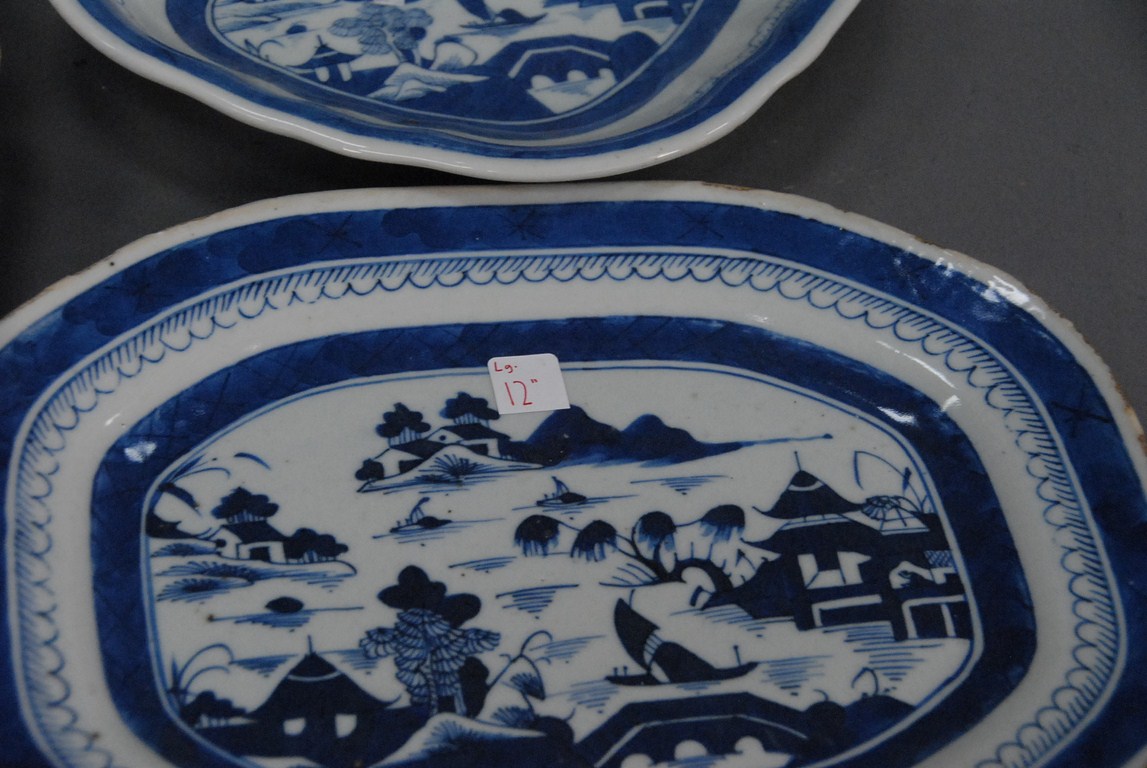 Three piece lot two Canton platters and one diamond shaped shallow dish. lg. 10 1/4in., 12in., & 15 1/4in. Provenance: Estate of Judy McDonough Gengras of Stoner Drive, West Hartford, Connecticut.