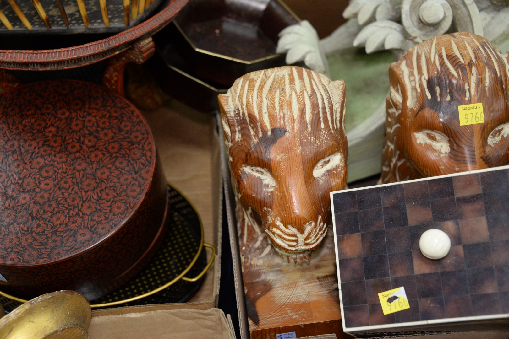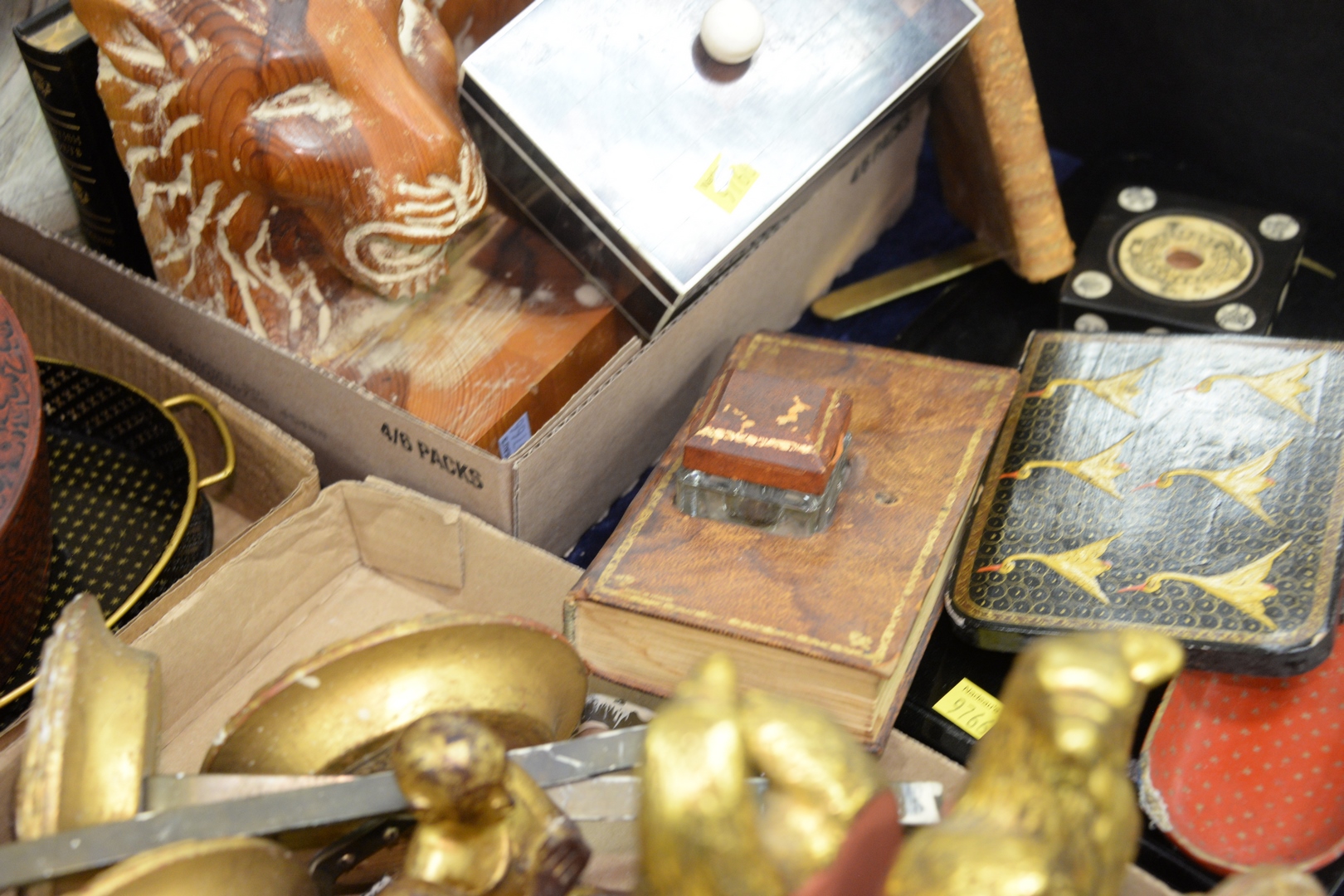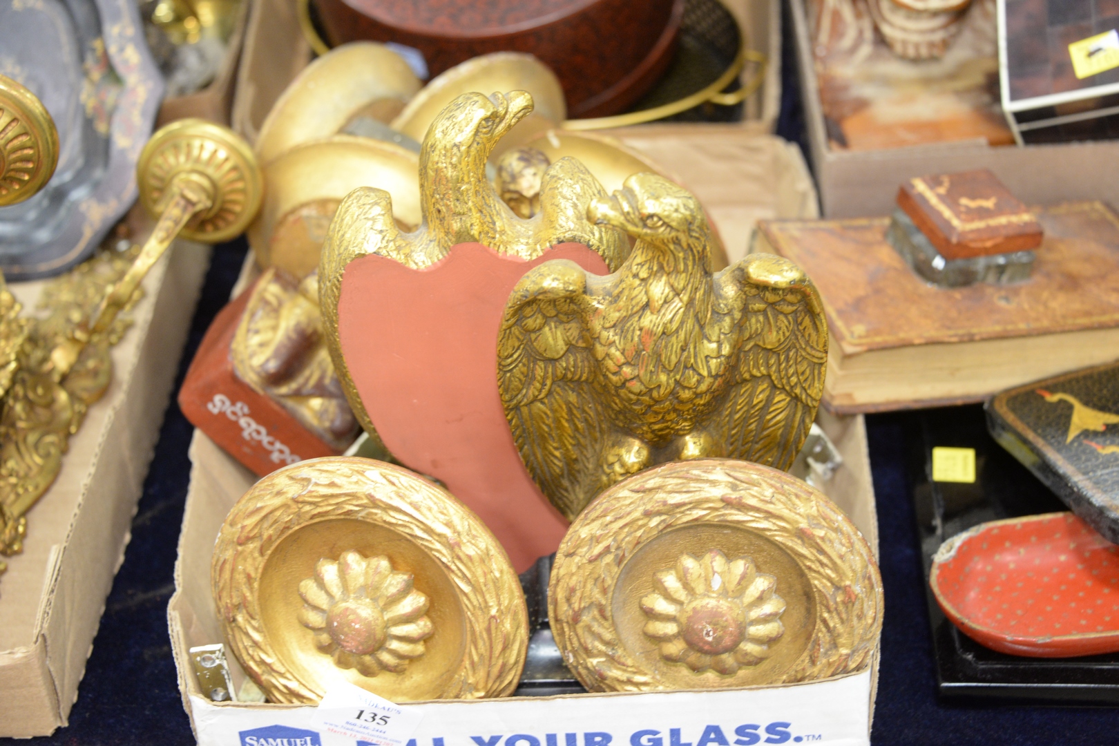 Lot 135: Three Tray Lots, to include gilt ceramic eagle bookends carved wood lion bookends 6 gilt wood tie backs an inkwell in the form of…