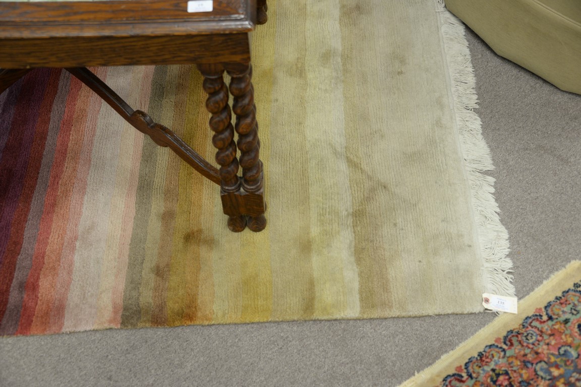 Lot 135: Two contemporary rugs including multicolored throw rug 4′ x 5’10 and a small runner 3′ x 6′.