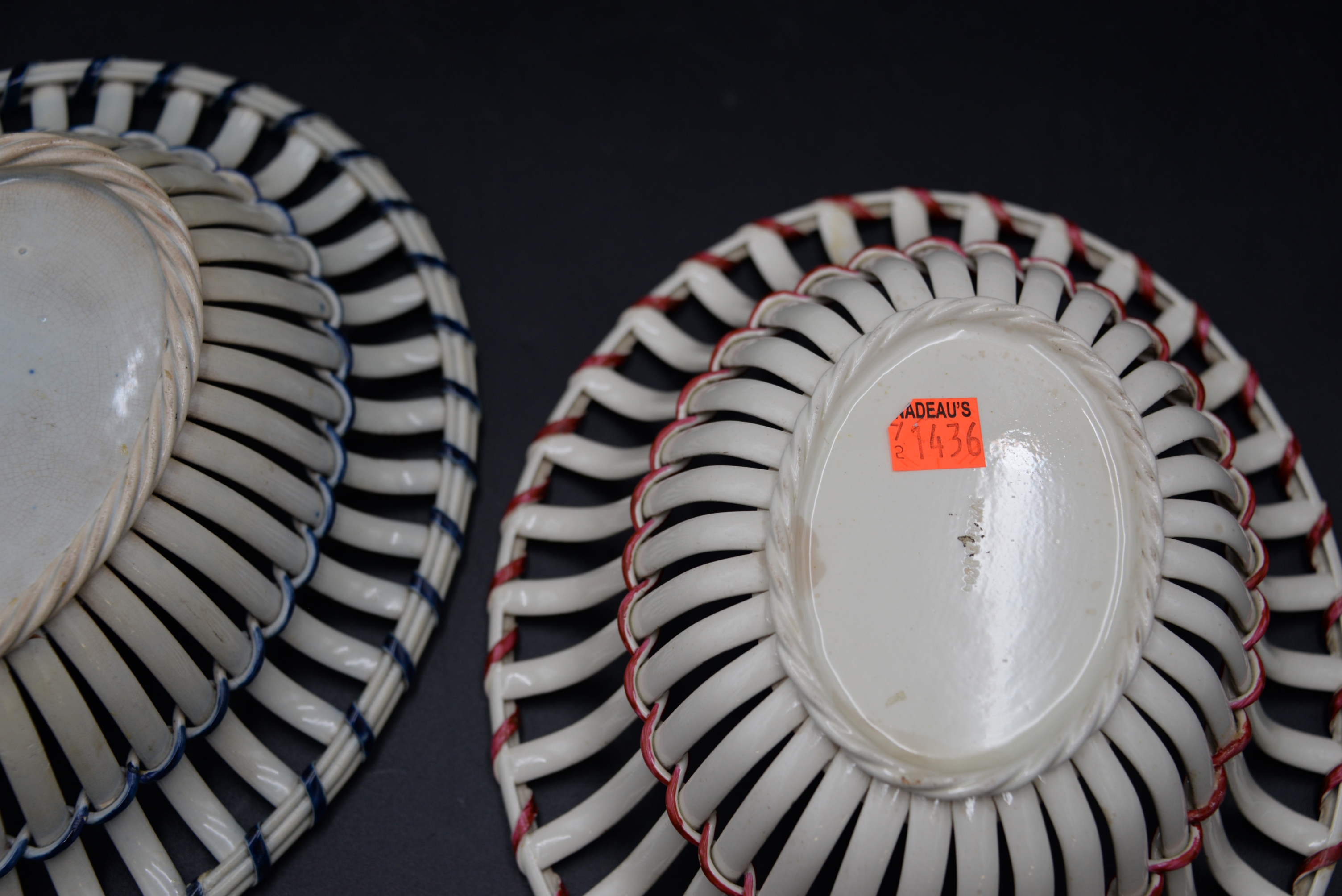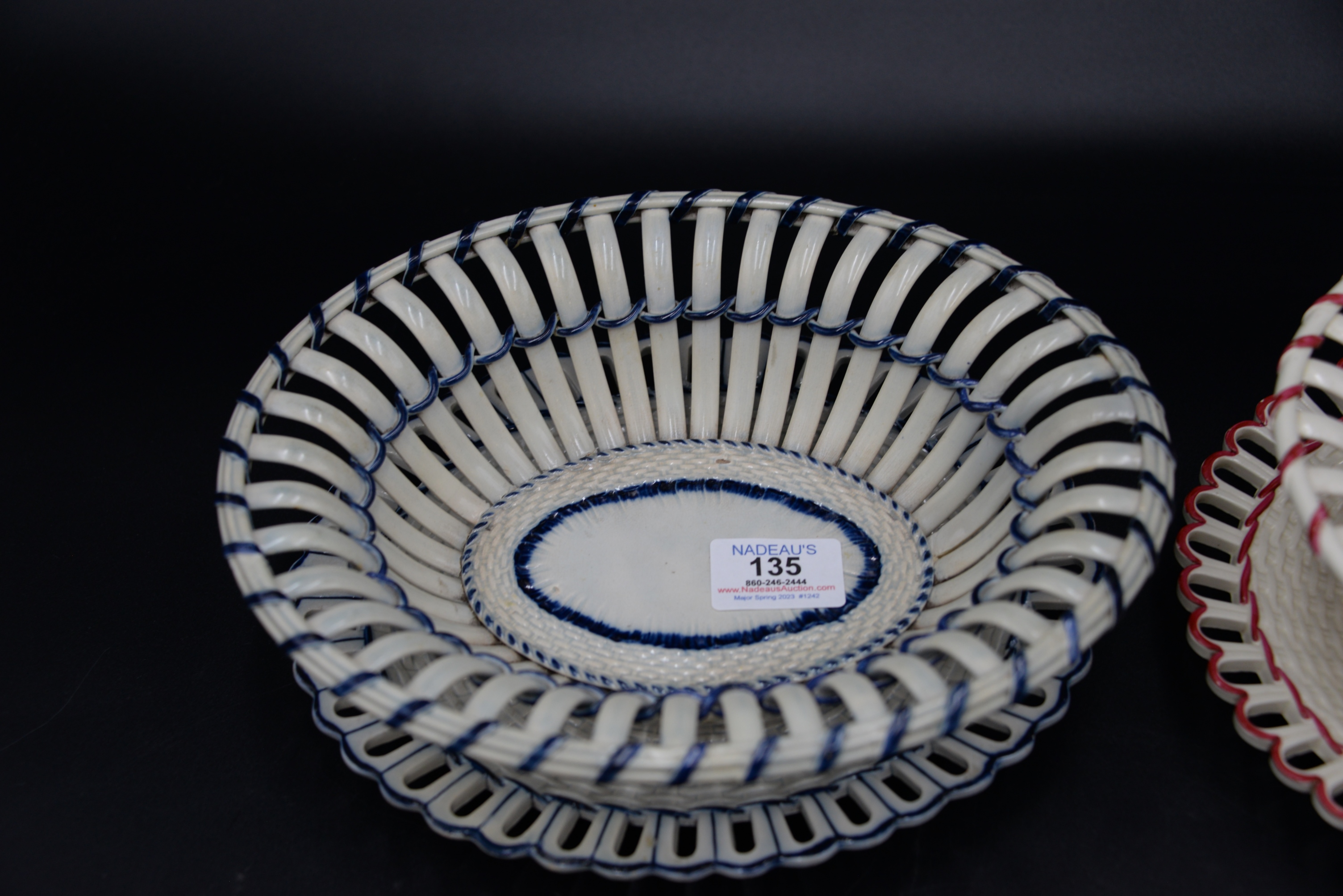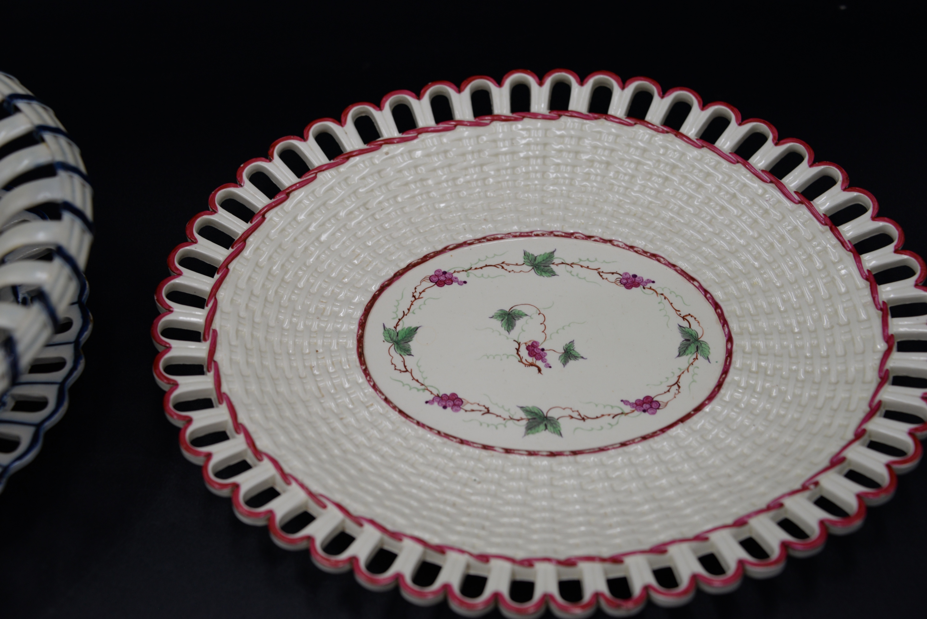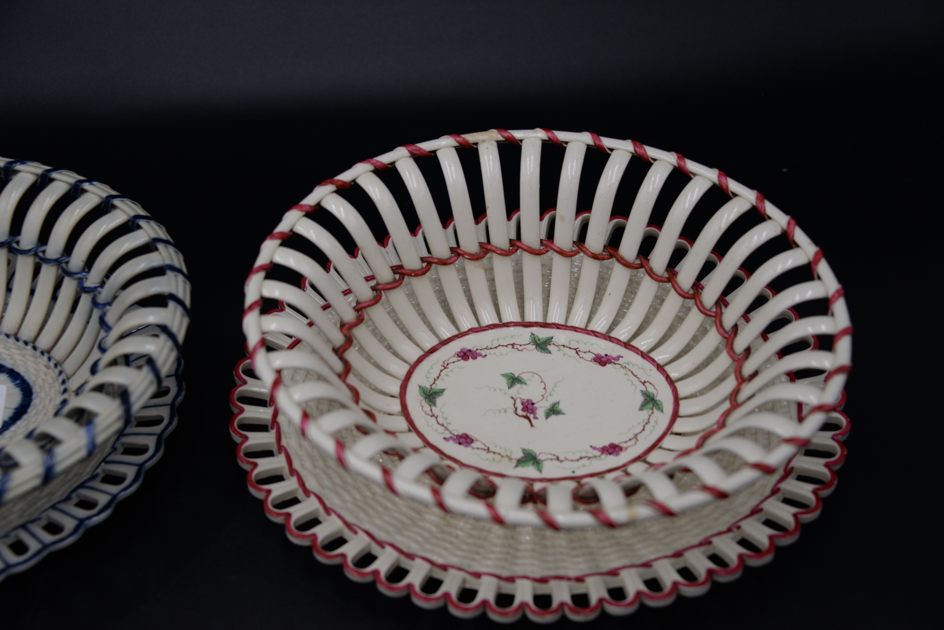 Two English Creamware Baskets and Underplates, one in deep rose color and vine decoration, one with cobalt trim (repaired), height 3 inches and 10 1/2 inches.