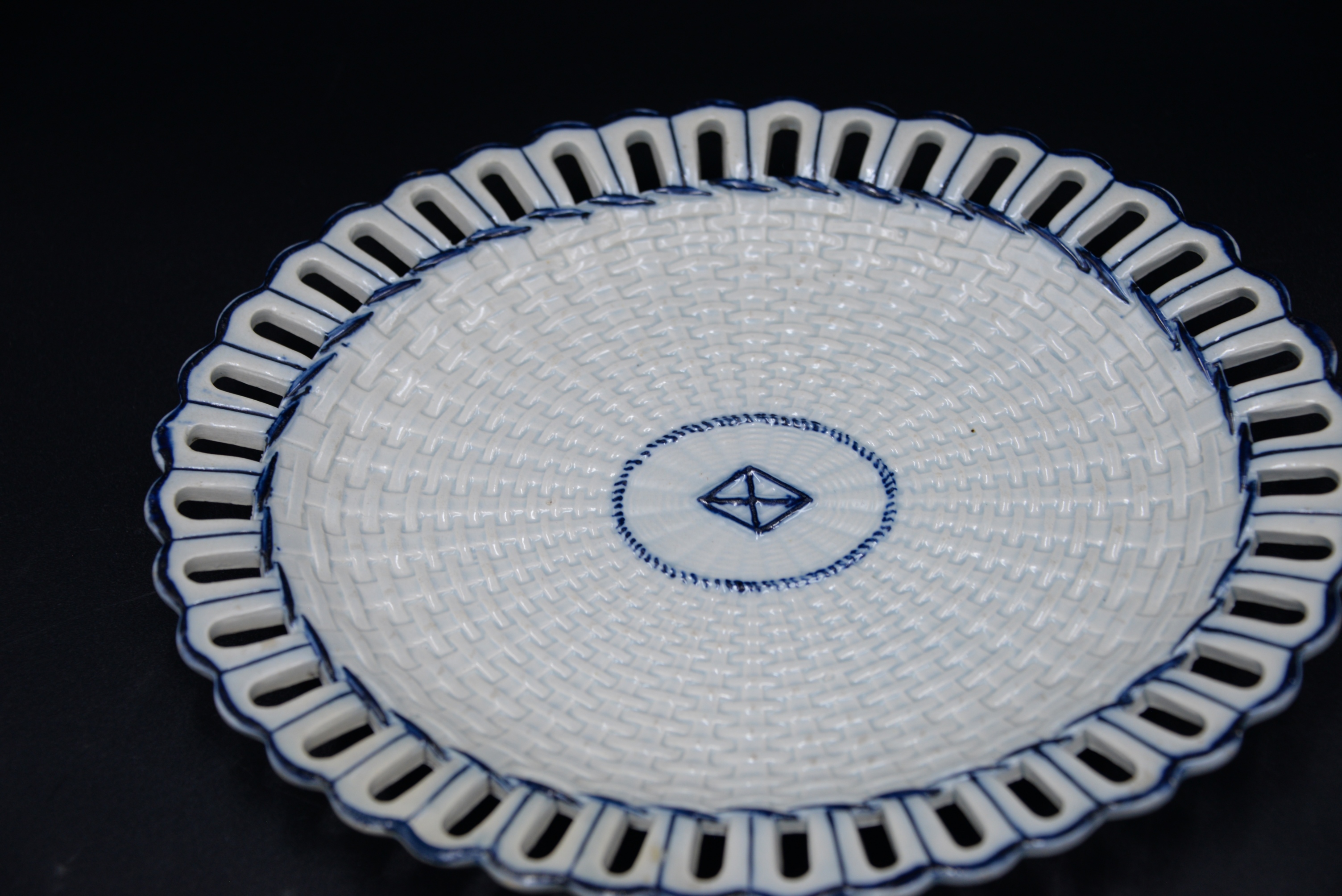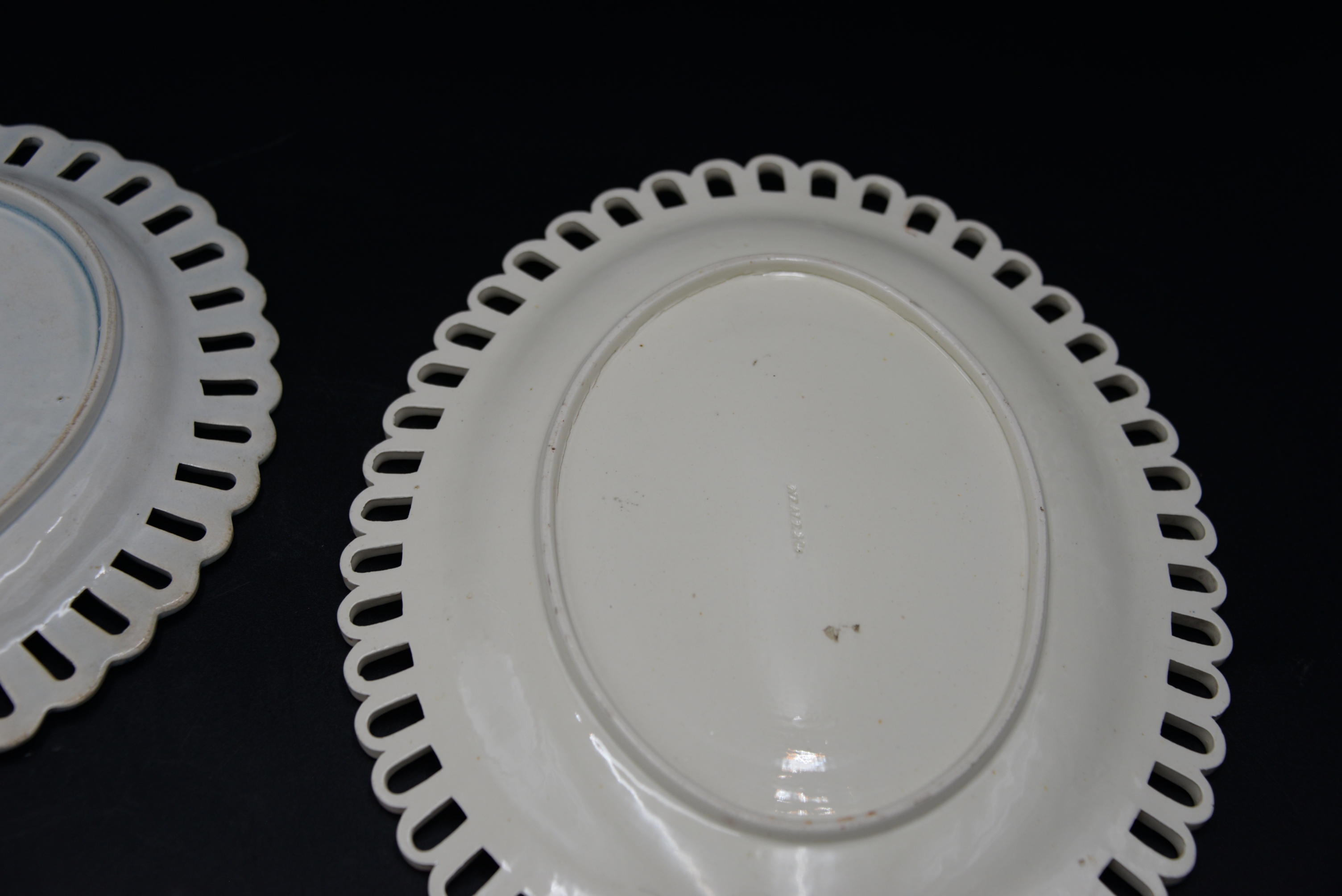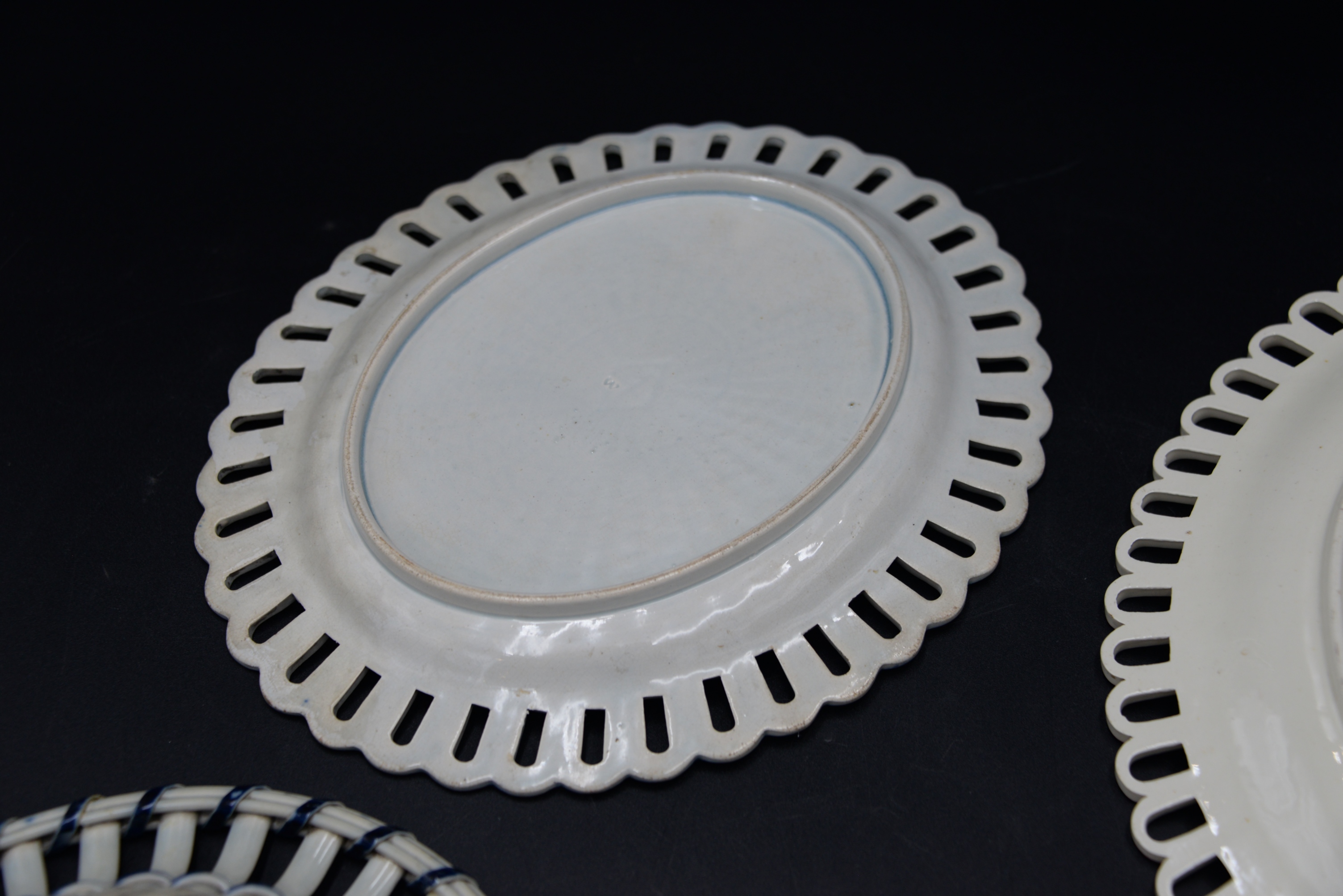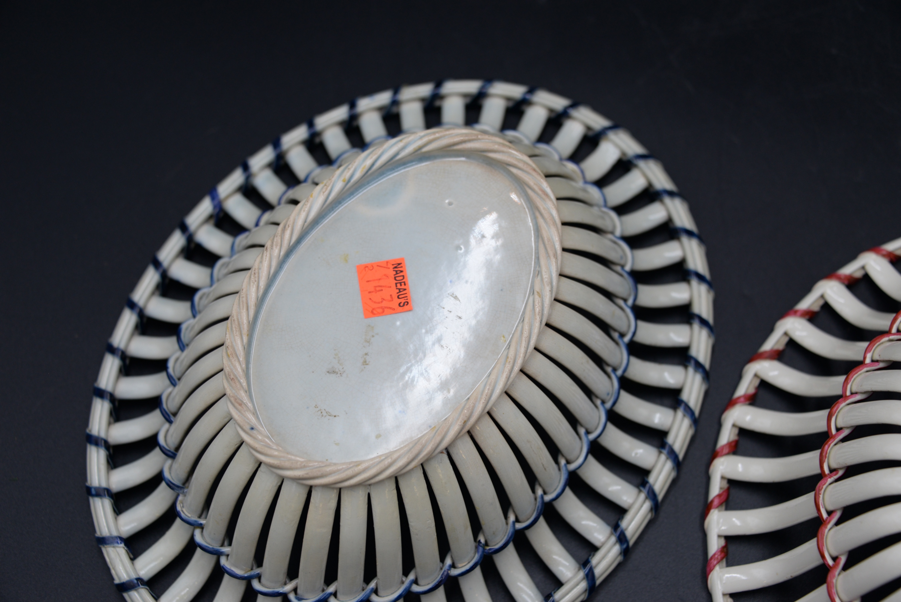 Two English Creamware Baskets and Underplates, one in deep rose color and vine decoration, one with cobalt trim (repaired), height 3 inches and 10 1/2 inches.