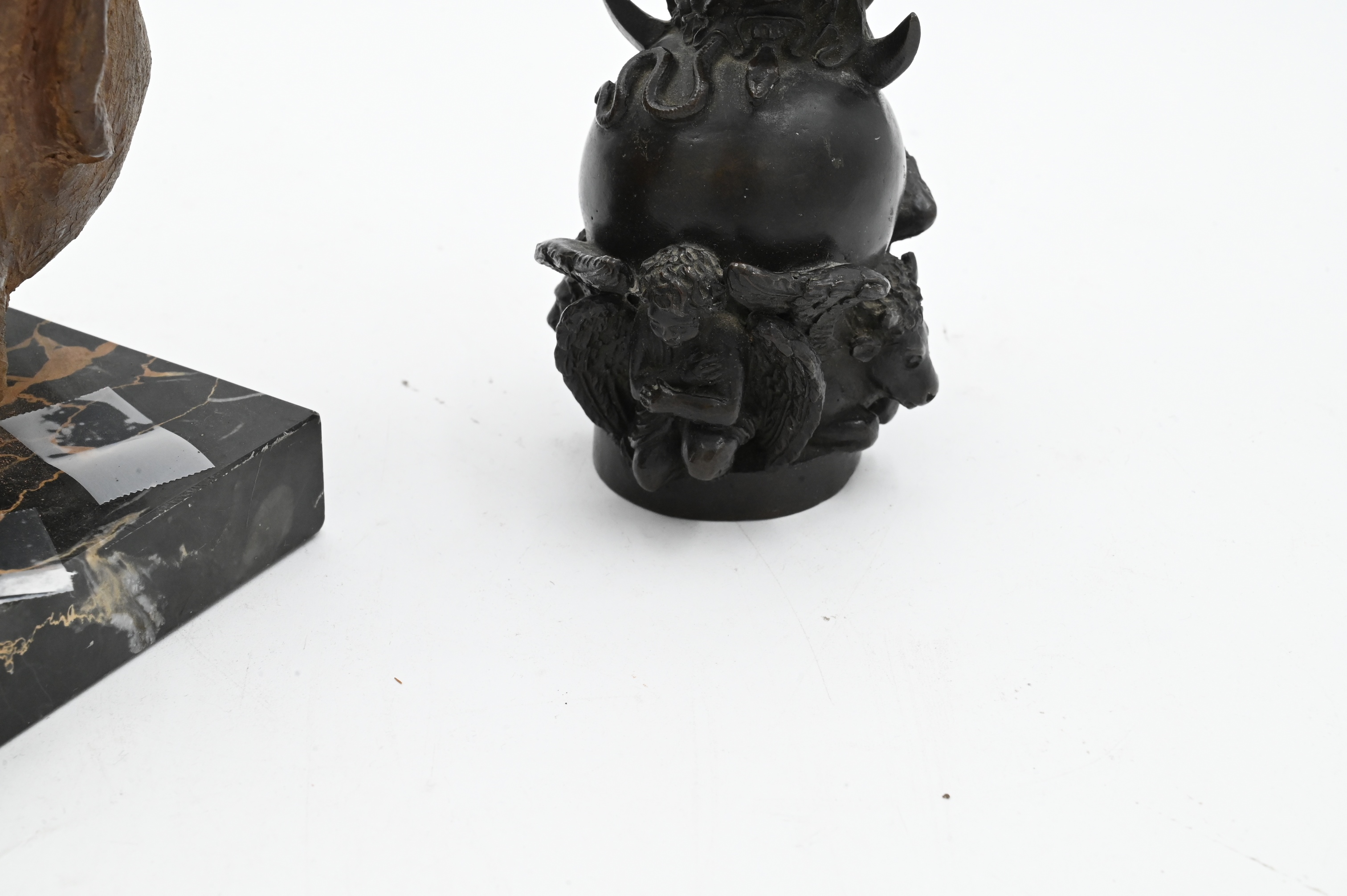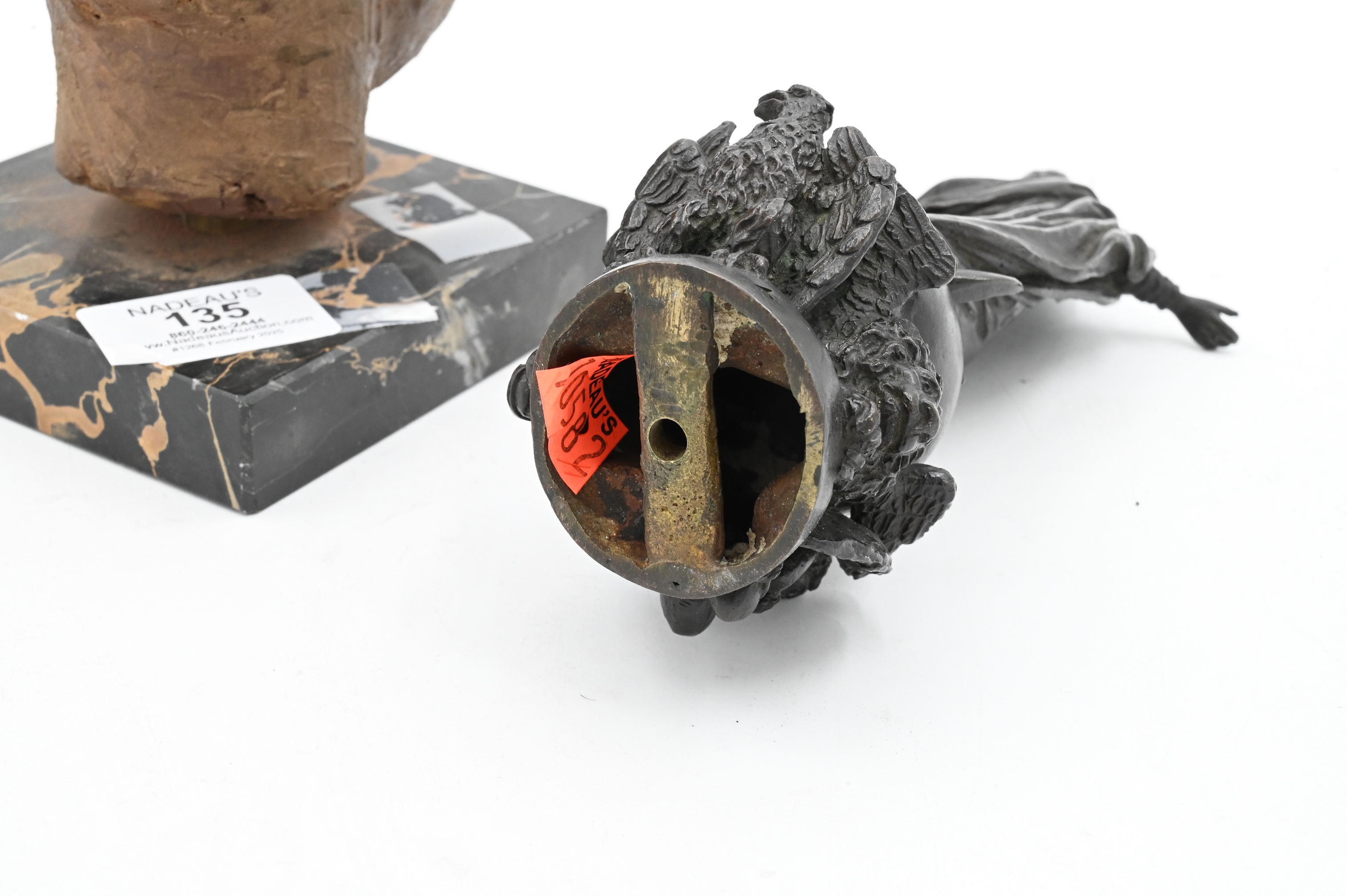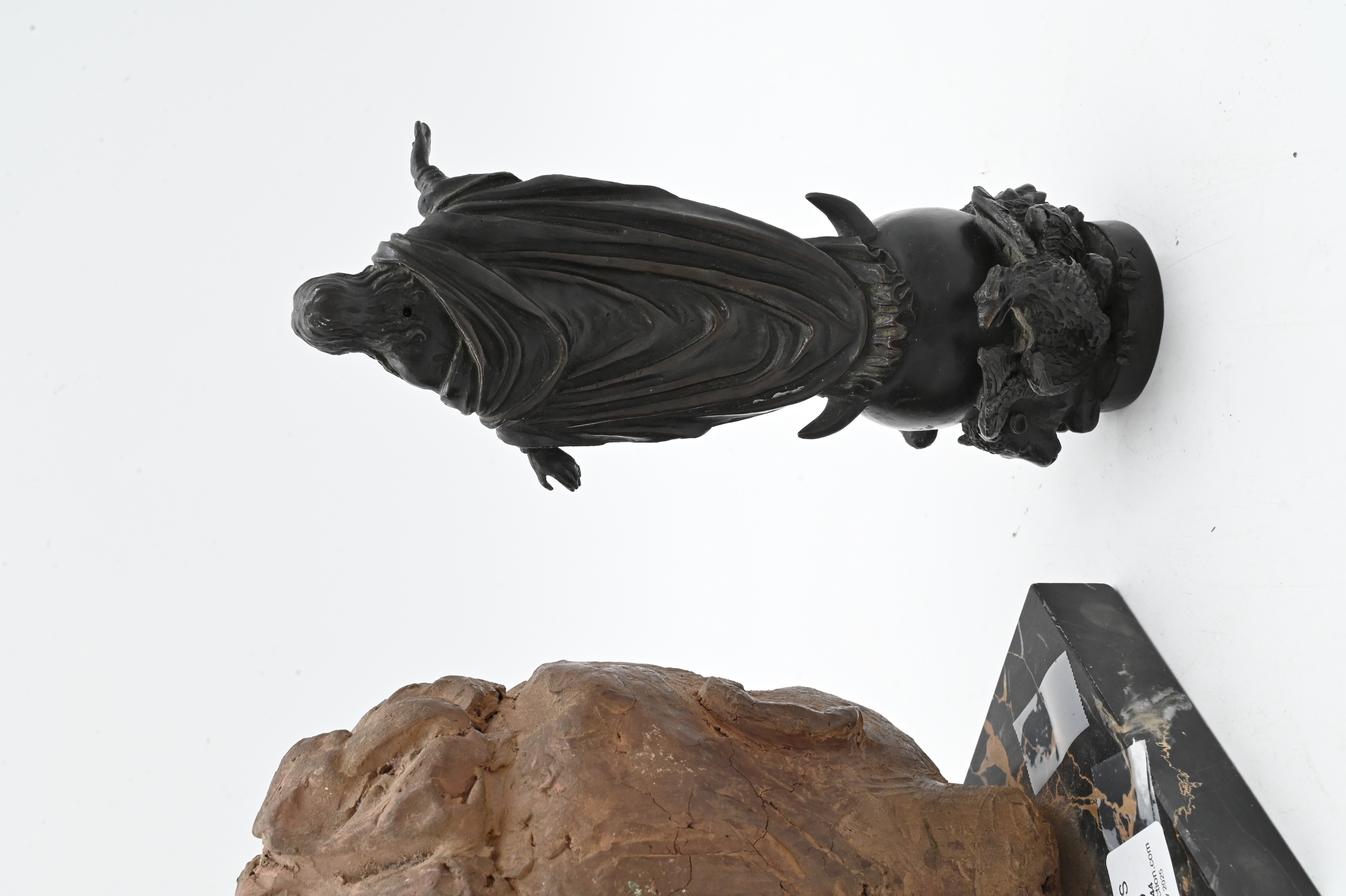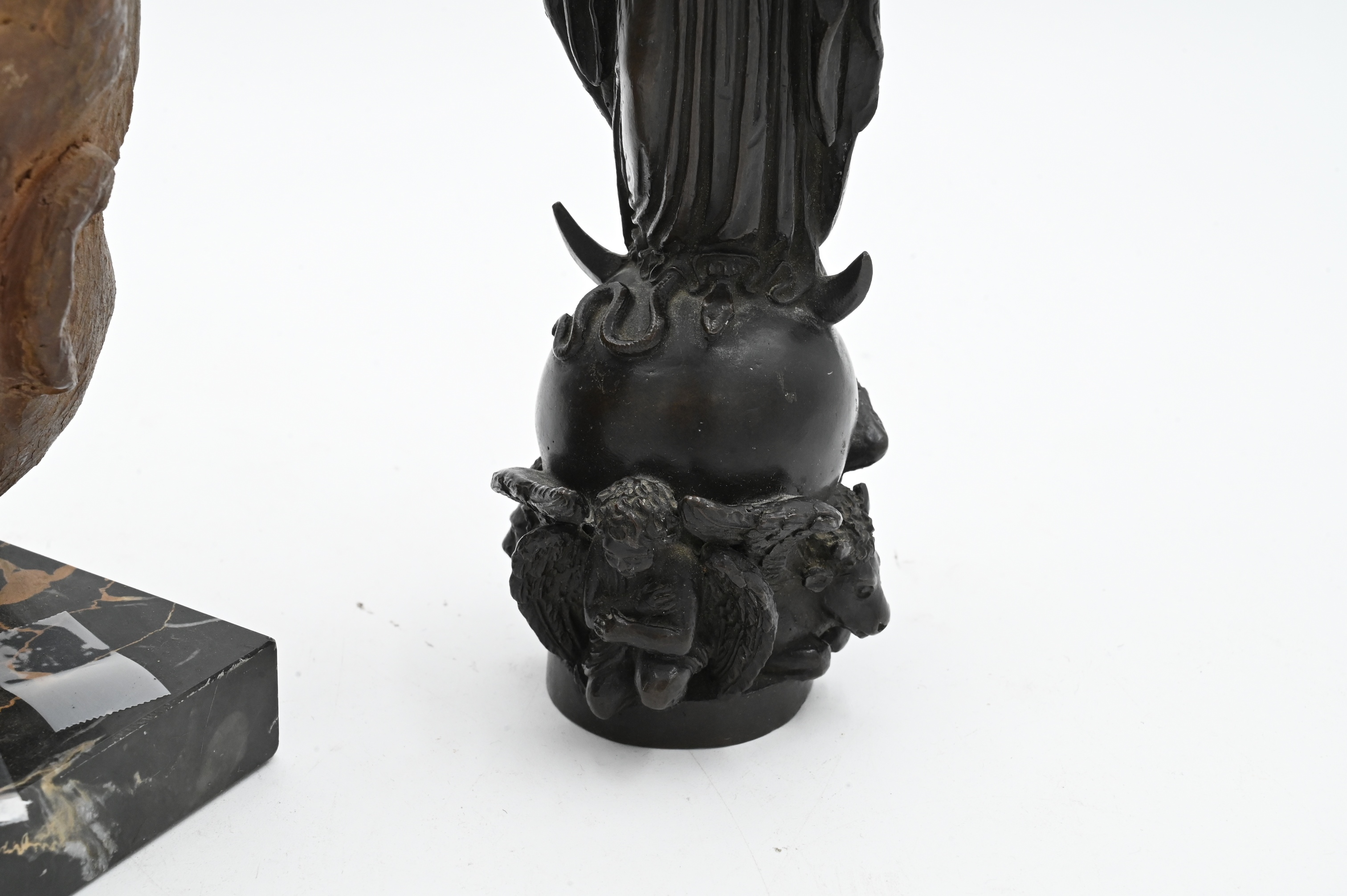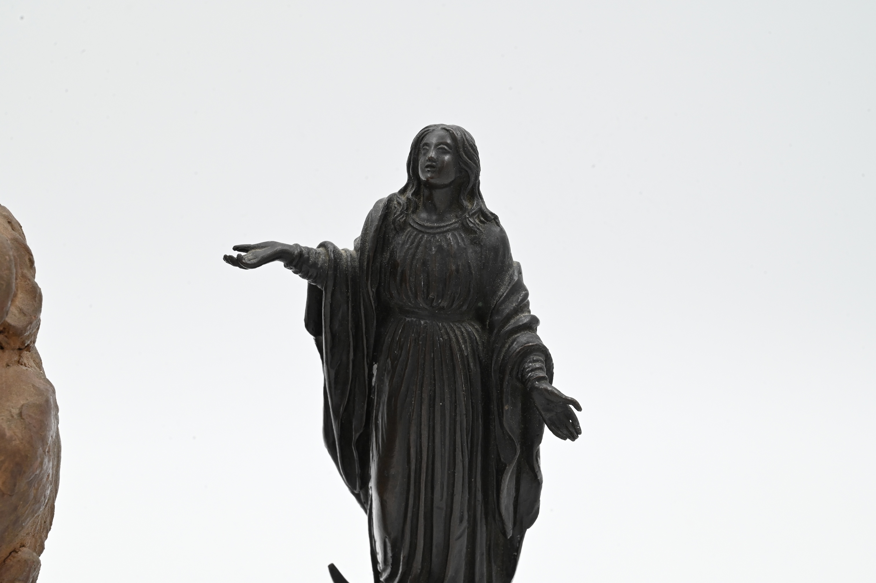 Patinated cast bronze depicting the Virgin Mary crushing a serpent, the moon, and Earth resting beneath her feet, set on four winged creatures