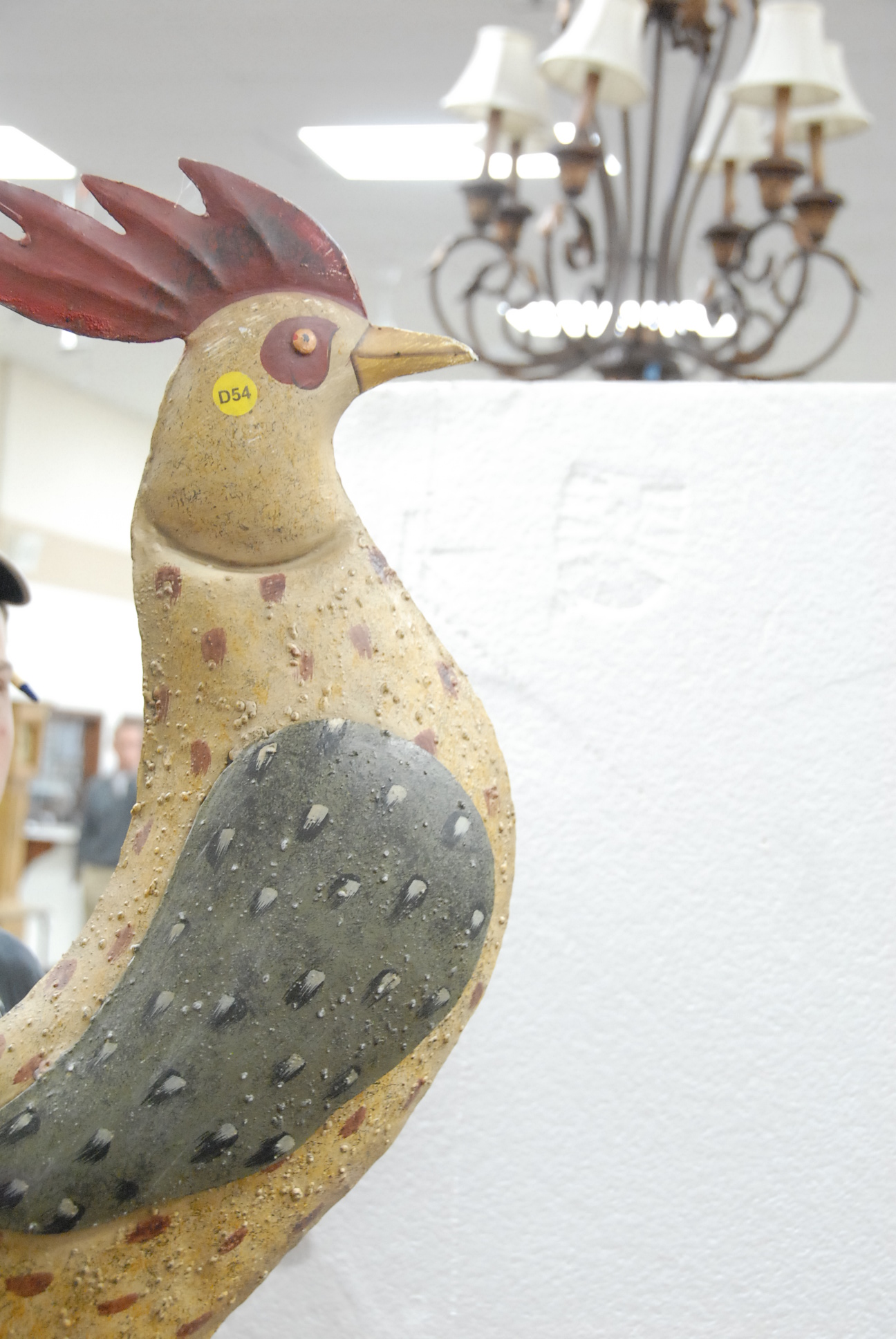 Two piece lot to include a rooster weathervane and a rooster metal figure.