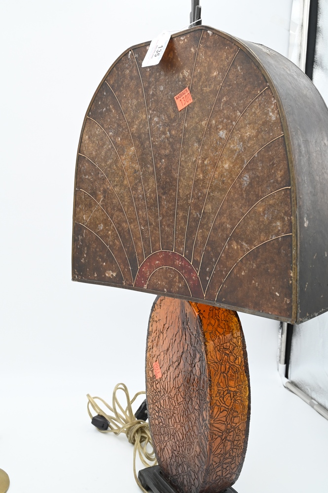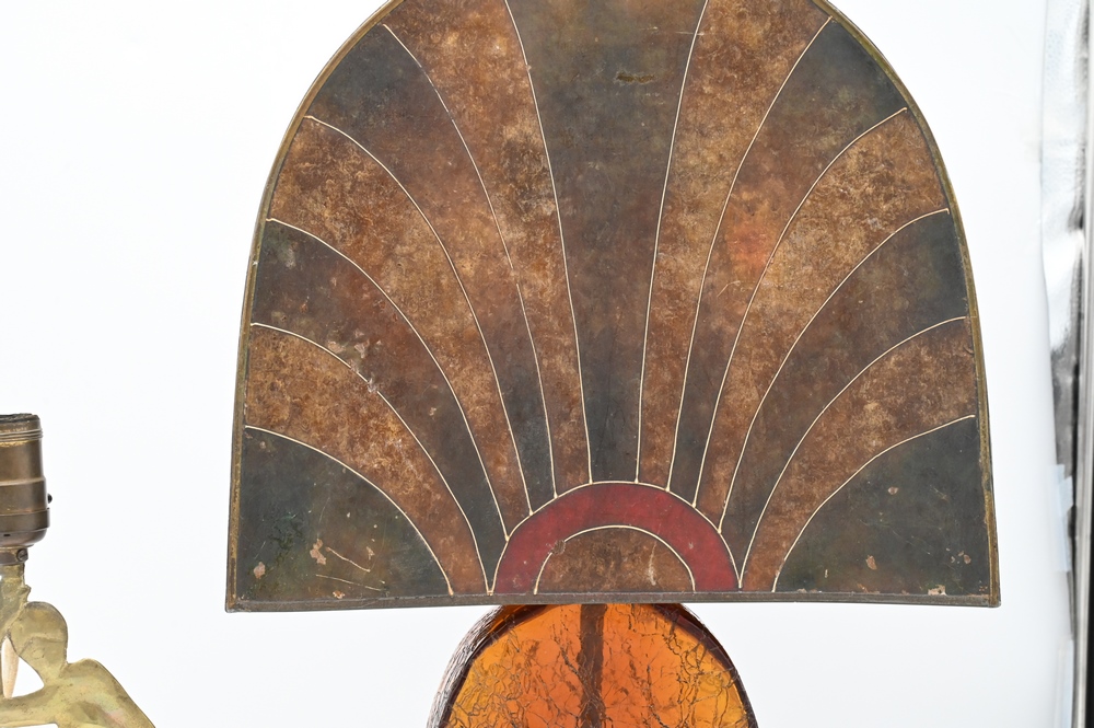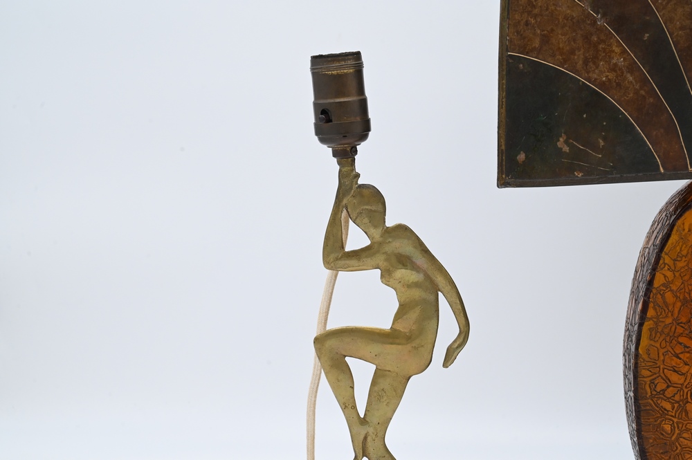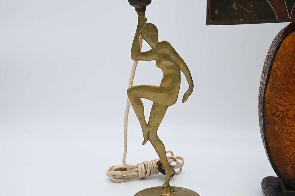 Two Piece Lot, to include Art Nouveau figural brass table lamp, having a nude base, along with art deco table lamp, having glass base with mica shade, Art Nouveau height 14 inches, Art Deco height 25 inches.