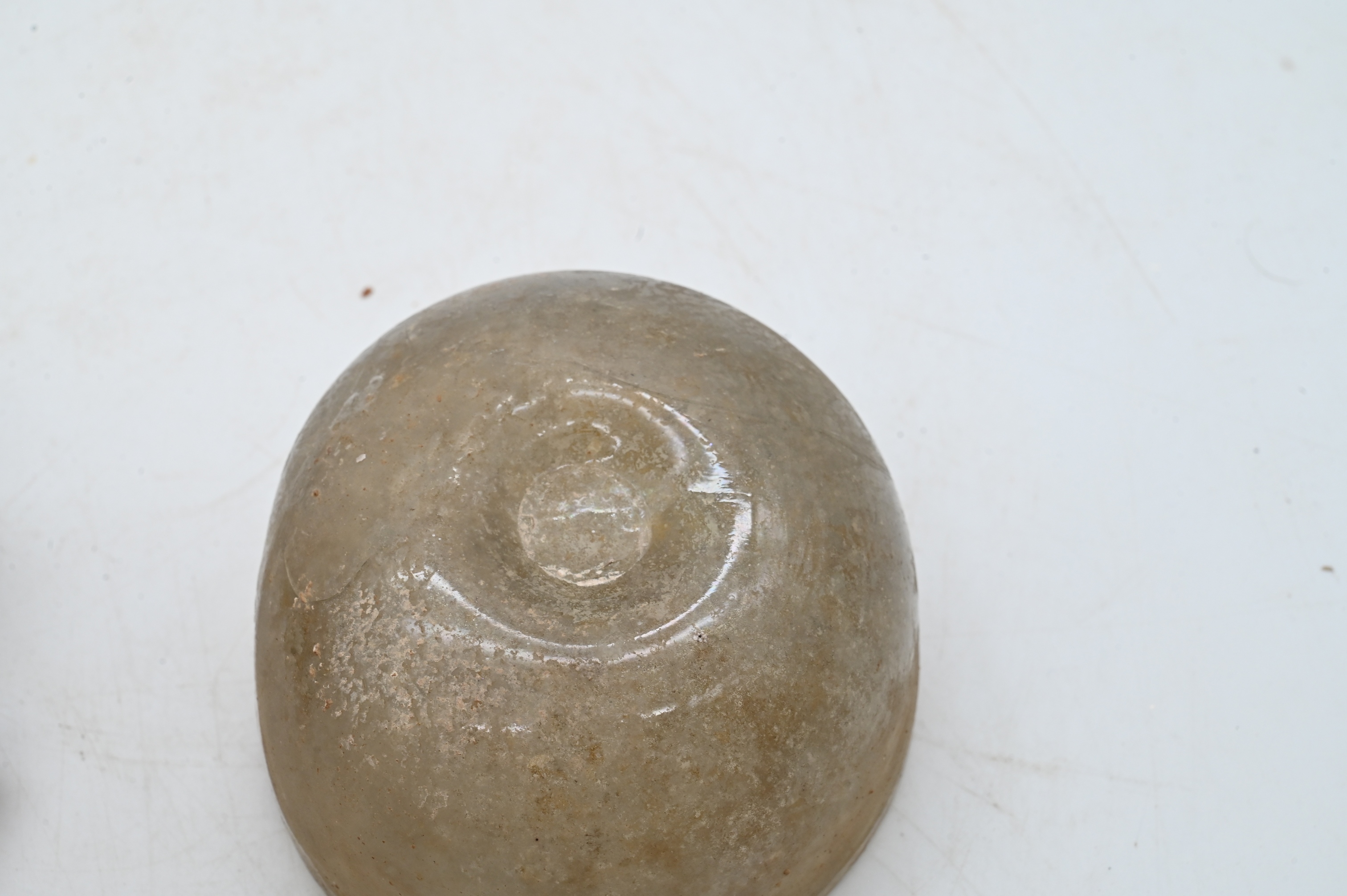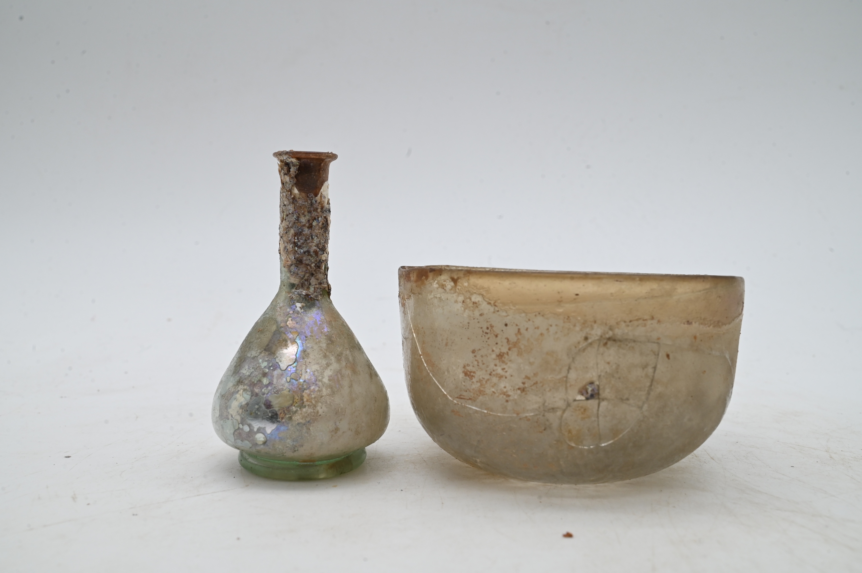 including a teardrop-form long-necked scent bottle with foot, together with a small drinking bowl, both free-blown glass with surface encrustation and iridescence consistent with burial, the bowl with a break to one side.