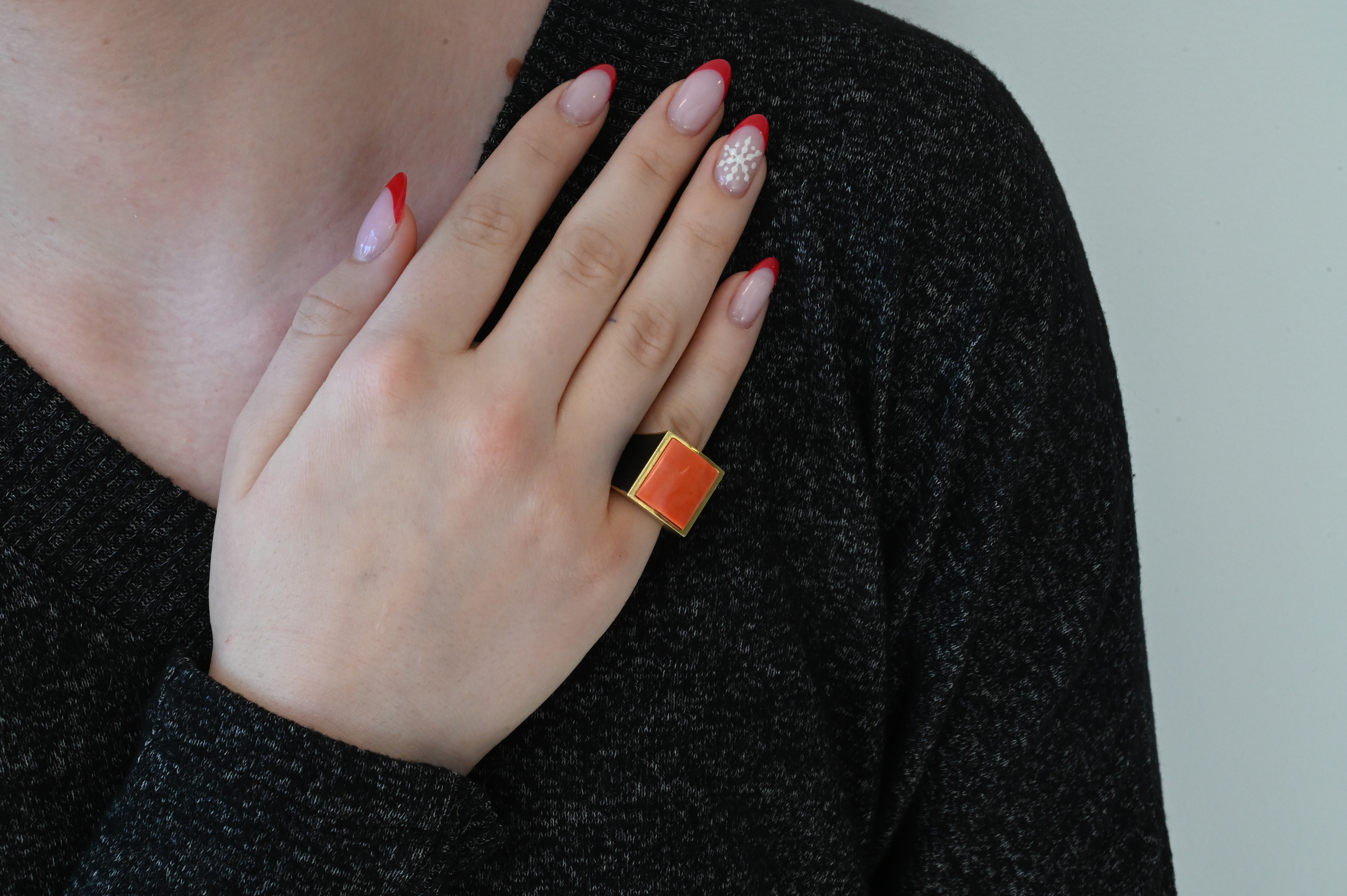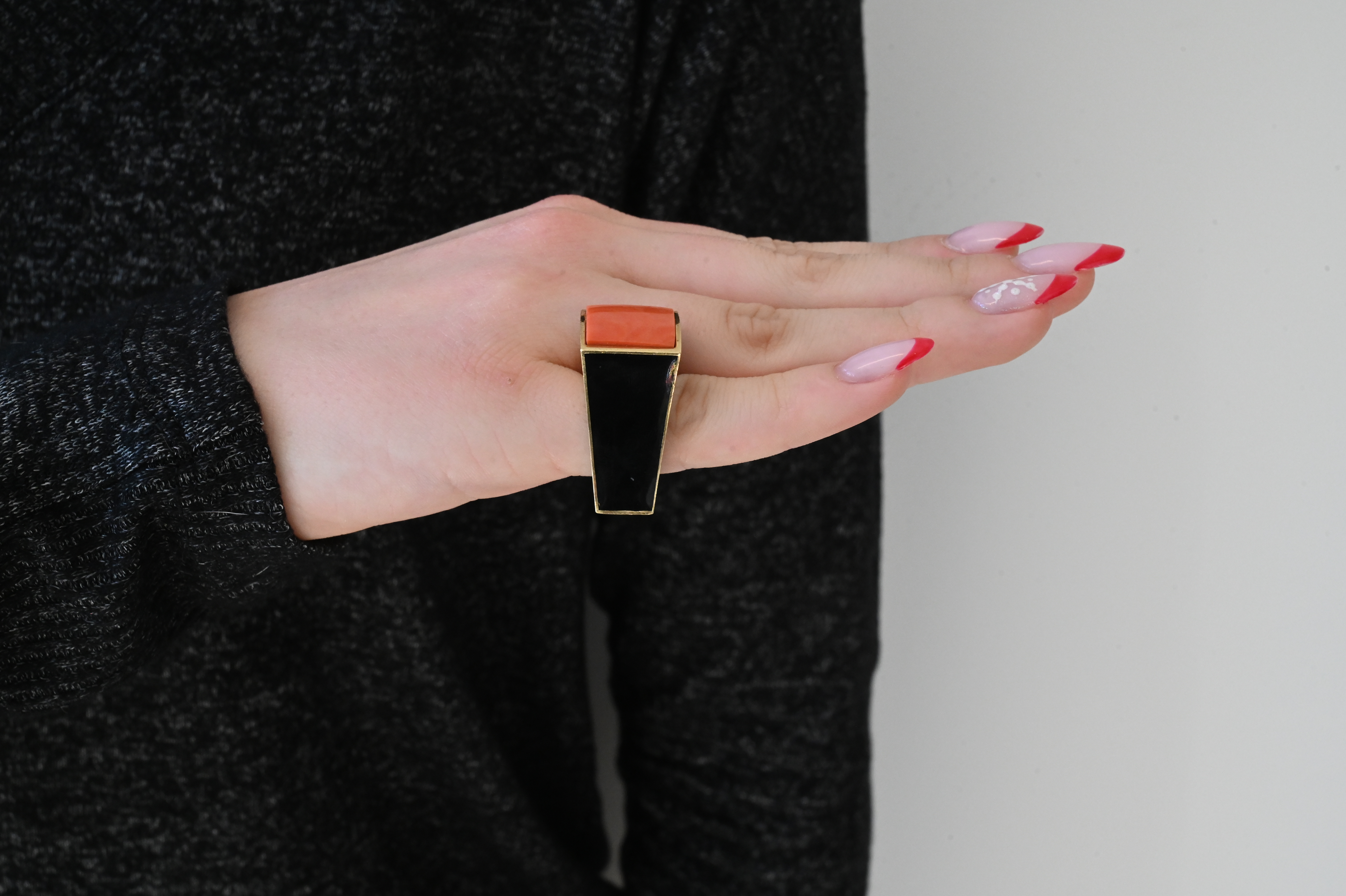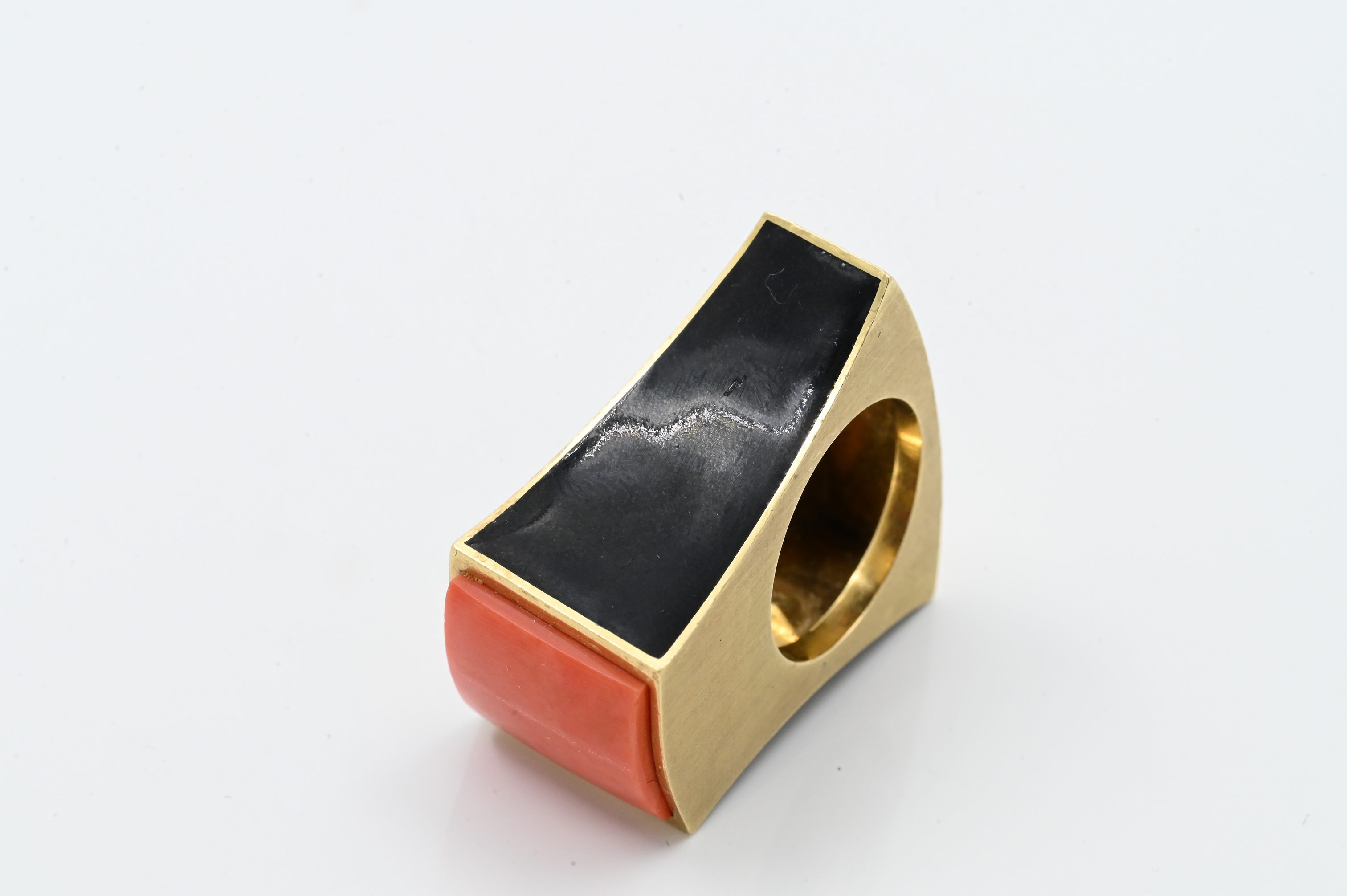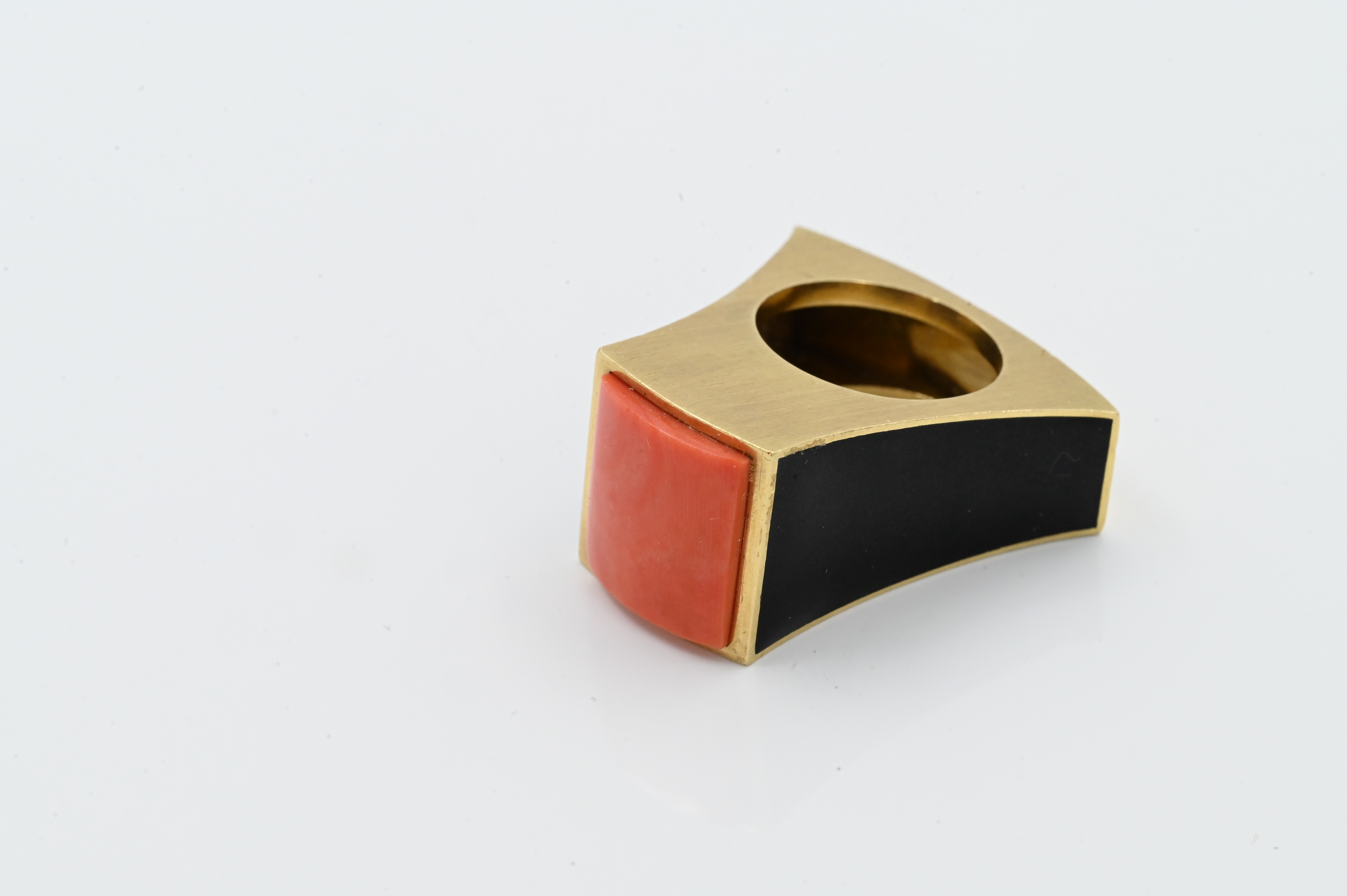 18K gold with brushed 18K gold, geometric deco design having coral on top, mark 18K Italy, maker’s mark on inside