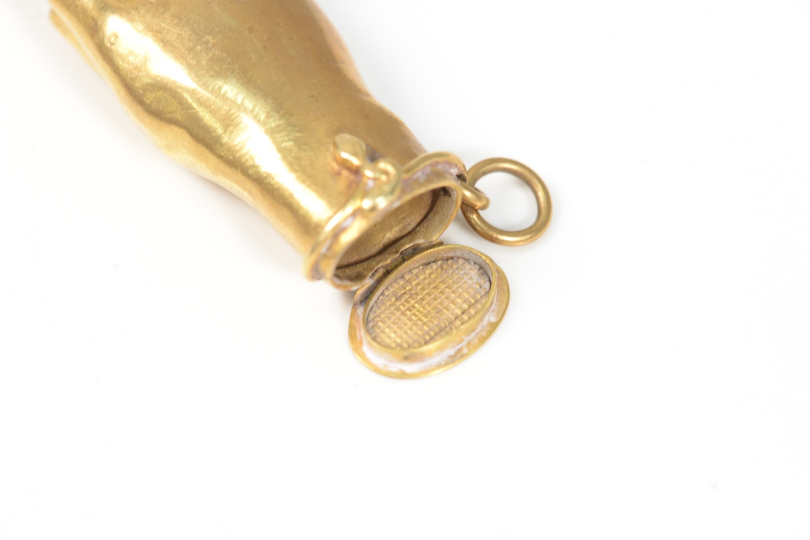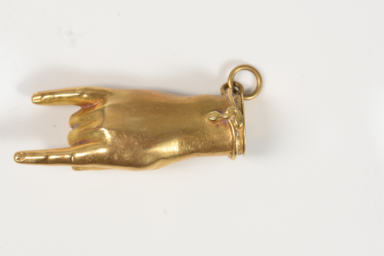 Lot 136: 18 Karat Gold Match Safe in form of hand with two raised fingers, striker on inside cover height 2 1/4 inches 17.5 grams