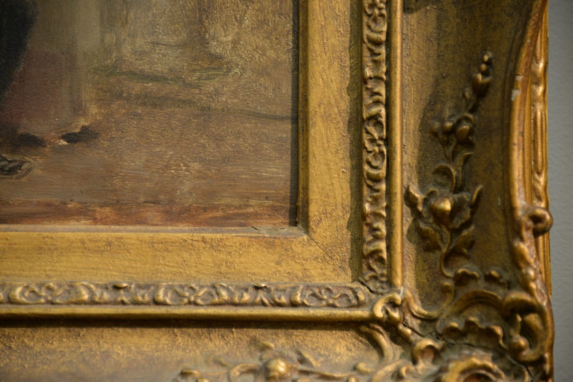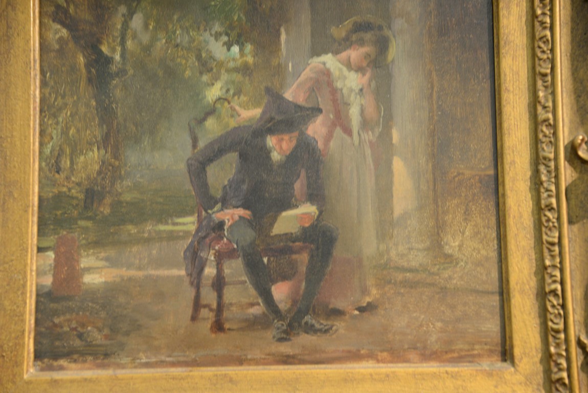 ATTRIBUTED TO MARCUS CLAYTON STONE 1840-1921 The Lads Letter oil on panel unsigned part of old paper label stating Sketch Marcus Stone in old faint writing on reverse 10 1/2 x 12 1/2