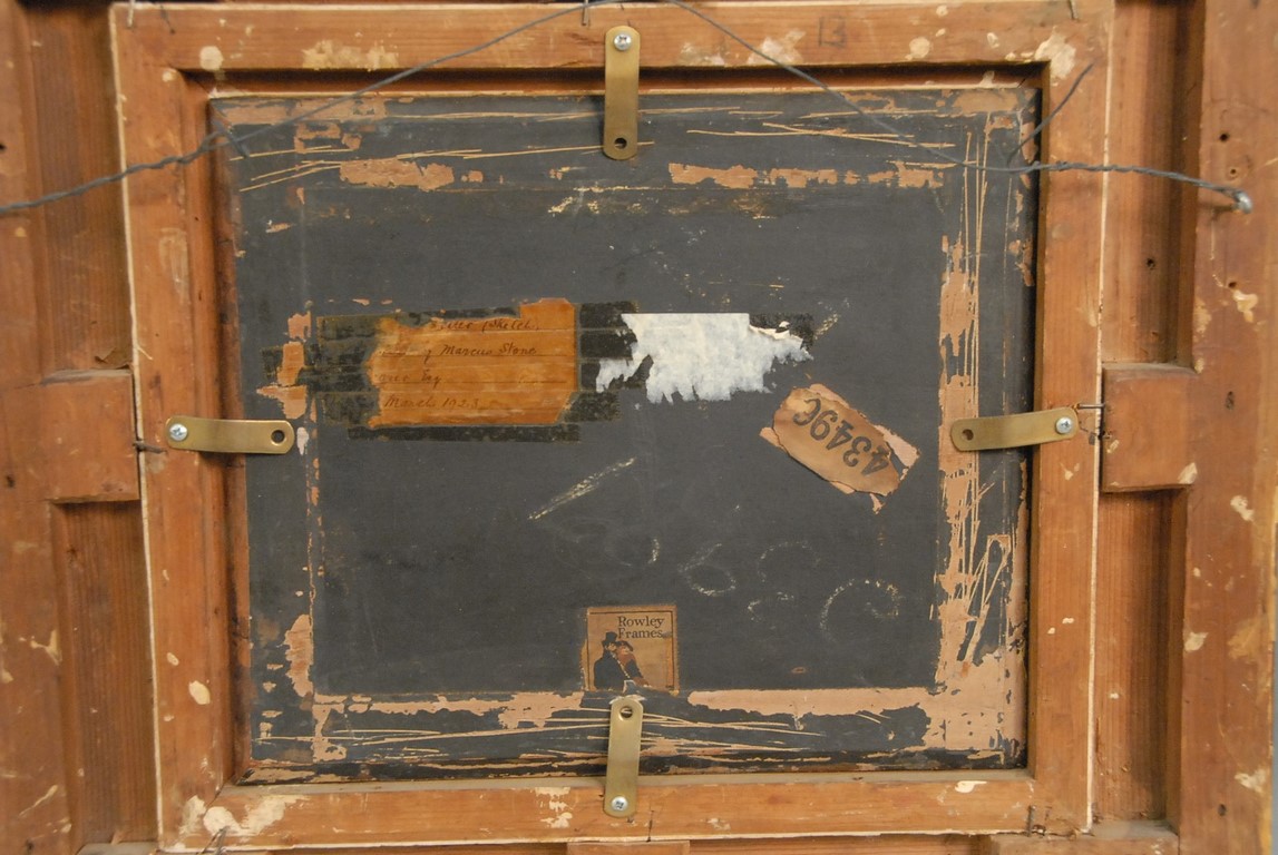Lot 136: ATTRIBUTED TO MARCUS CLAYTON STONE 1840-1921 The Lads Letter oil on panel unsigned part of old paper label stating Sketch Marcus Stone in old faint writing on reverse 10 1/2 x 12 1/2