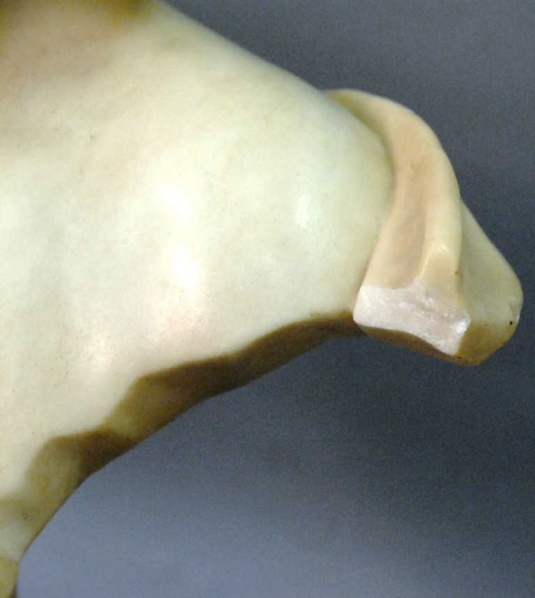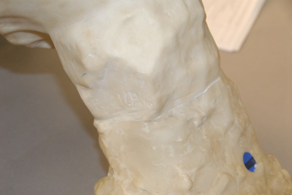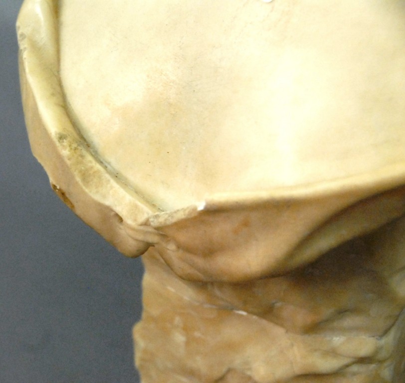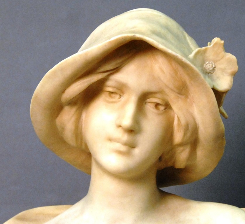 Carved alabaster bust of a young woman in a hat signed Prof. V. Porhis chip on right side. height 24in.