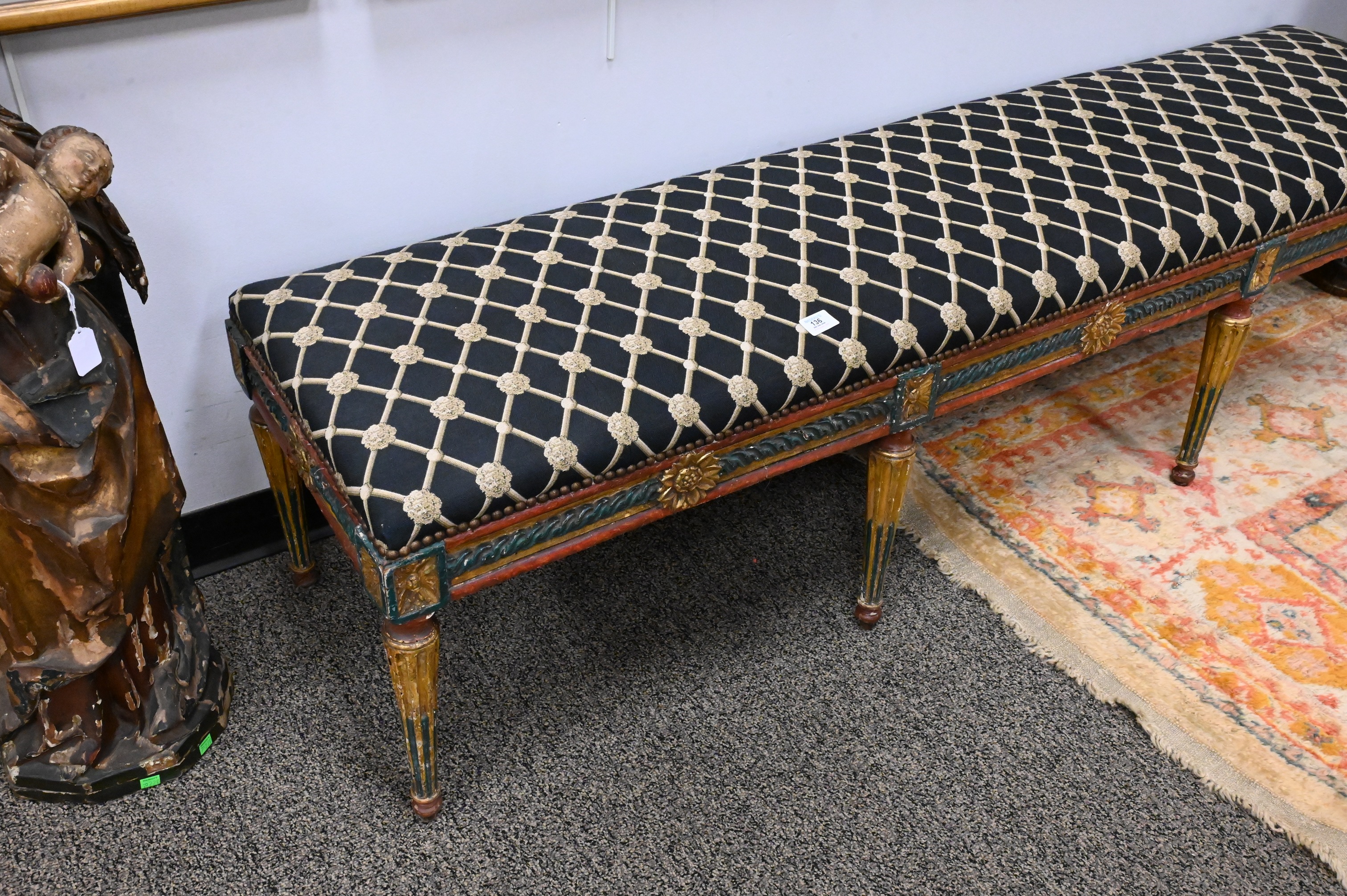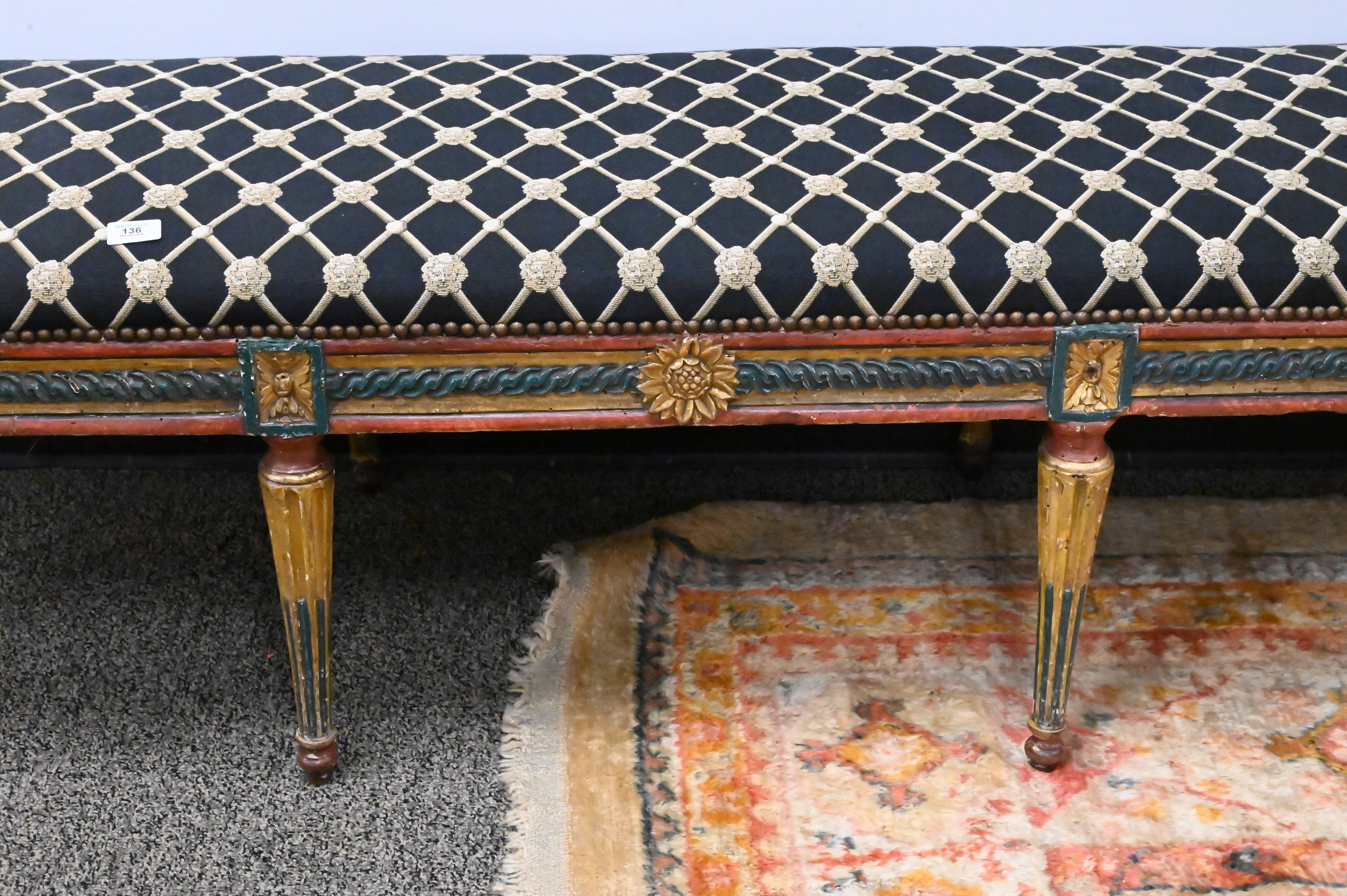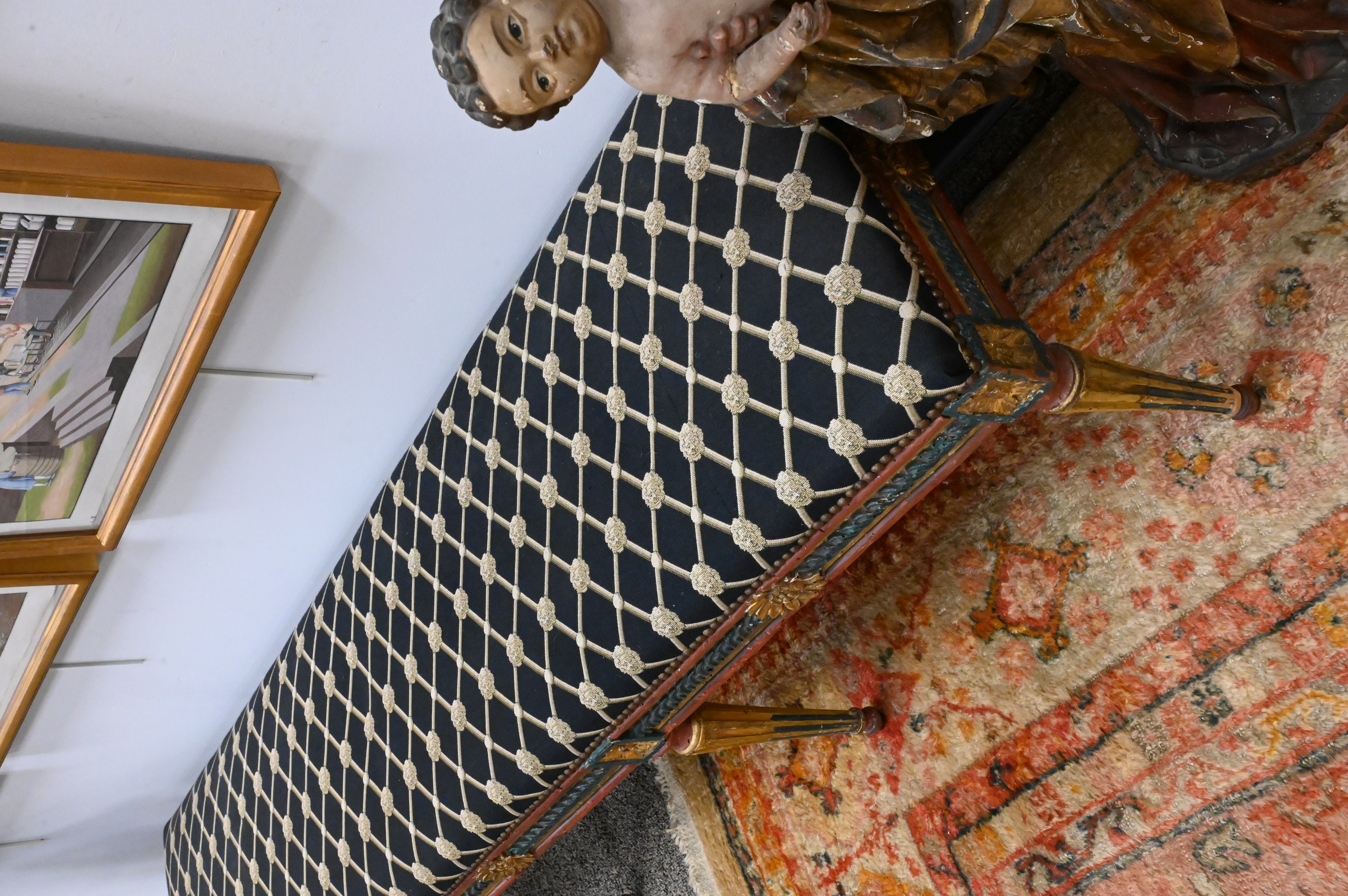 with rectangular seat upholstered in black diamond-pattern fabric with brass tacks, raised on fluted tapering legs with carved sunflower panels, rosettes, and acanthus details, retains traces of original polychrome and gilt decoration, 18th century