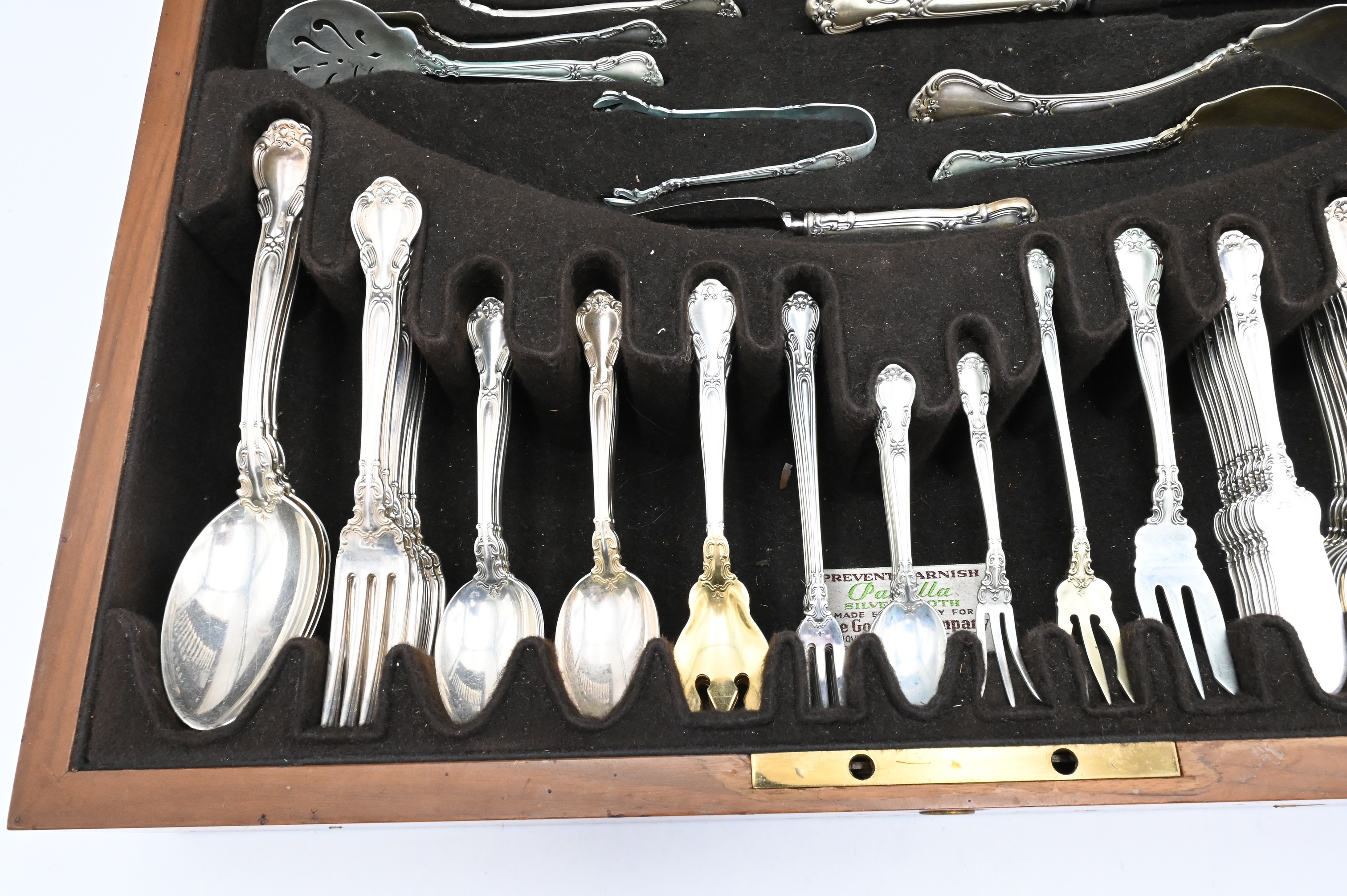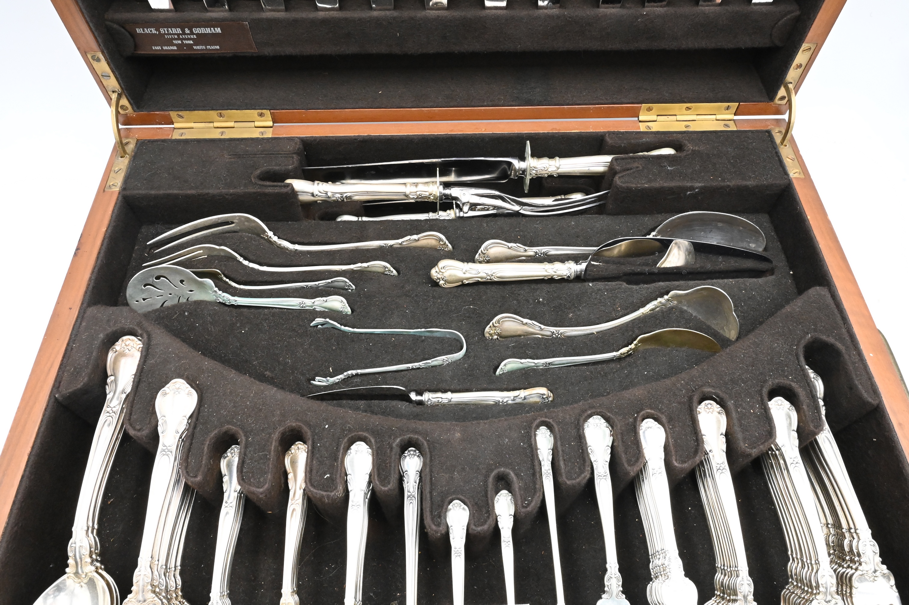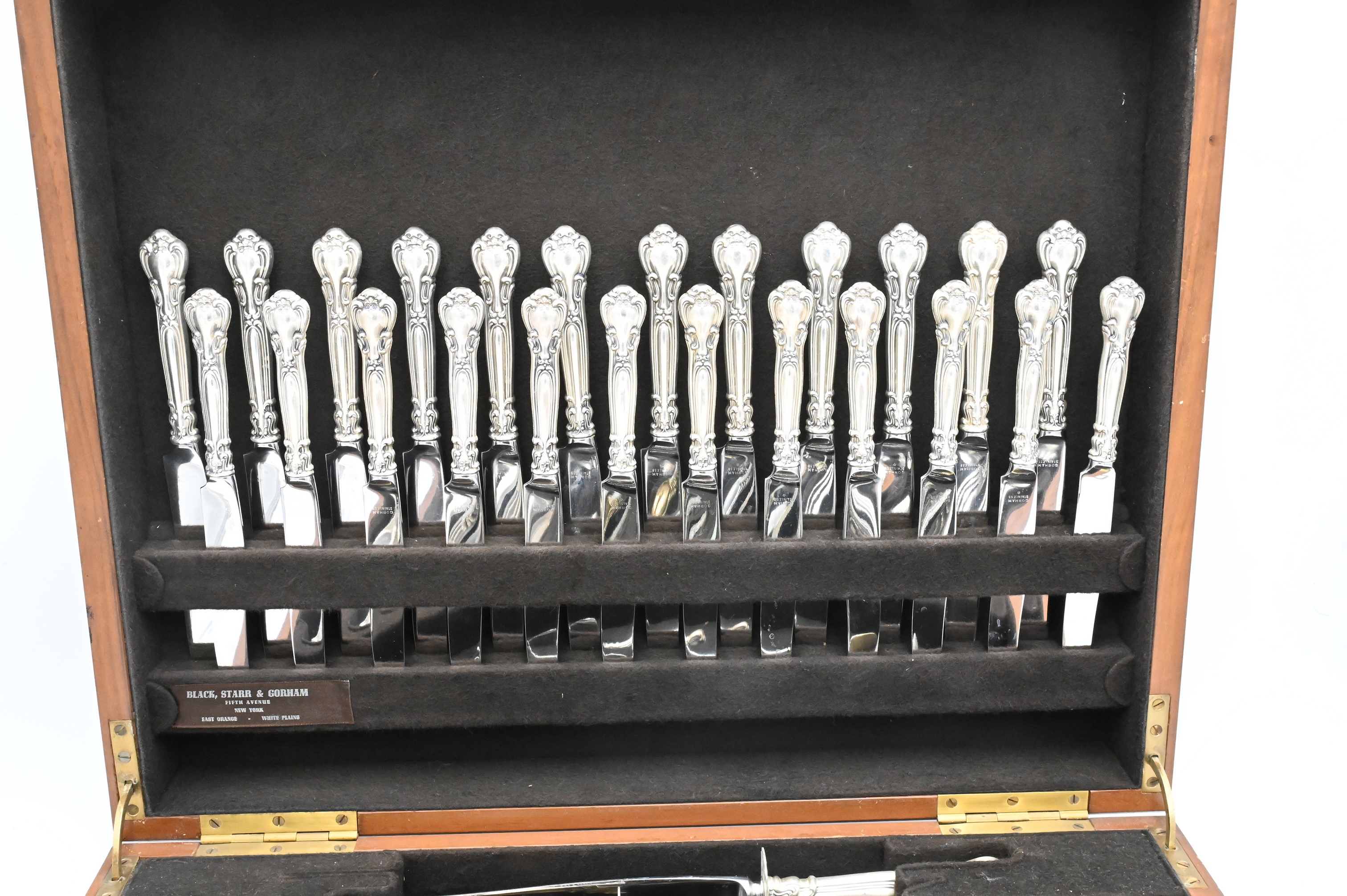 in custom fitted case, to include 10 dinner forks, 12 luncheon forks, 12 salad forks, 12 ice cream forks, one lemon fork, one cake/dessert fork, one olive/pickle fork, one large serving fork, one fish spoon, 12 cocktail forks, 11 soup spoons, 12 teaspoons, 12 demitasse spoons, one large serving spoon, three place spoons, one jelly spoon, one ladle, one tong, 12 dinner knives, 12 luncheon knives, 12 butter knives, one slotted server, one sugar spoon, one cheese server, one cake server, one steak carver, one steak fork, one roast carver, one roast fork, all marked for Gorham