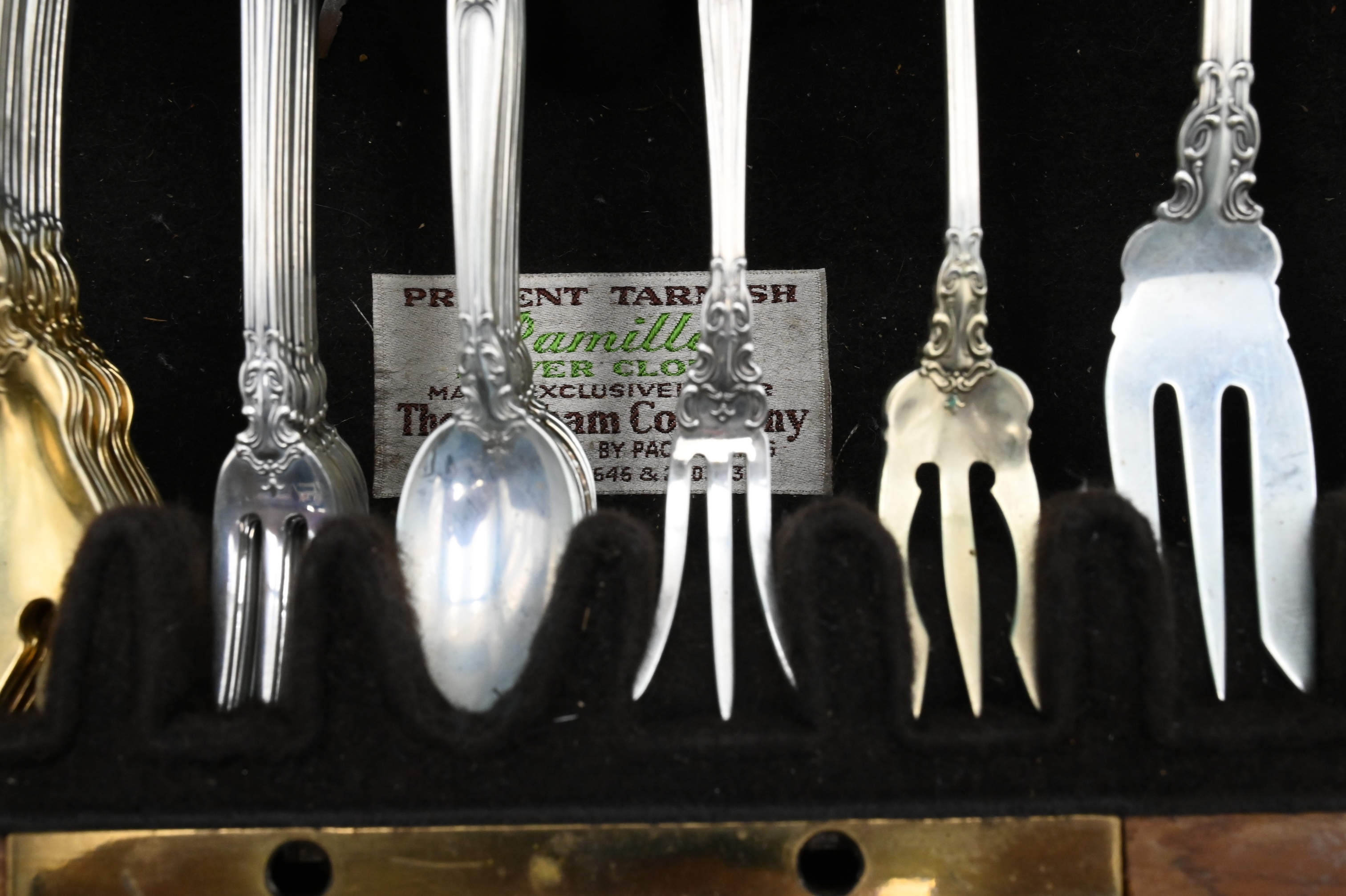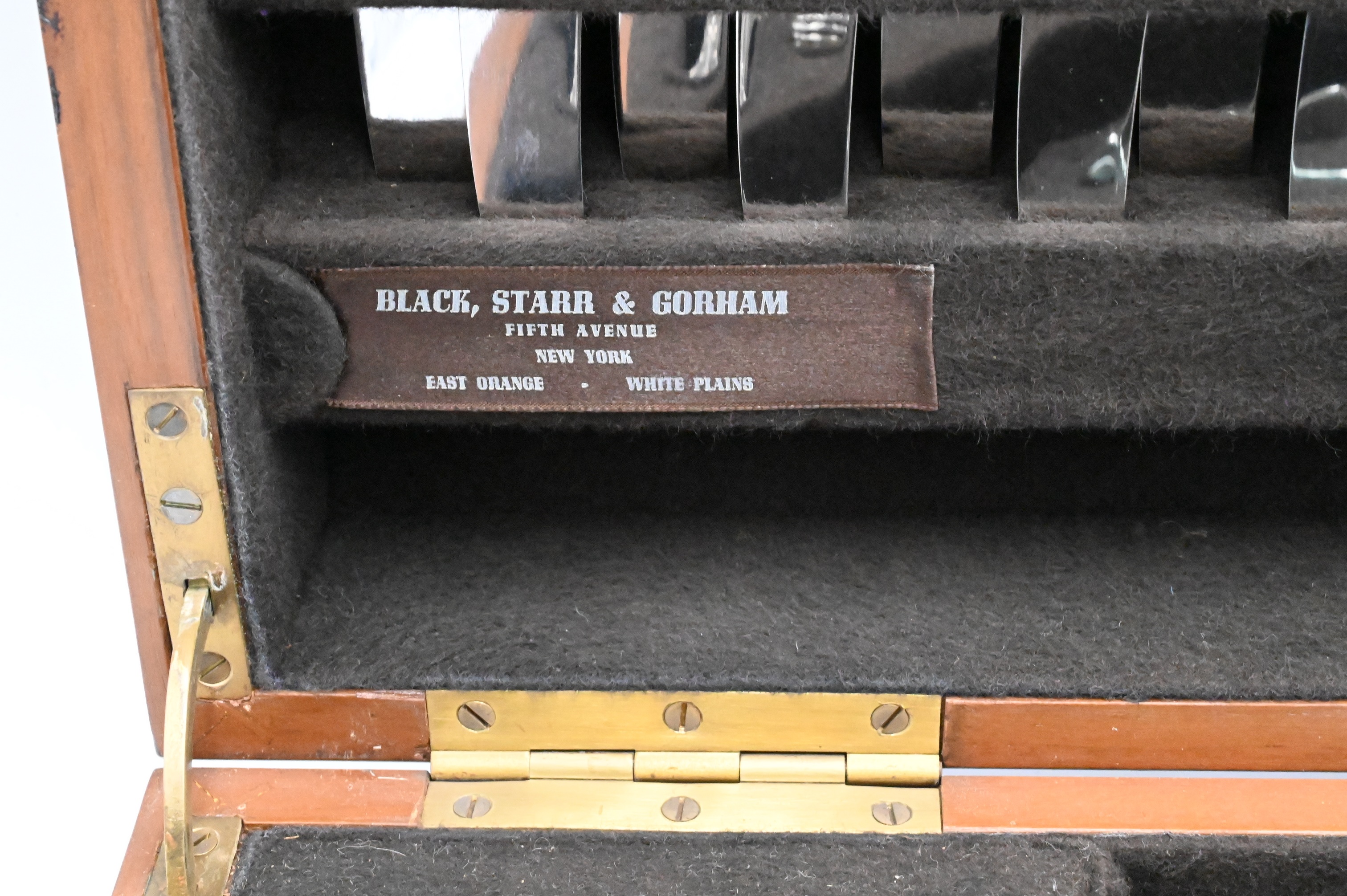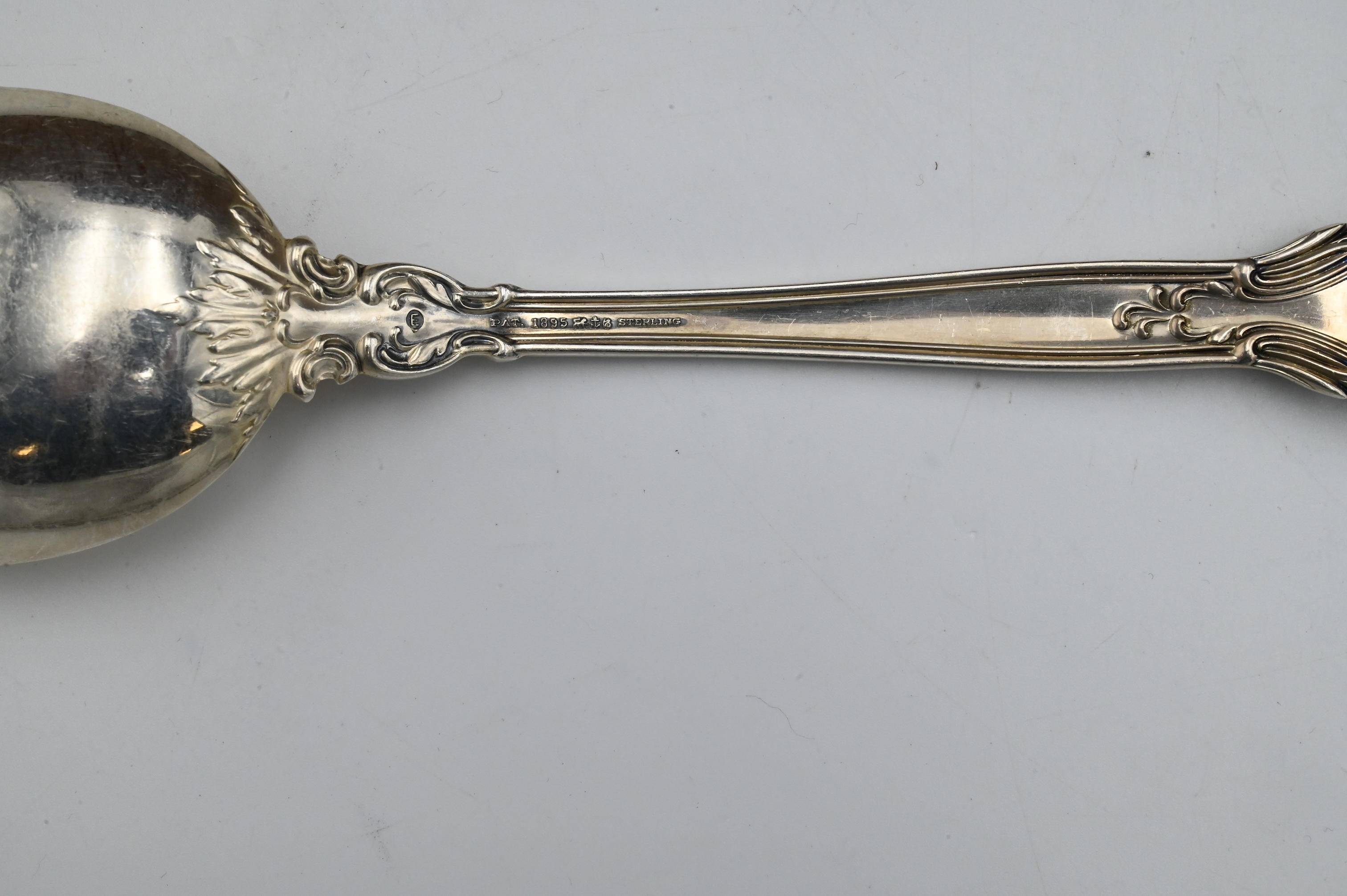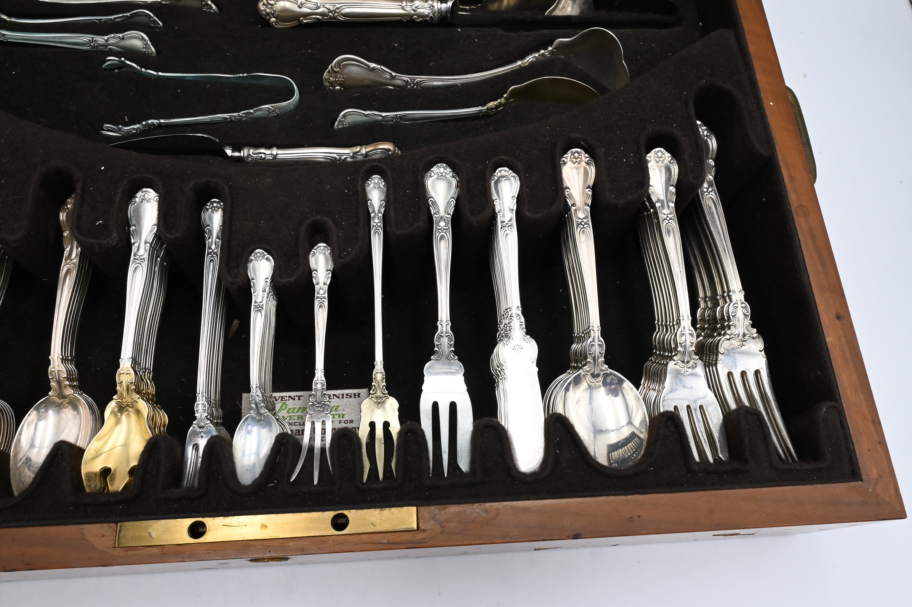 in custom fitted case, to include 10 dinner forks, 12 luncheon forks, 12 salad forks, 12 ice cream forks, one lemon fork, one cake/dessert fork, one olive/pickle fork, one large serving fork, one fish spoon, 12 cocktail forks, 11 soup spoons, 12 teaspoons, 12 demitasse spoons, one large serving spoon, three place spoons, one jelly spoon, one ladle, one tong, 12 dinner knives, 12 luncheon knives, 12 butter knives, one slotted server, one sugar spoon, one cheese server, one cake server, one steak carver, one steak fork, one roast carver, one roast fork, all marked for Gorham