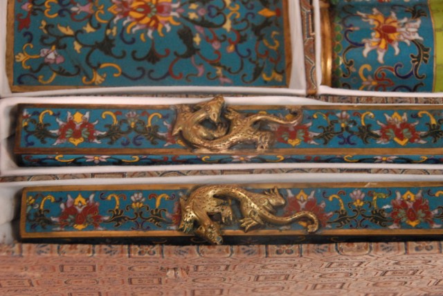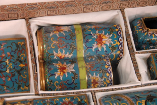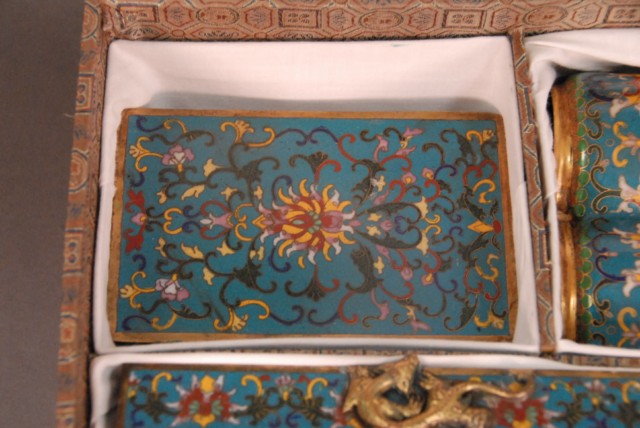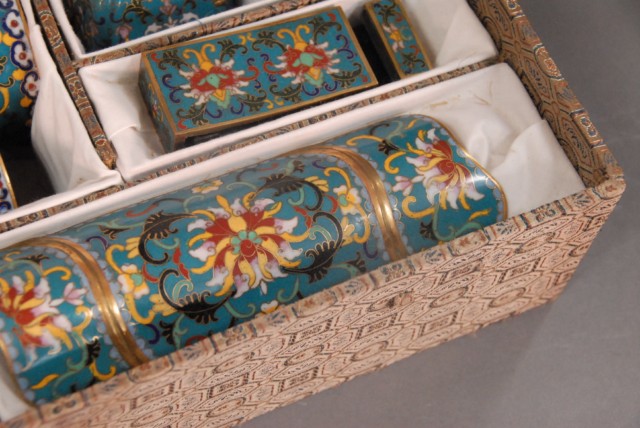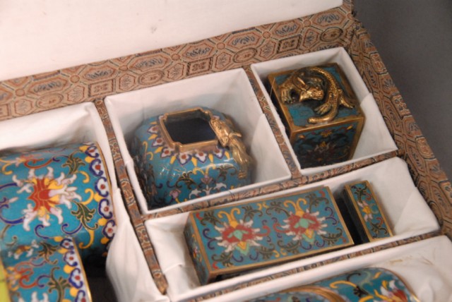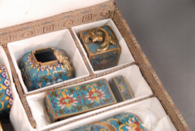 Group lot of cloisonn, 8 pieces in fitted box, 18 – 19th century Porcelain shell ink pot with seal mark on bottom