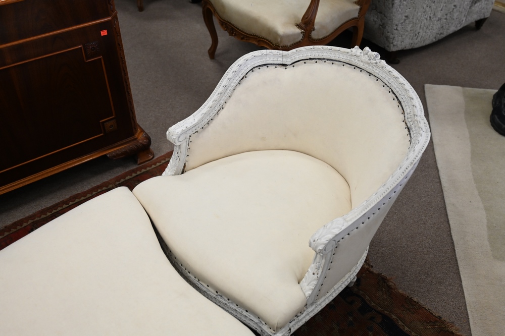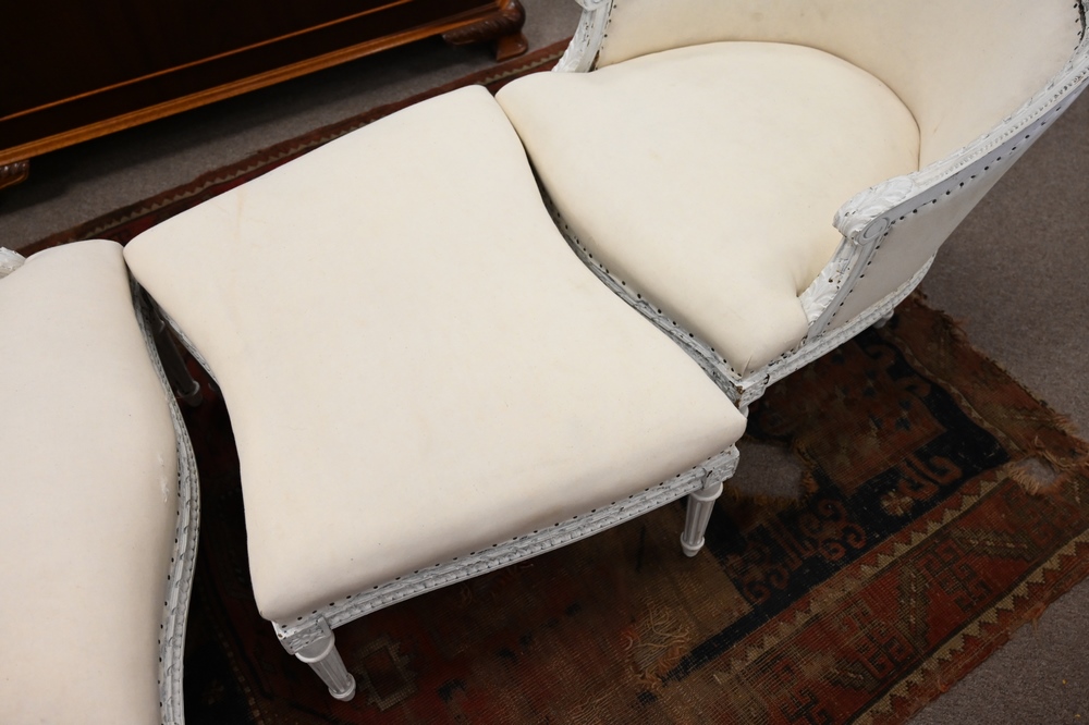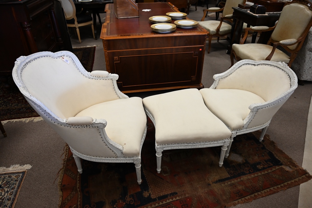 Lot 136: Louis XVI Style Three Part Lounge, in need of upholstery, height 34 inches, total length 76 inches.